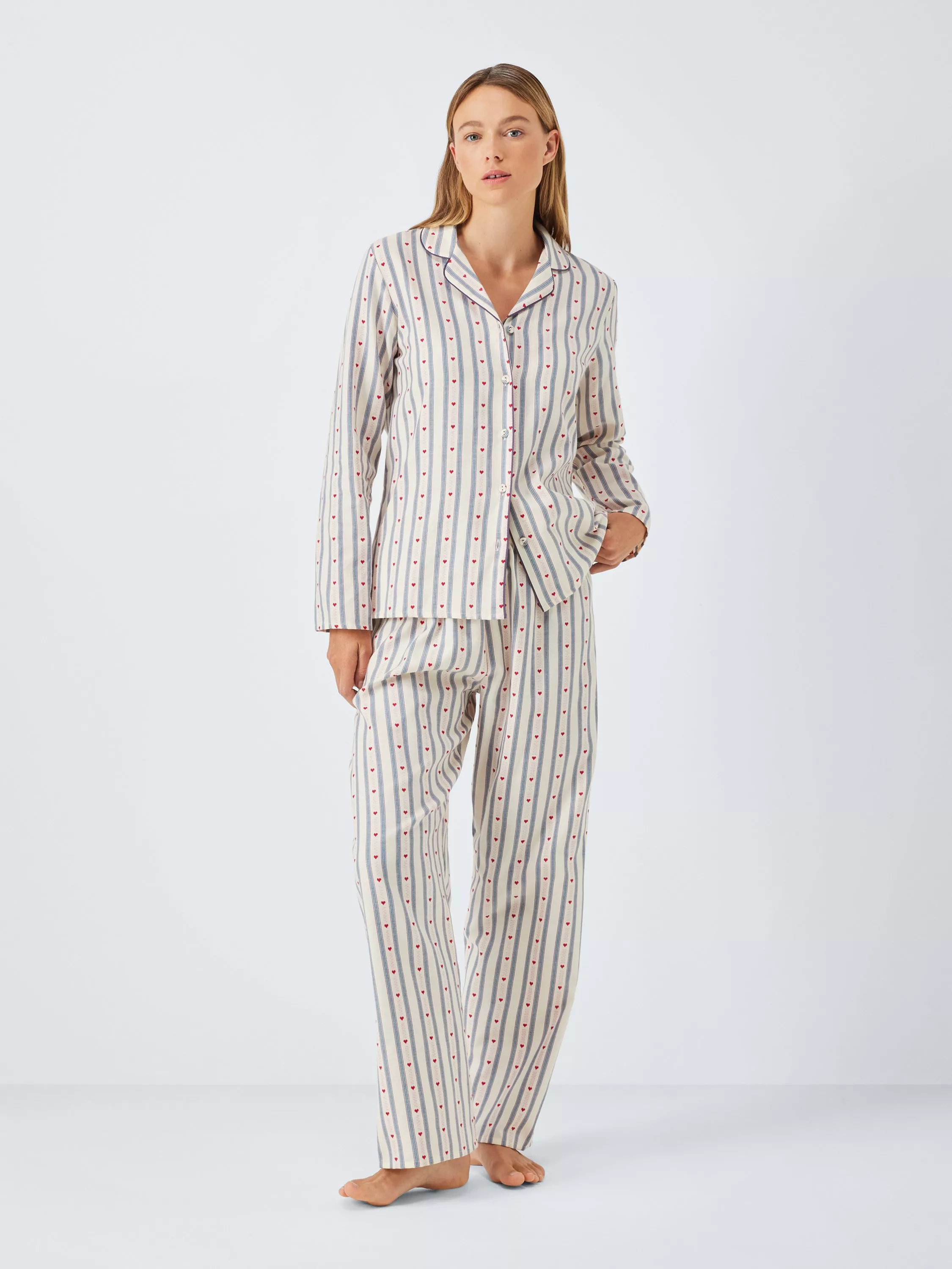 Add some vintage vibes to your PJ drawer with this pure cotton set in a jacquard heart stripe. The shirt has a smart, revere collar and fabric covered buttons whilst the bottoms feature a comfy, fully elasticated waistband.