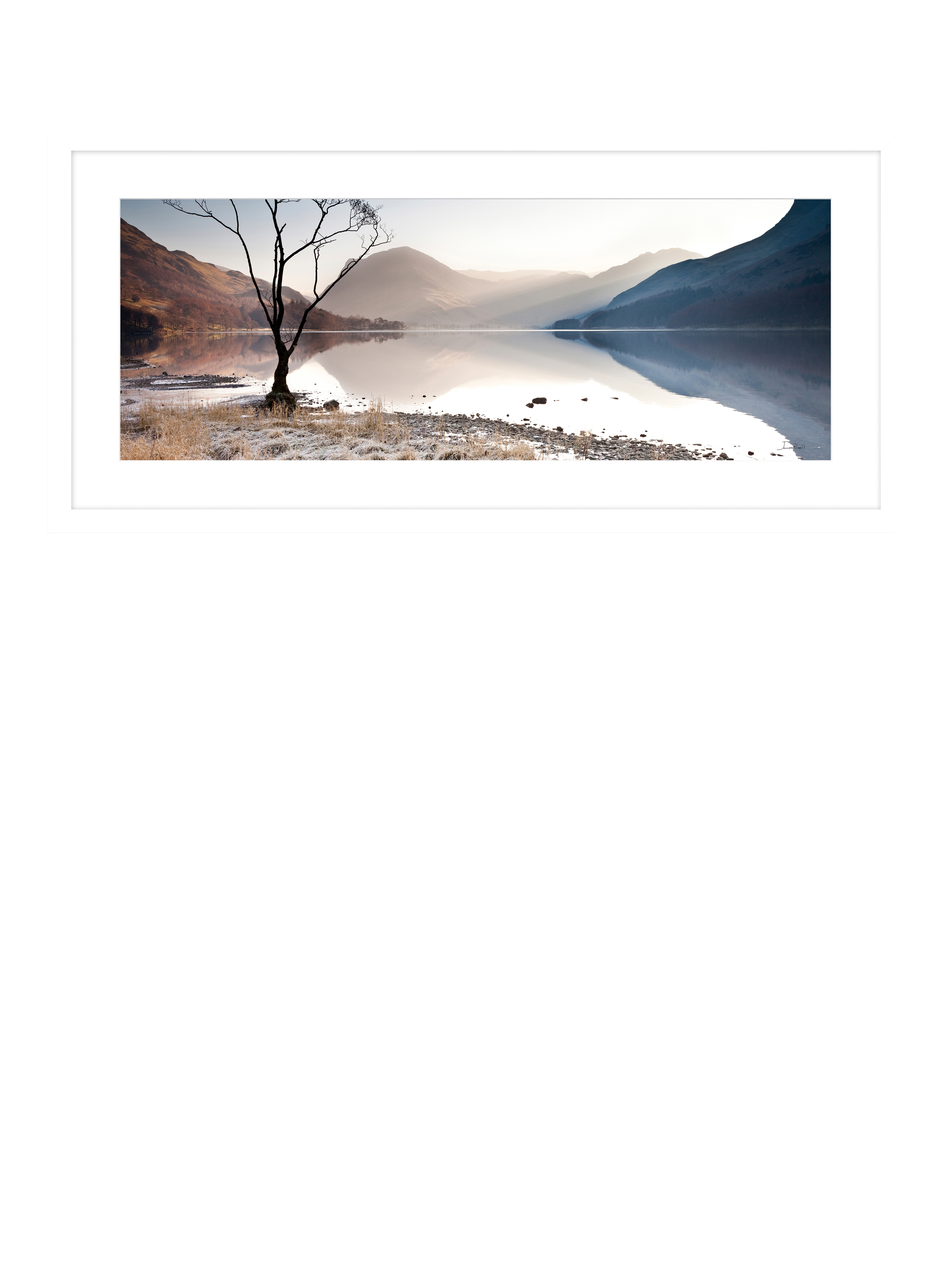 A solo tree in silhouette lends perspective to the reflected scenery of England's Lake Buttermere in this work by photographer James Bell. Presented in a window mount and a white frame, ready to hang on your wall.