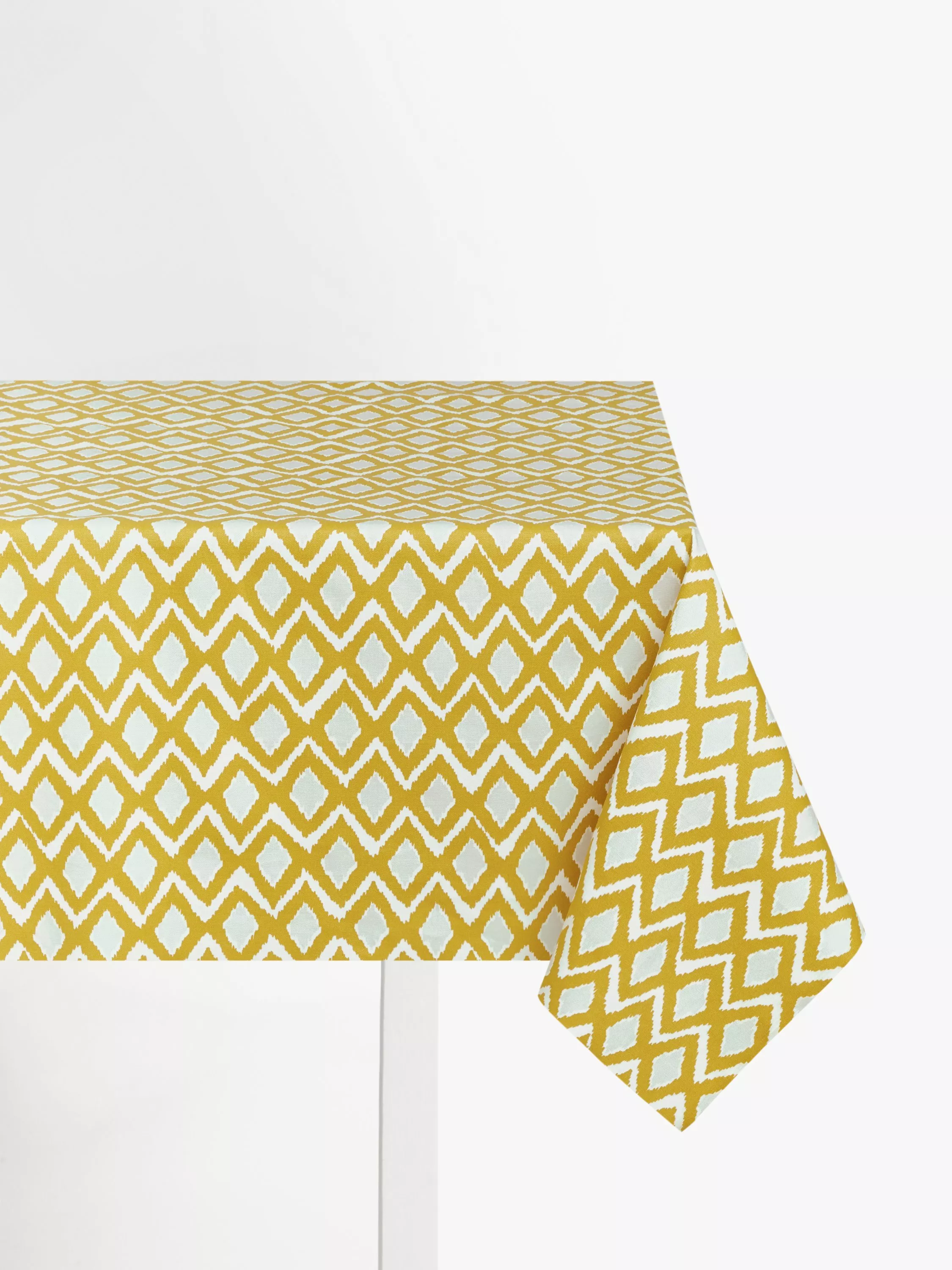 This fabric is ideal for use as a tablecloth as spills and mess can easily be cleaned with a damp cloth. If any liquids are spilt, it's a good idea to clean up straight away using a blotting action, as this is the most effective way to prevent the stain from seeping into the fabric. Daylight will also help minimise the look of any residual marks. Finally, be cautious of excessive heat which can damage the coating and look of the fabric. Always protect the tablecloth by using placemats and coasters.