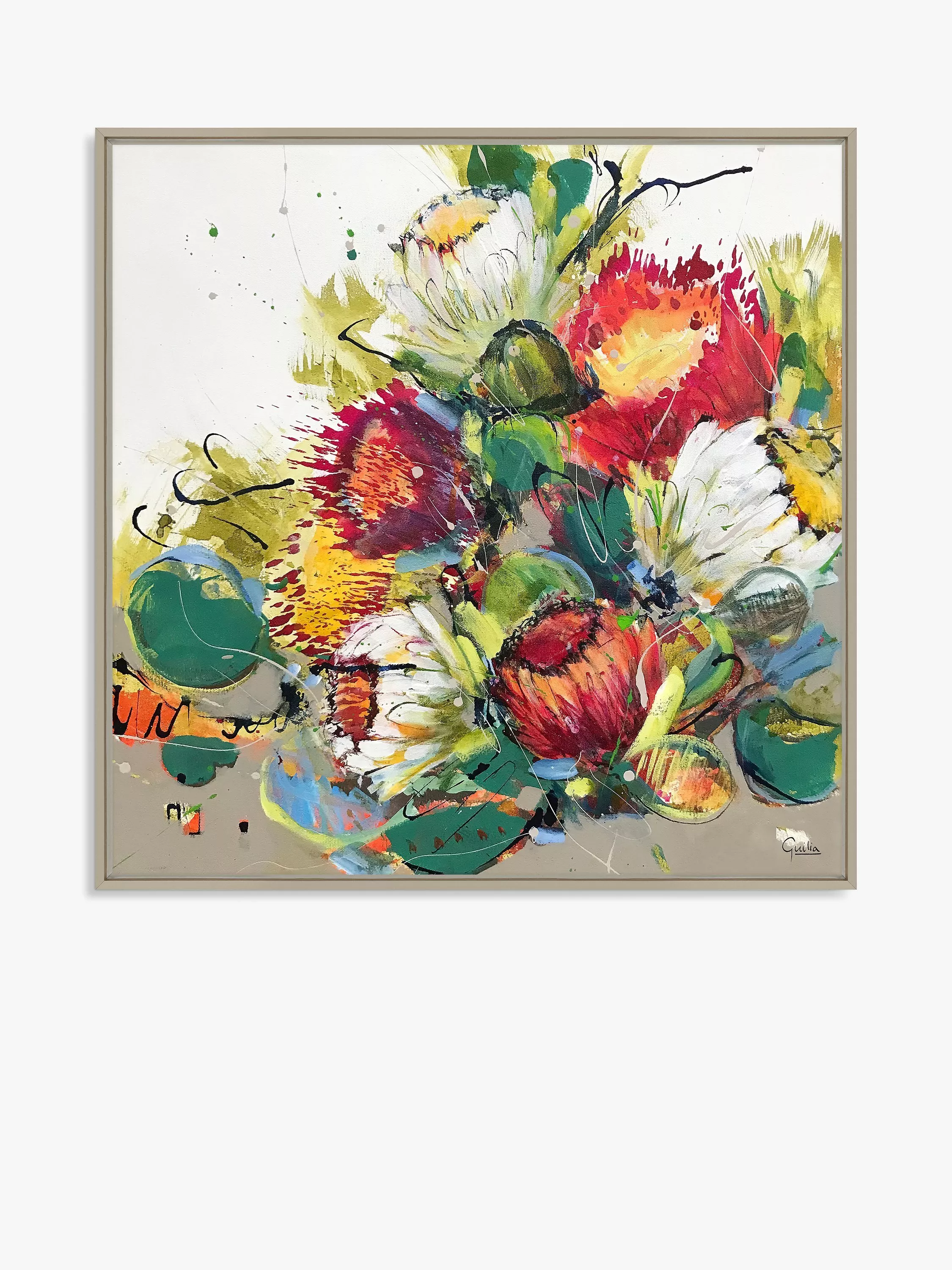 Colourful floral canvas print by Julia Forman. Made in the UK, this unglazed print is float-mounted and framed, ready to hang on your wall.