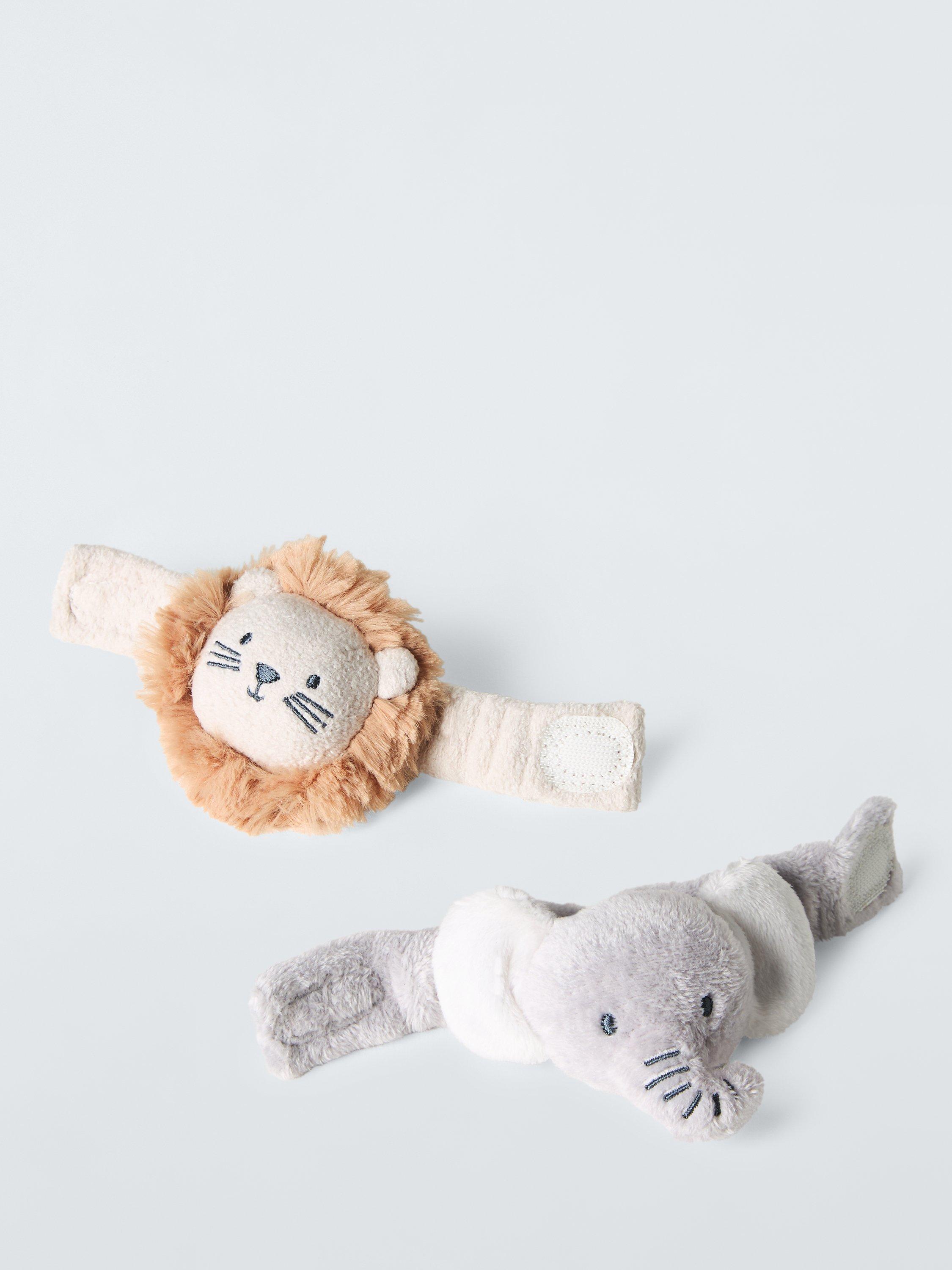 Develop a baby's fascination with the Lion and Elephant Wrist Rattles. The sweet lion and elephant faces will delight babies, while the gentle rattle will engage their hearing for a sensory experience. Made from soft fabrics, they are gentle on delicate skin and are easy to attach to wrists thanks to the baby-safe rip-tape fastening.
