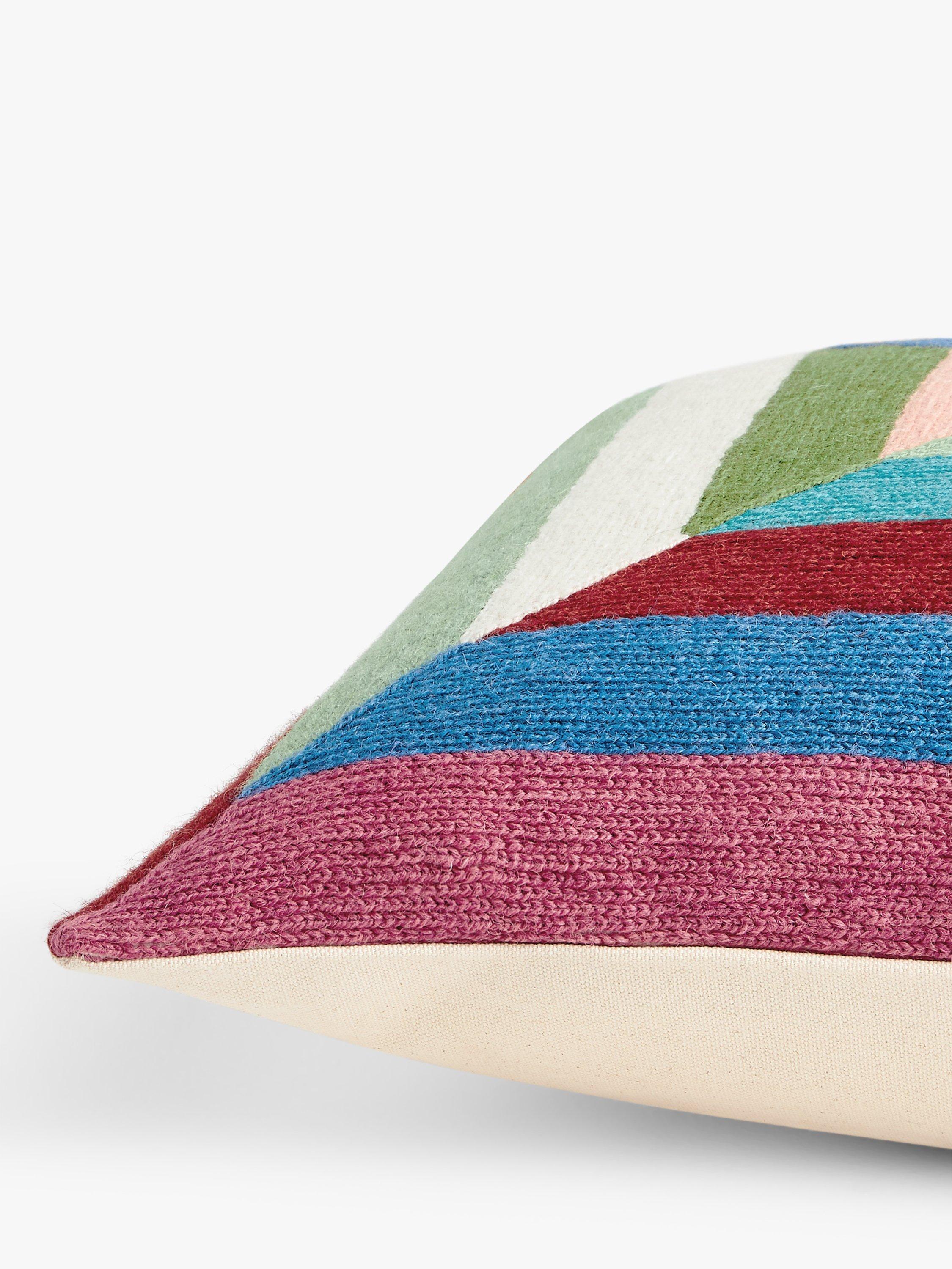 A cushion hand embroidered with a kaleidoscope of coloured blocks in wool thread. The reverse is plain.