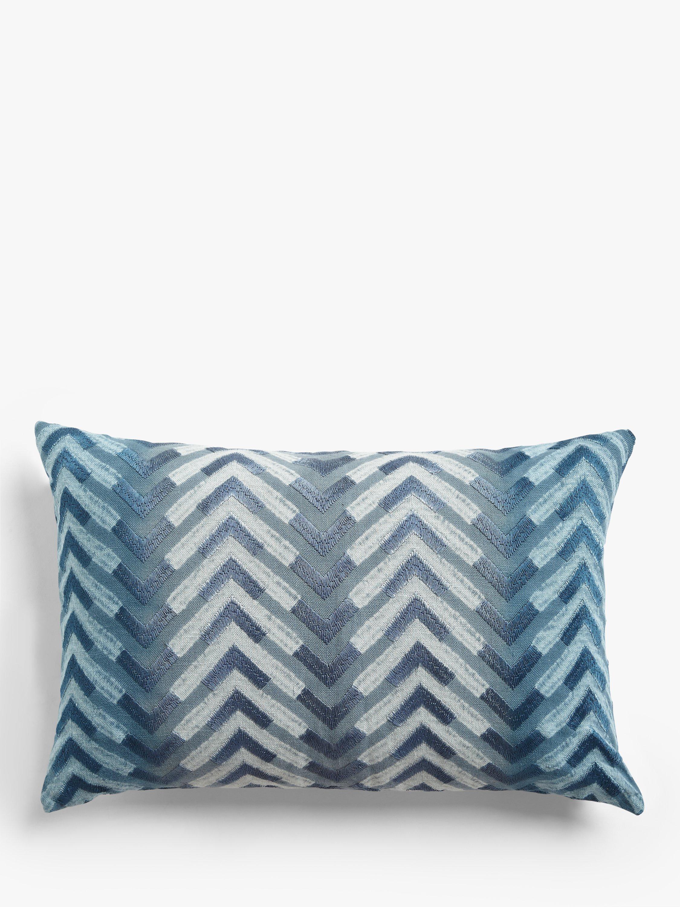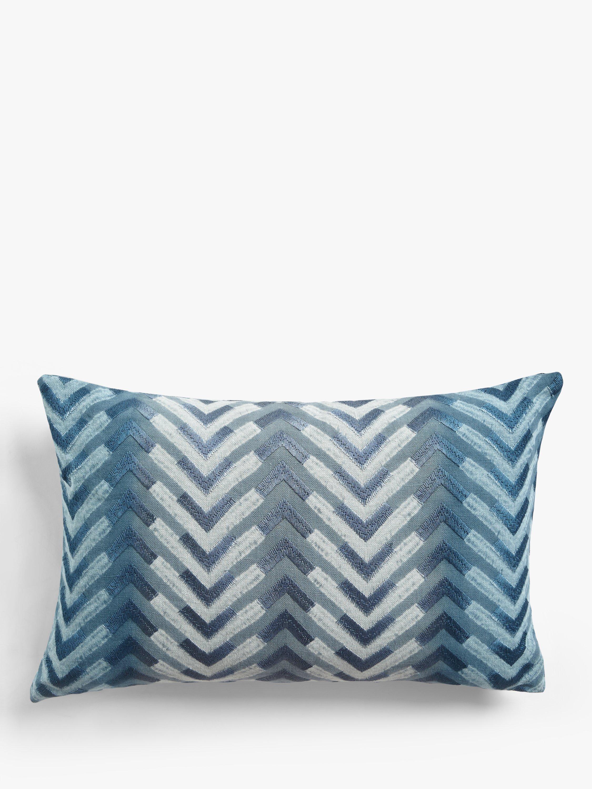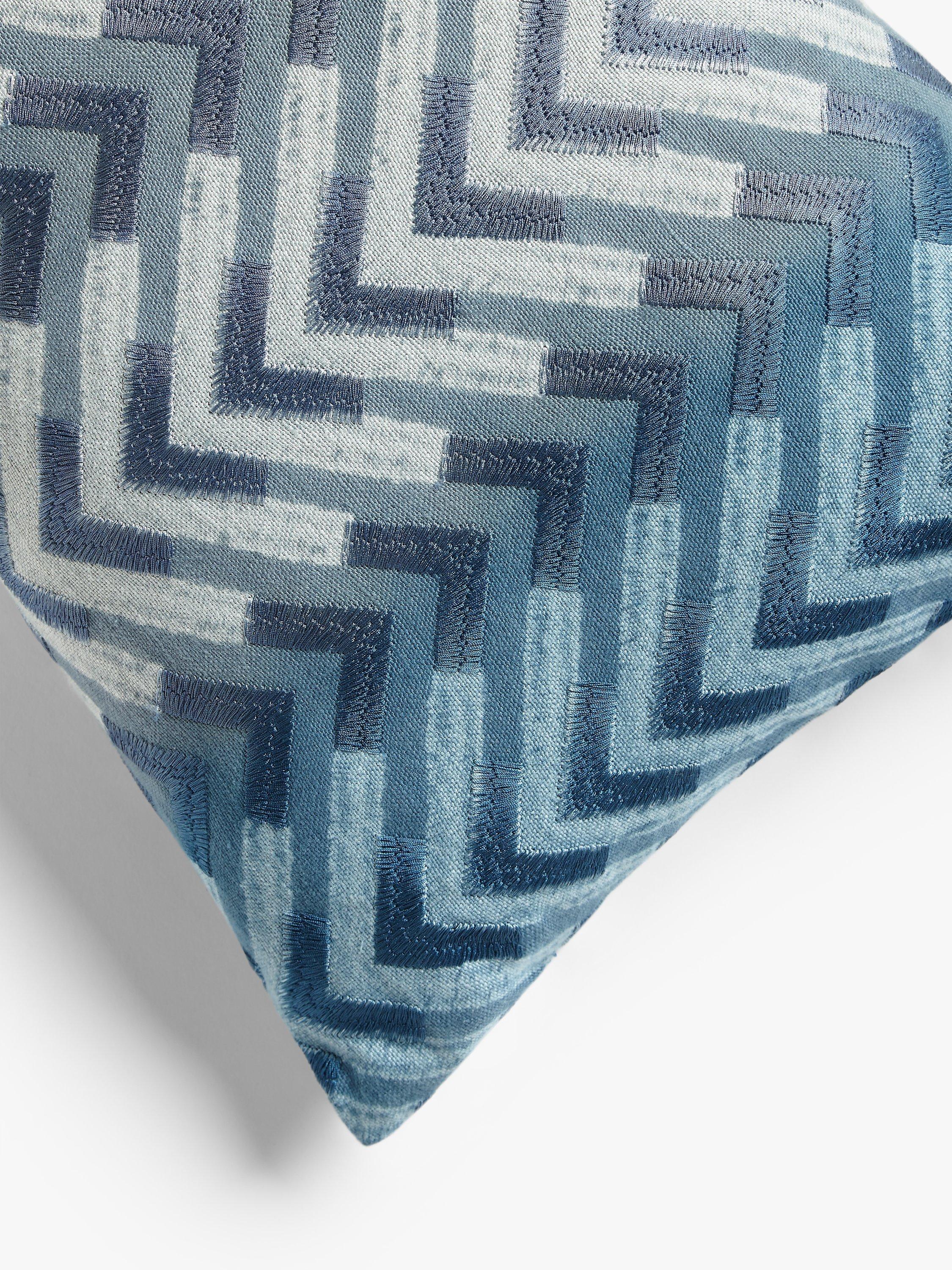 A woven cushion, with dyed and machine embroidered chevrons for pattern and texture.