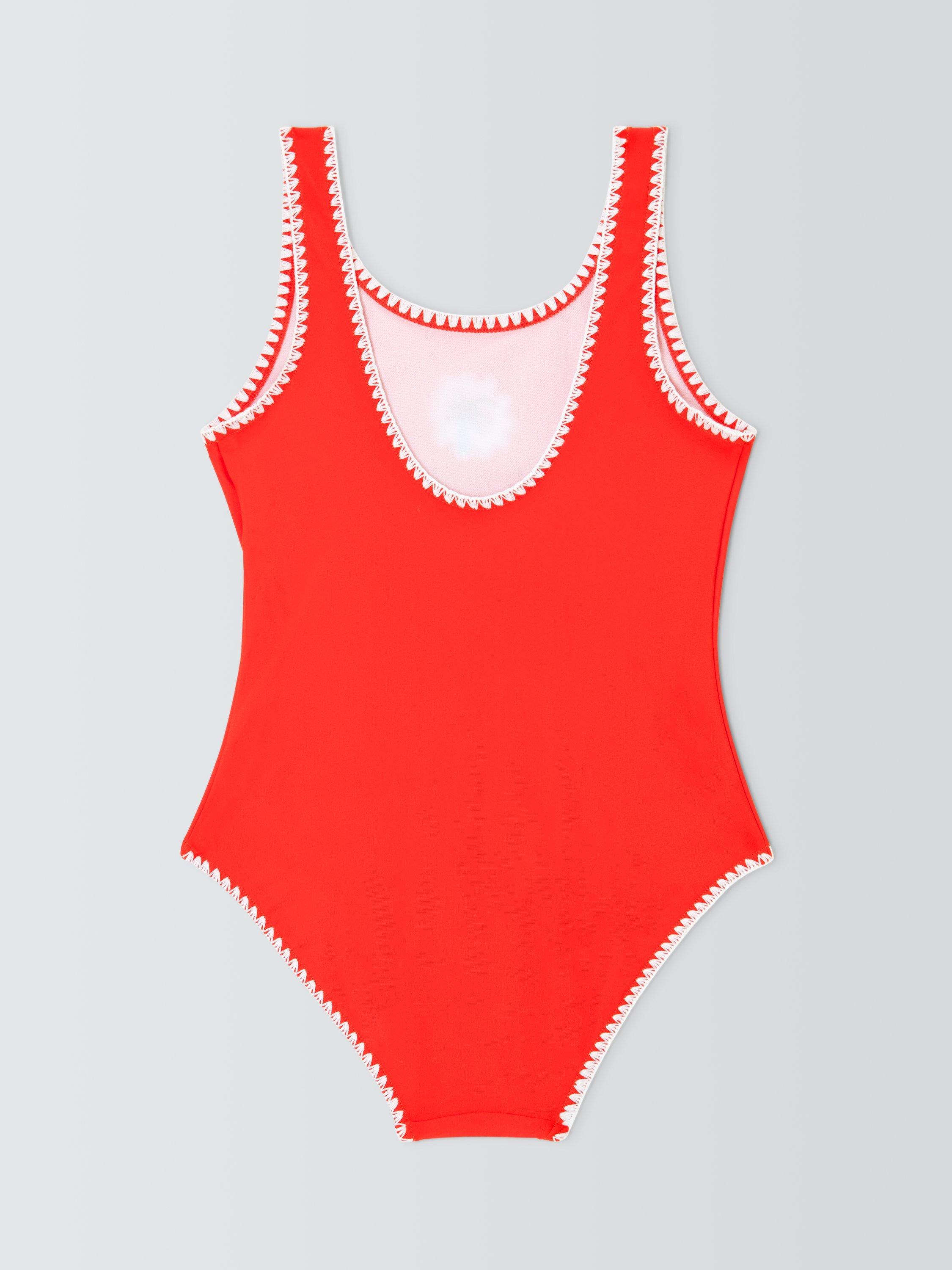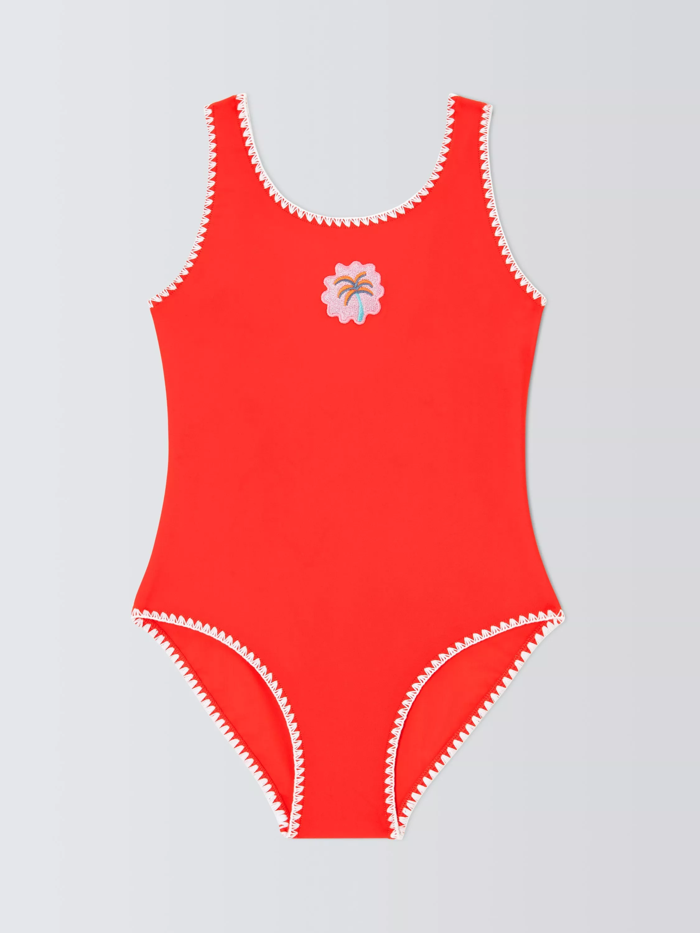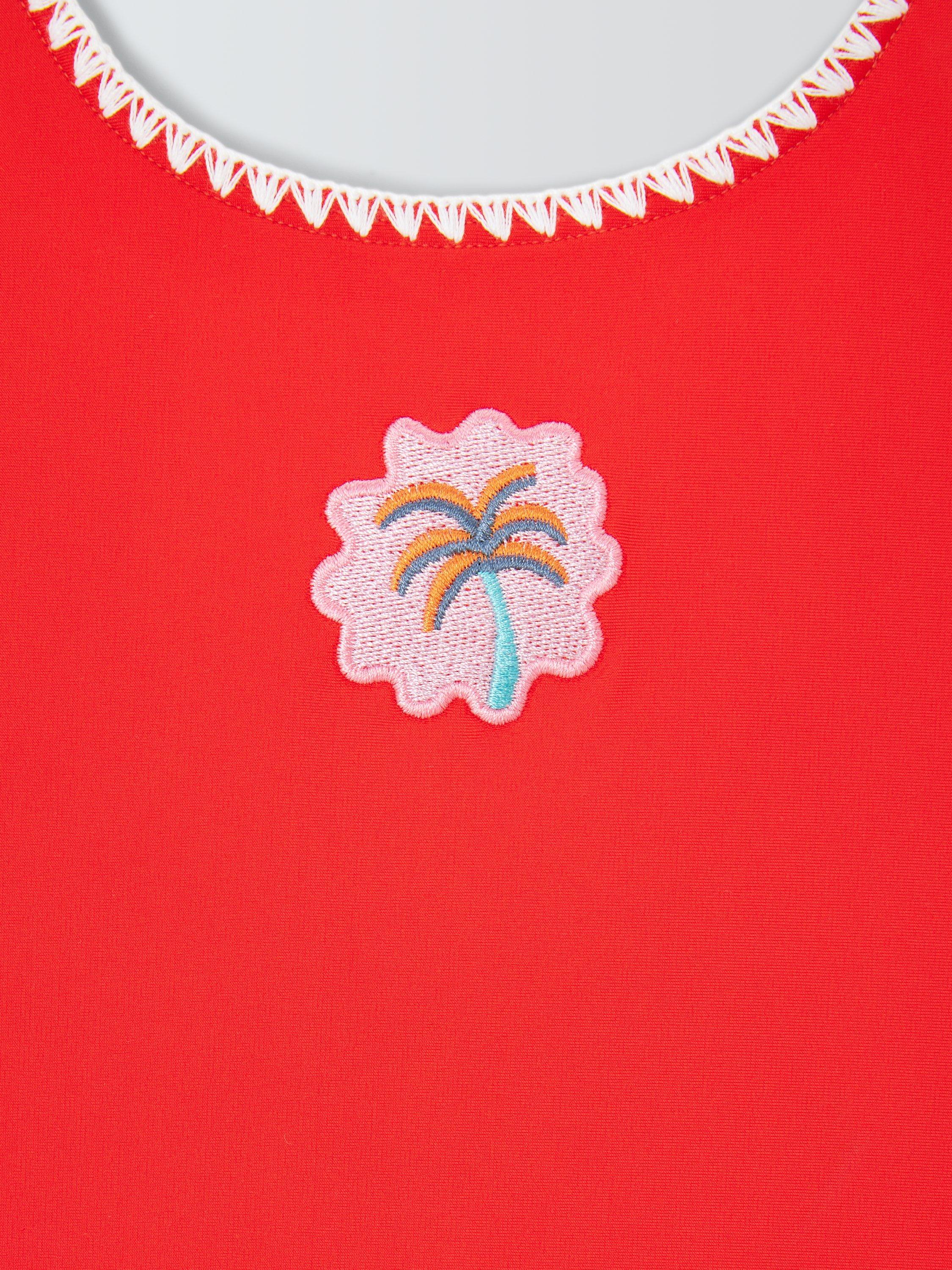 A classic-shaped swimsuit, with decorative trim and centre palm tree badge.