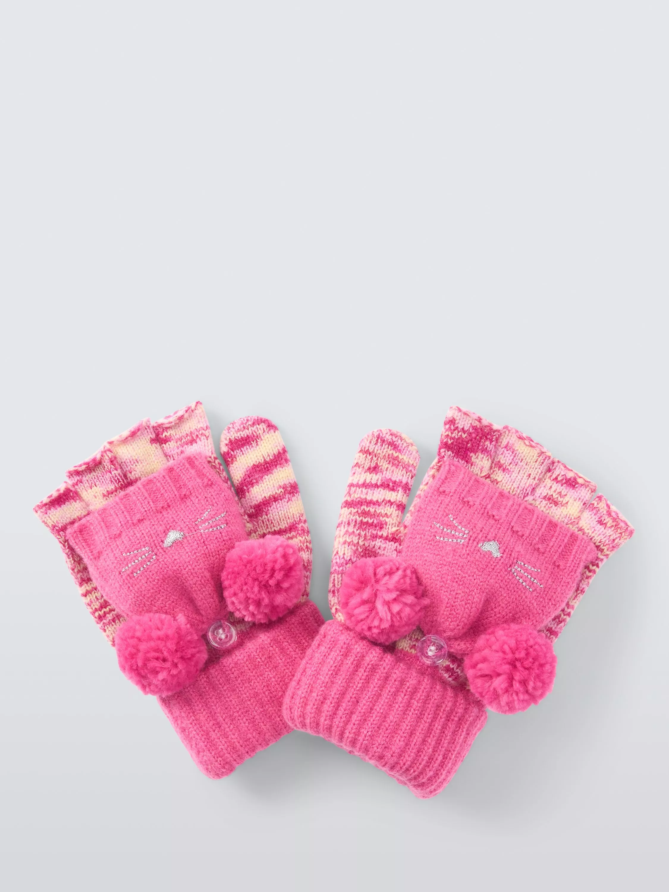 Flip top gloves with pom poms and whiskers embroidery. Other matching accessories are available.