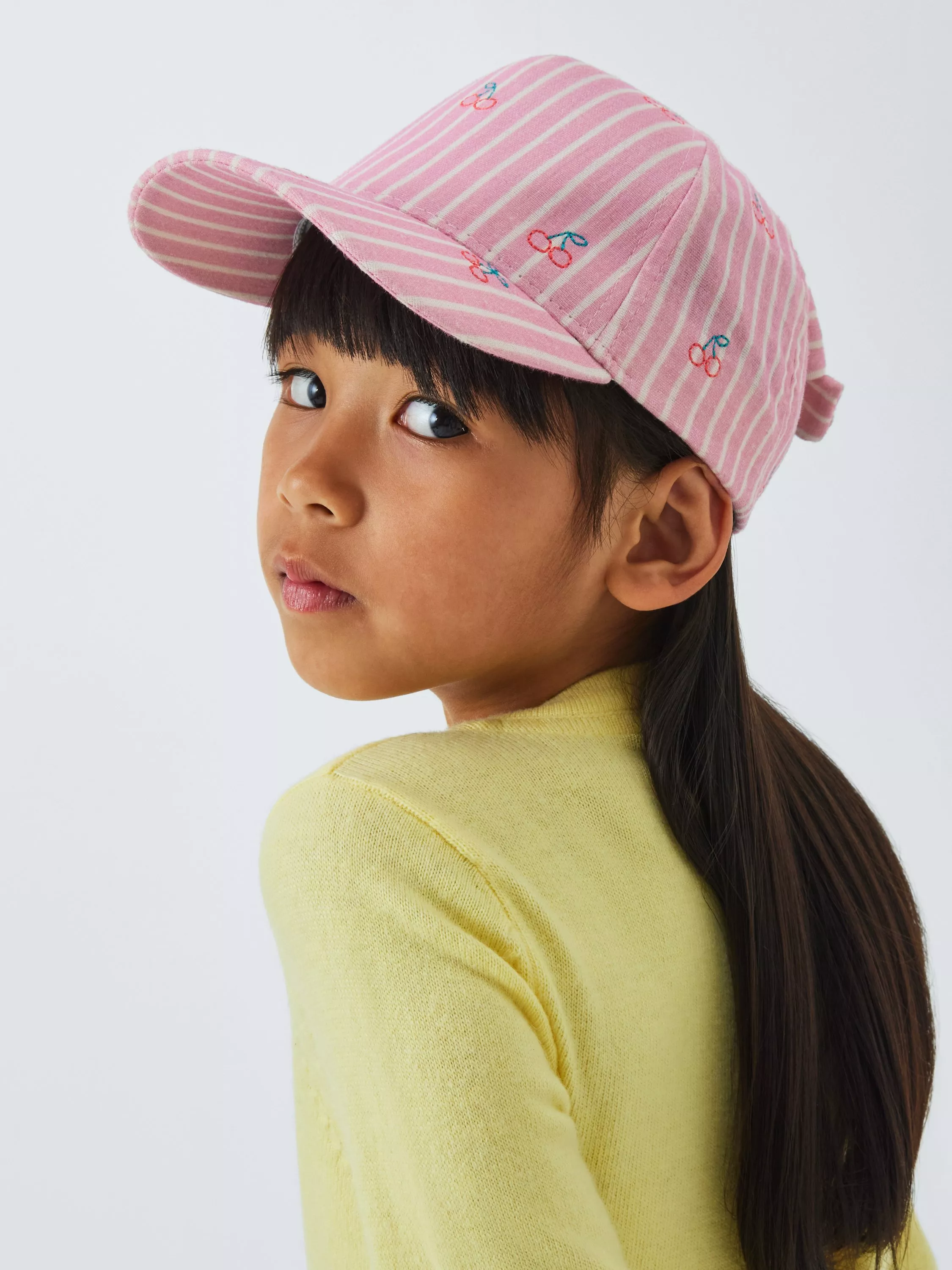 Stay sun safe with this cute cotton baseball cap. It features a cherry print and adorable bow accent at the back.