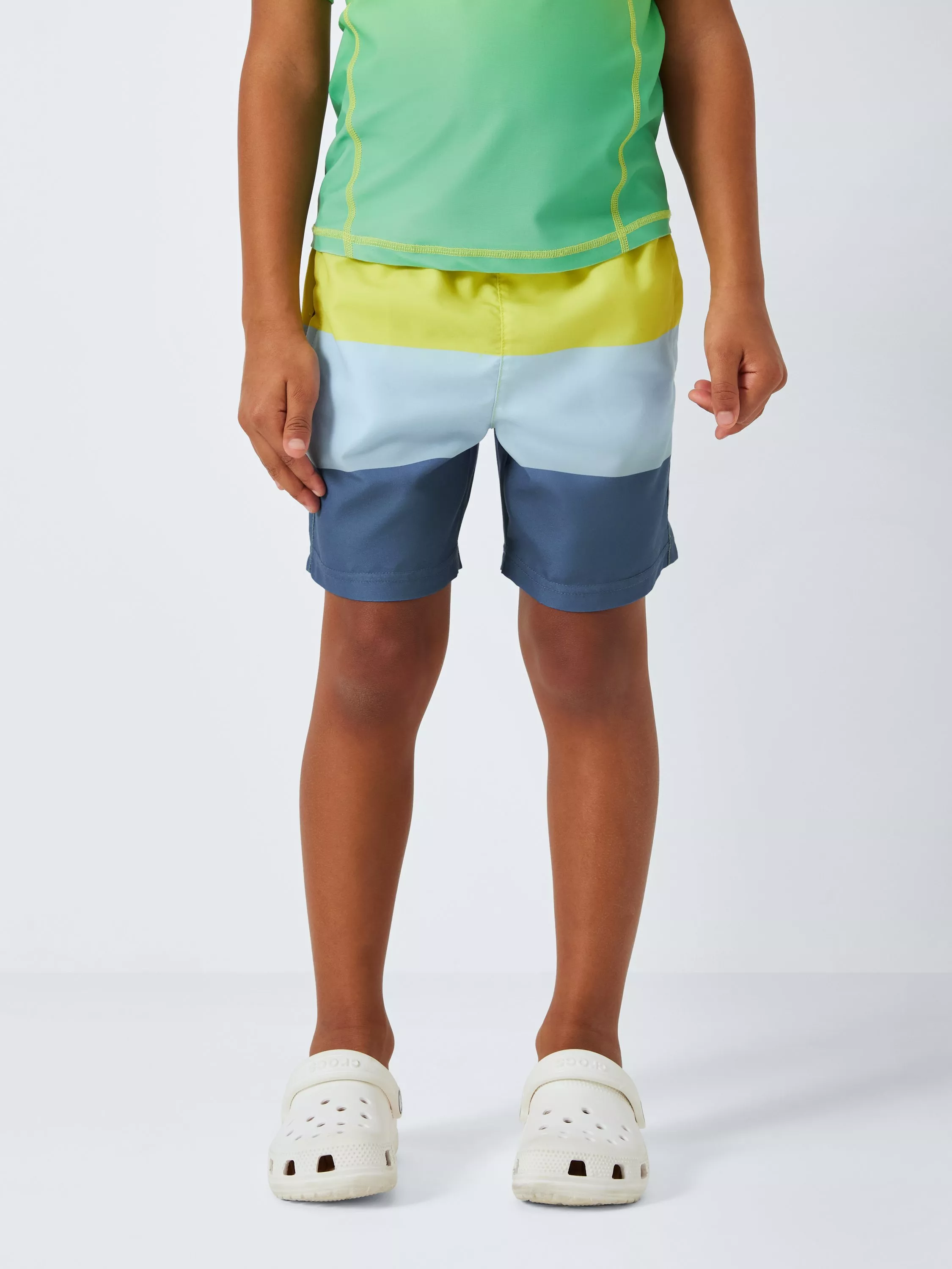 Featuring a colour block design, these swim shorts have an elasticated waist with a drawcord tie as well as two side pockets.