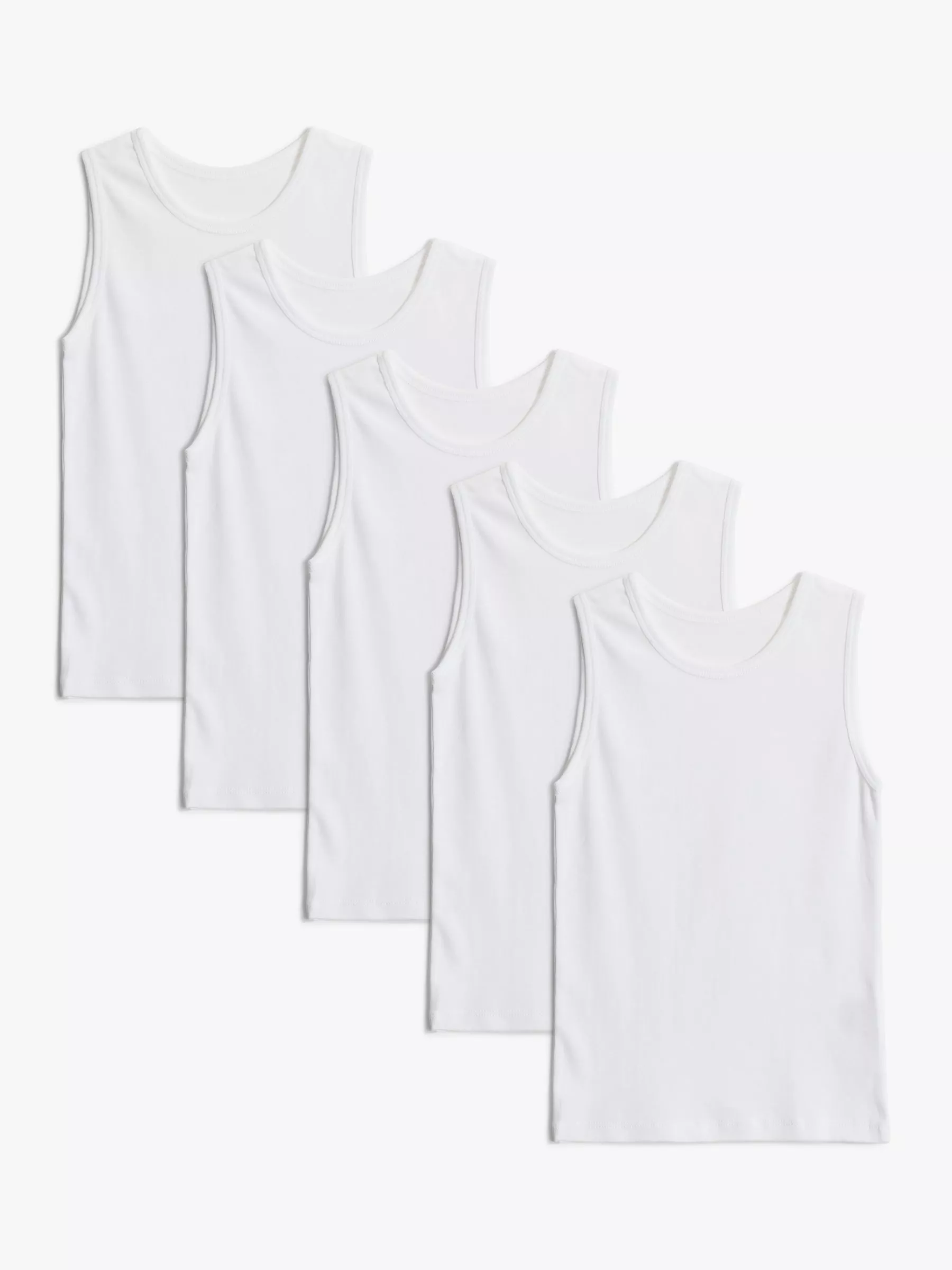 Ever versatile, this handy set of five pure cotton vests come in a classic plain, sleeveless design. Ideal on their own during summer or layered under jumpers during the colder months of the year.