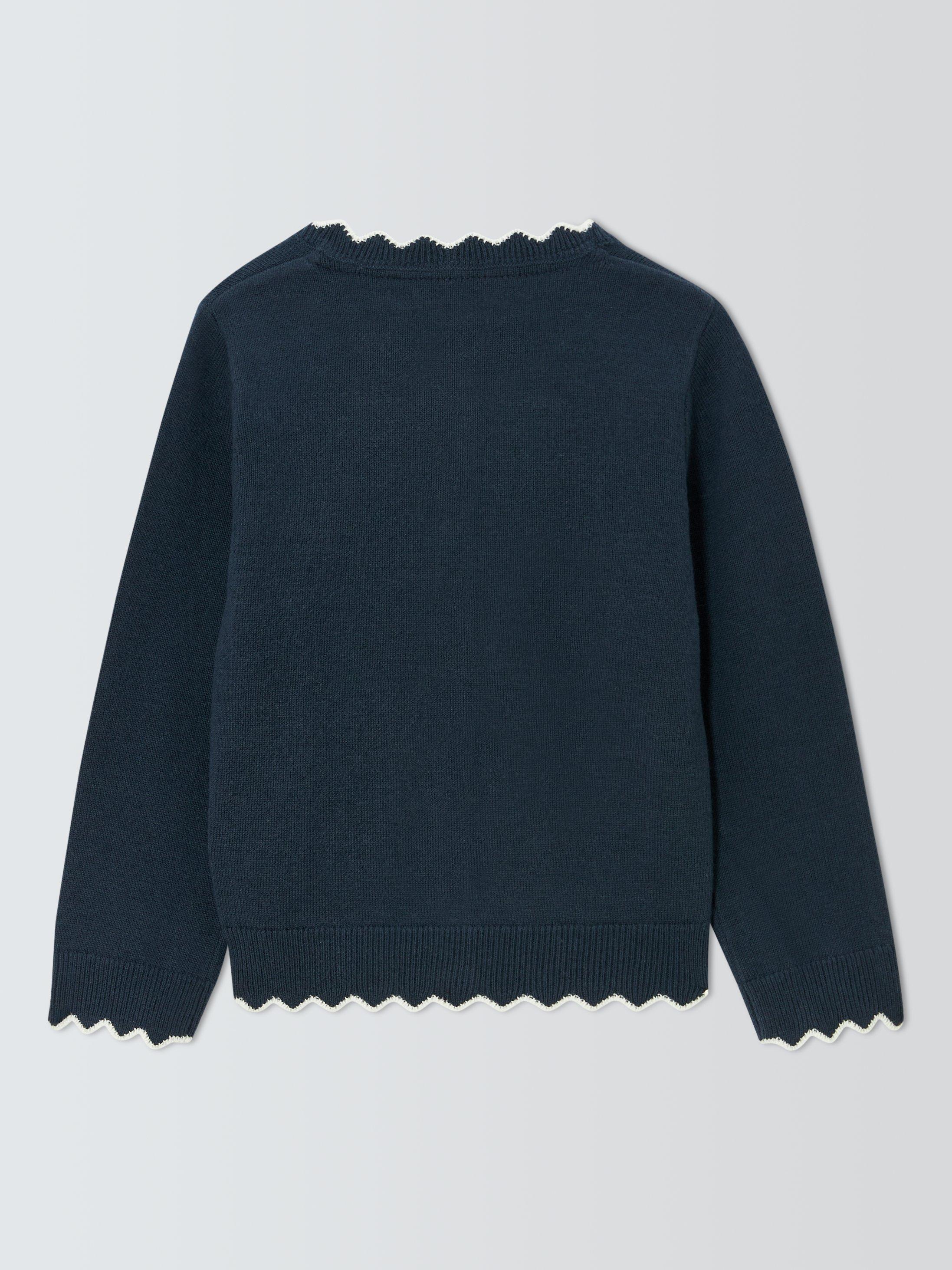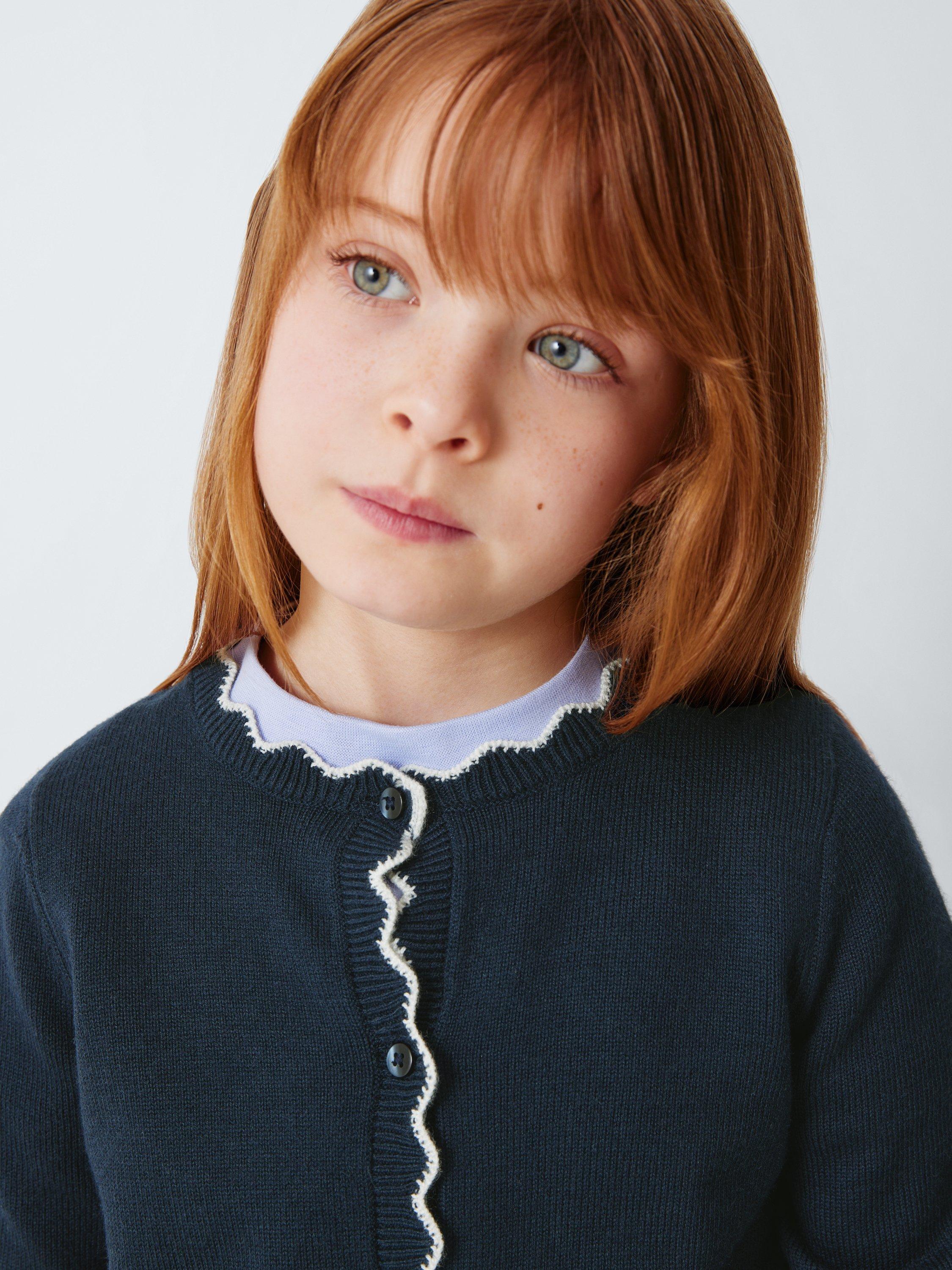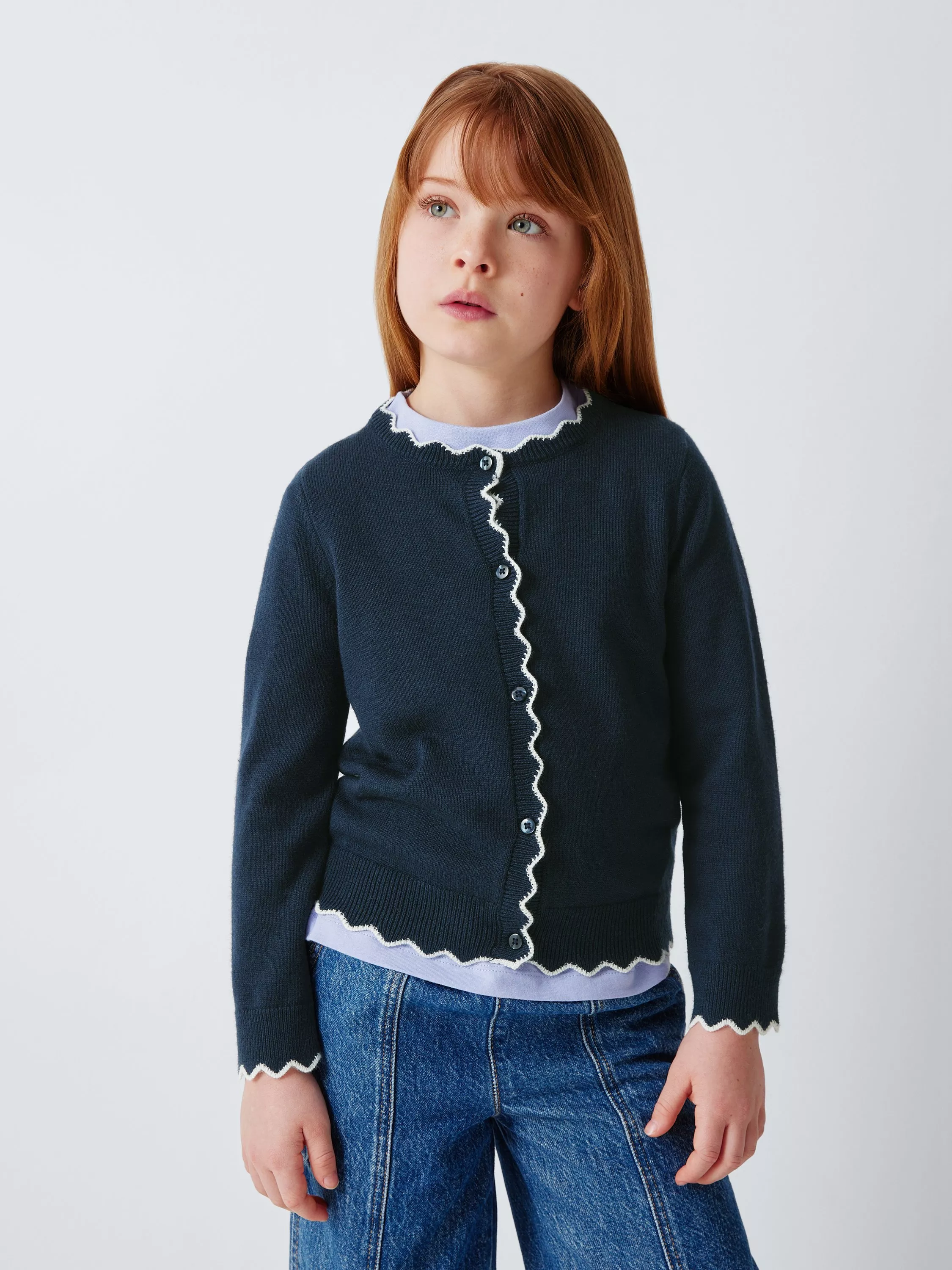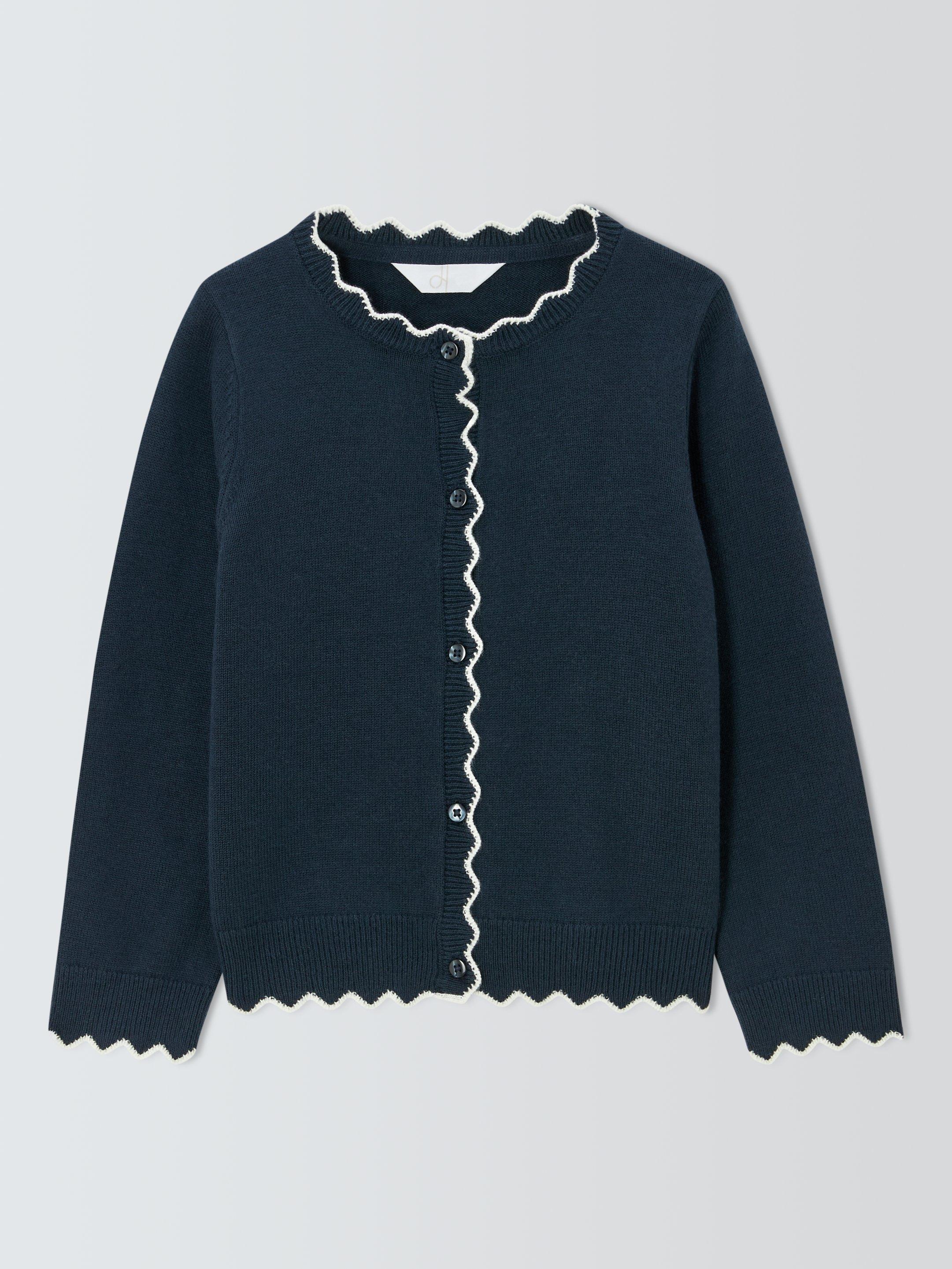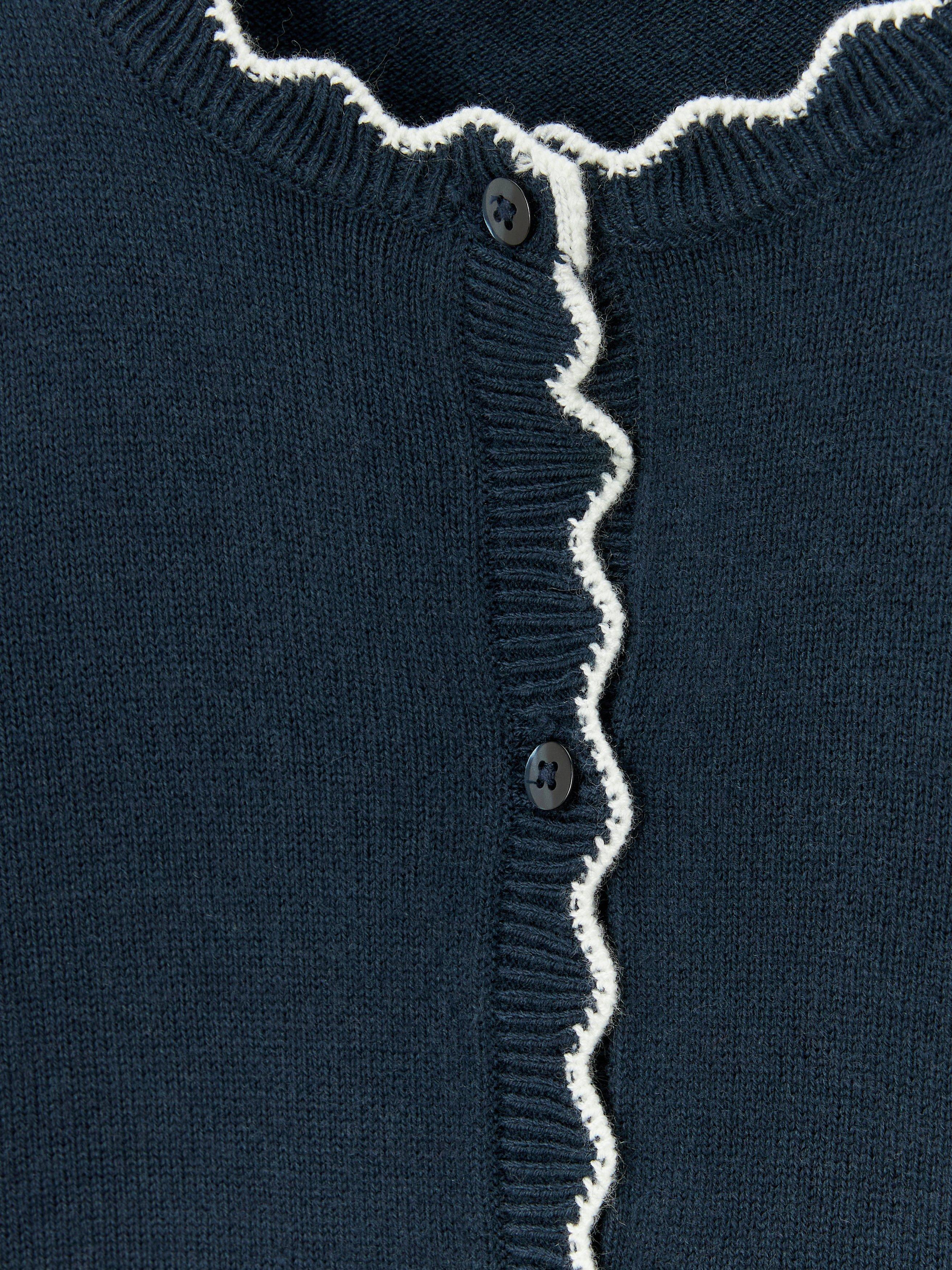 A classic crew neck cardigan with a fun, colour-contrast scallop trim.