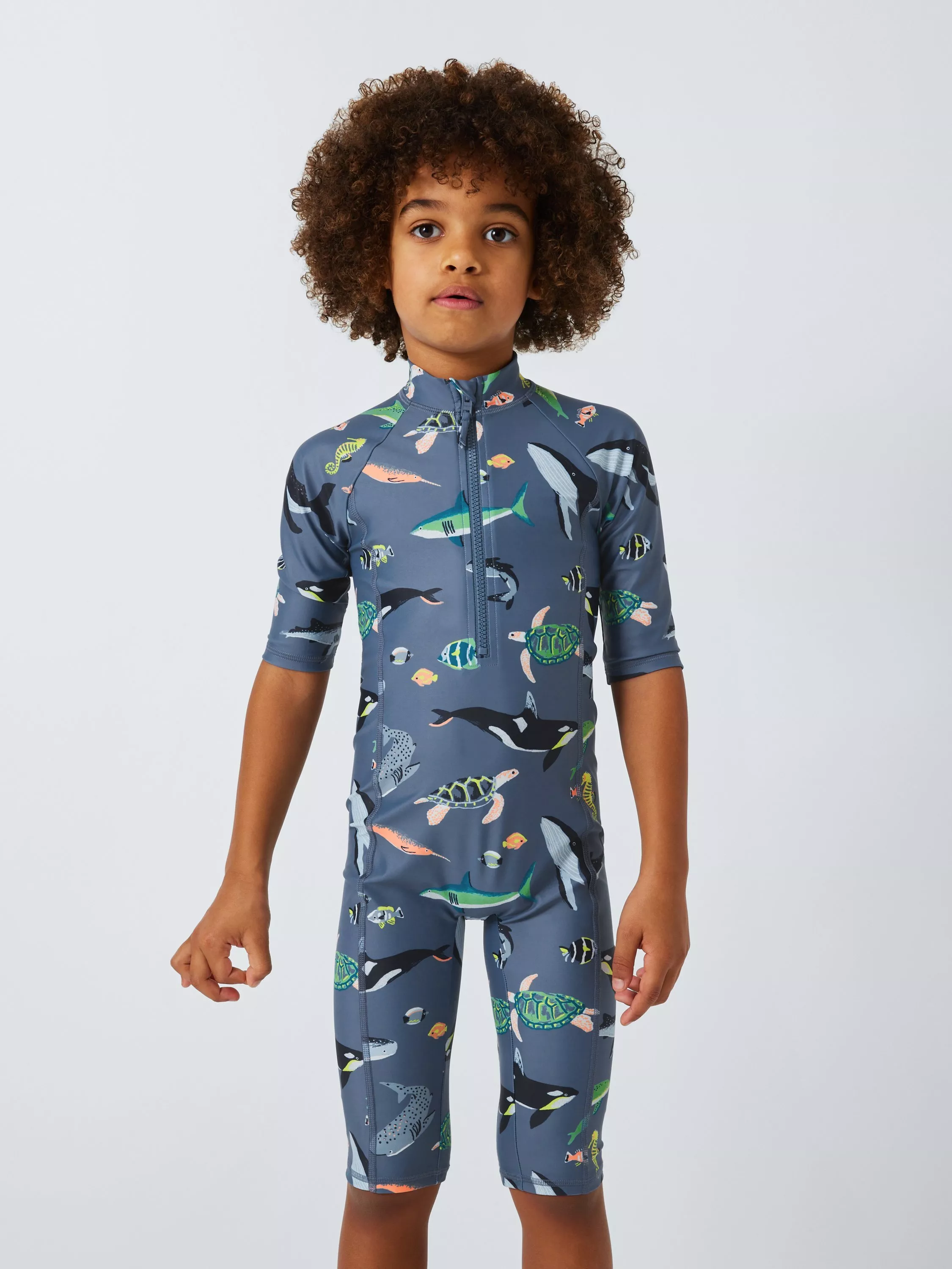 A holiday must-have for little ones with delicate skin, this sunpro is made from a lightweight, quick-drying material with added stretch for comfort. Long sleeves and a high neckline protect as much as possible, and the fabric has a UPF rating of 50+ for even greater protection. The style is designed with a zip-up front that makes dressing a breeze and is finished with a vibrant print of animals and fish from the deep sea.