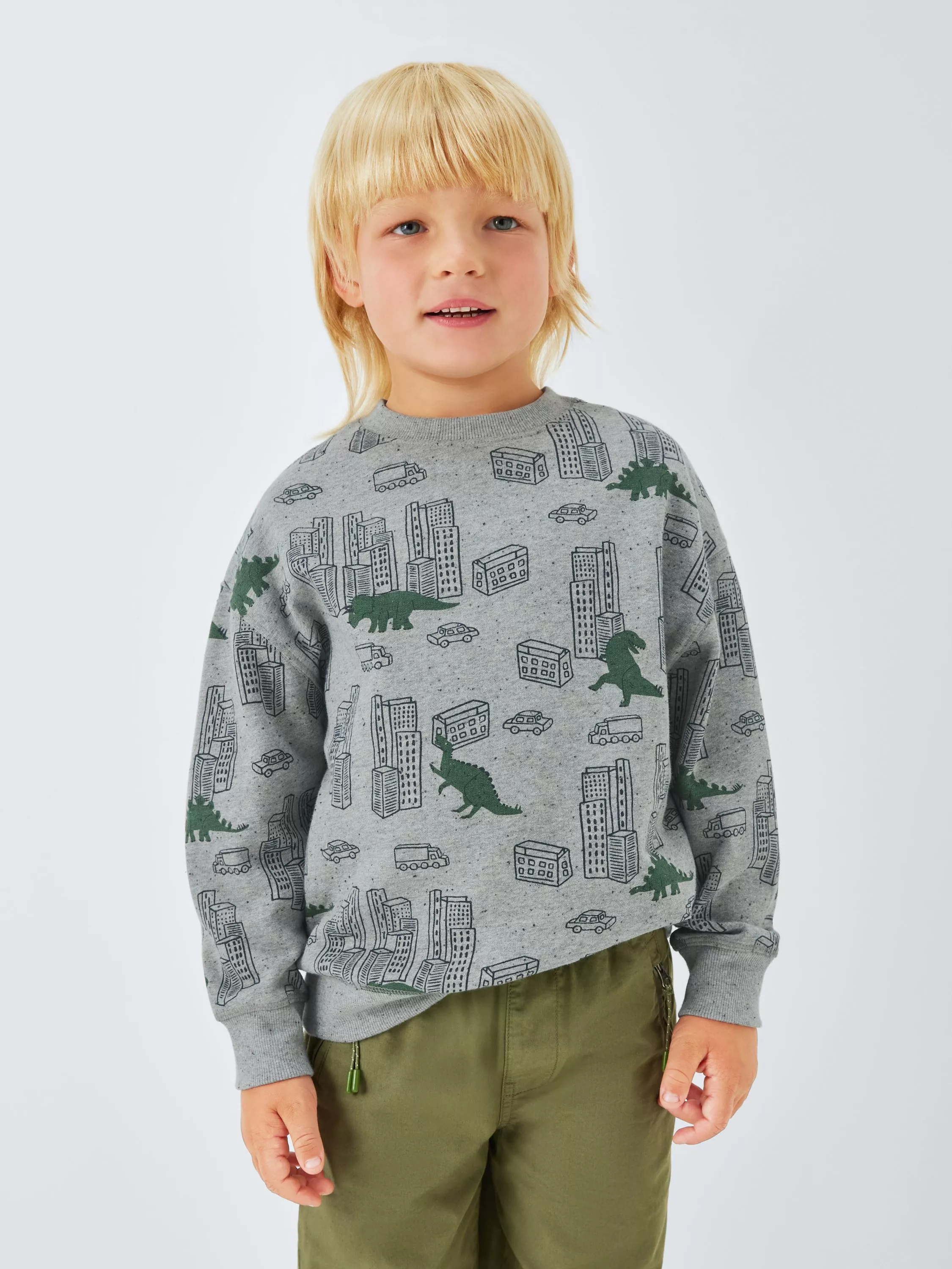 There are dinosaurs loose in the city! But don't worry, on this pure cotton jersey sweatshirt, these dinos are only here to make friends!