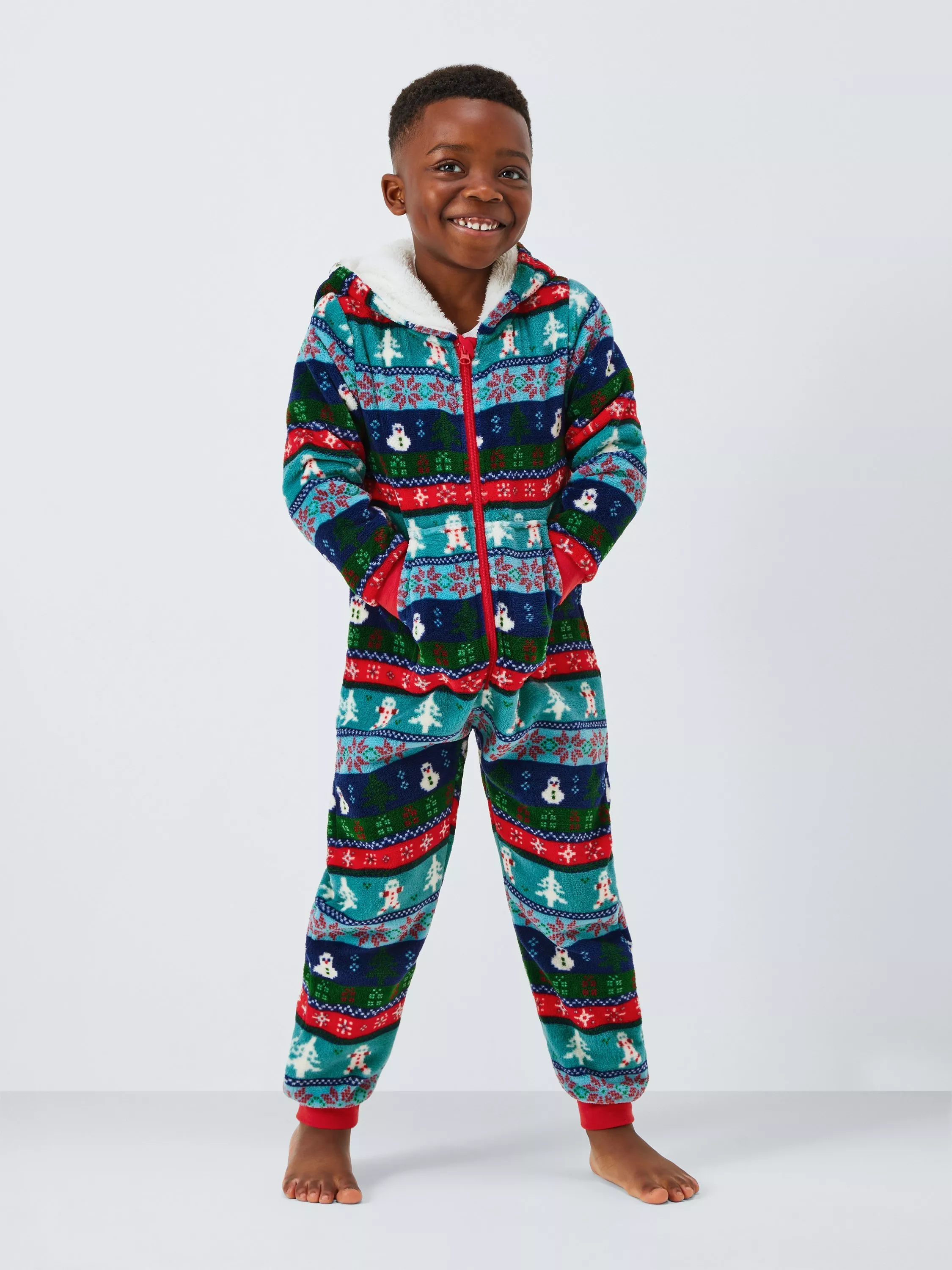 A vibrant, festive onesie with a cosy fleece-lined hood. Zip-up front with chin guard, front slip pockets and elasticated cuffs to keep the draught out.