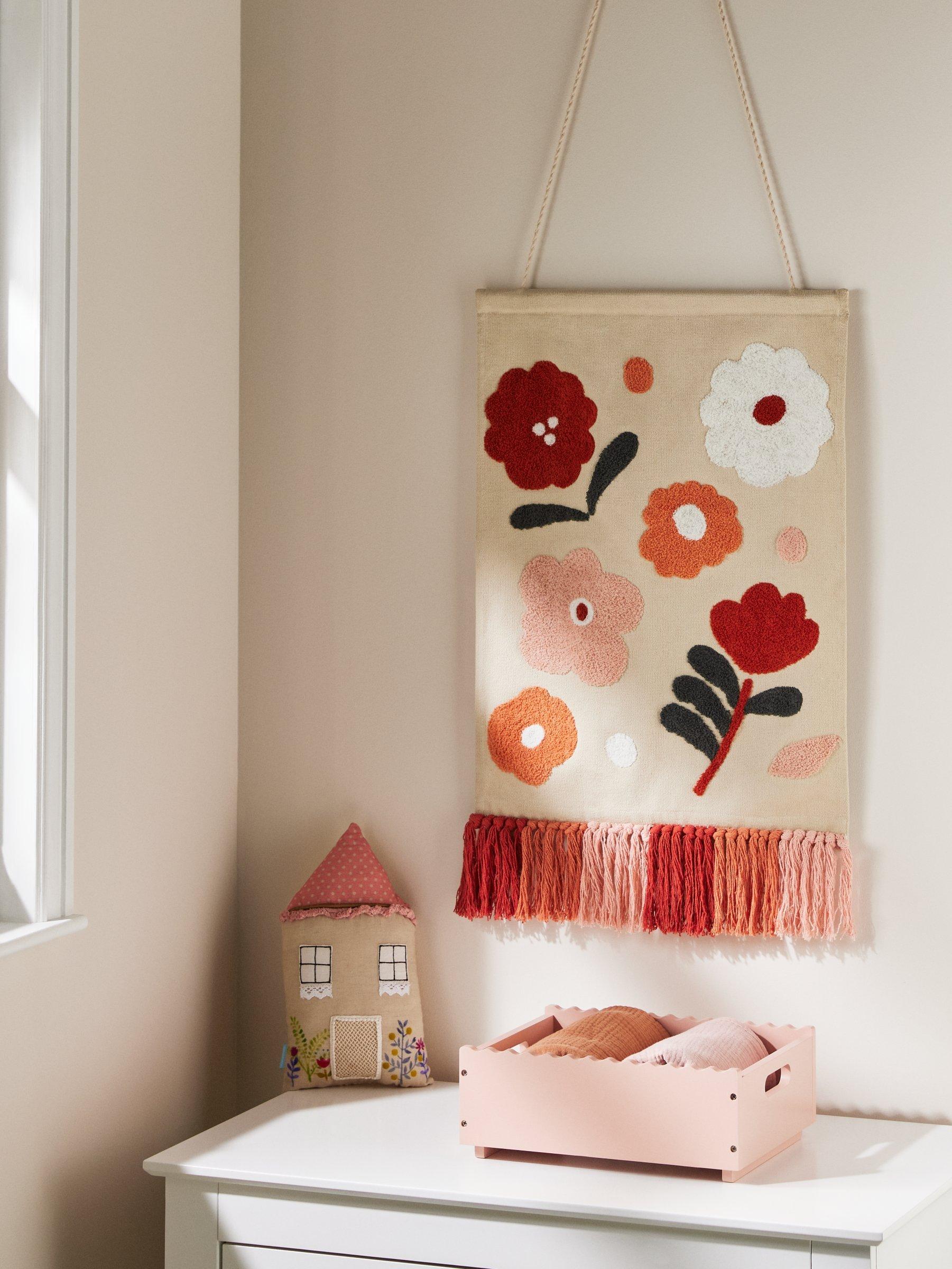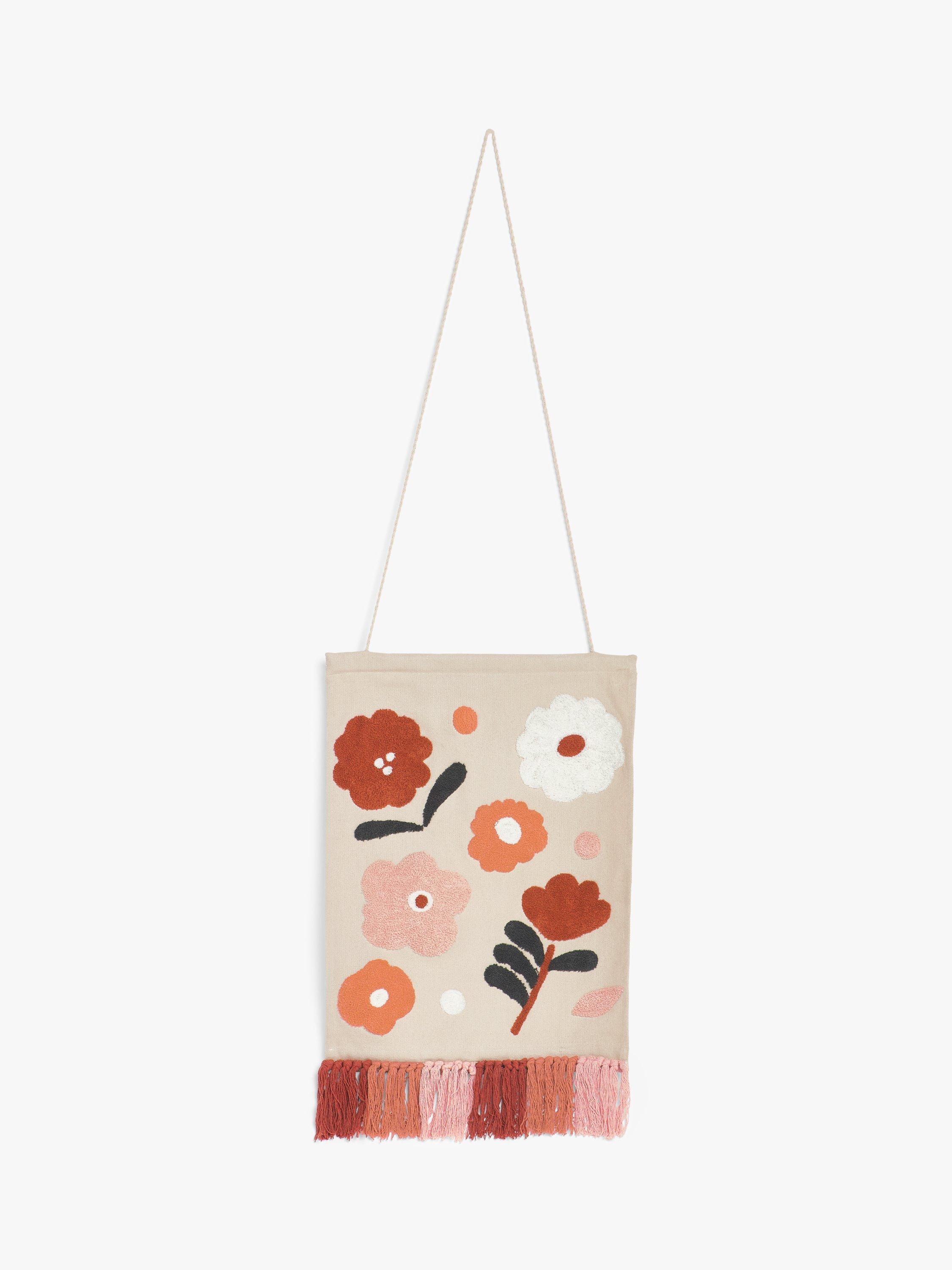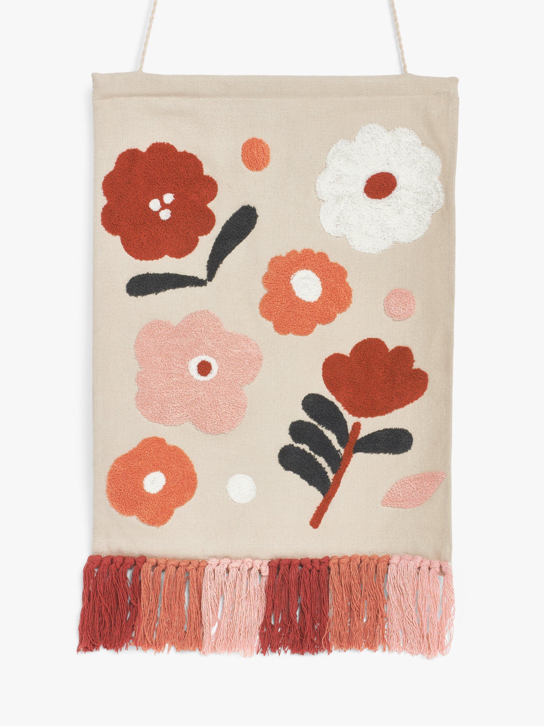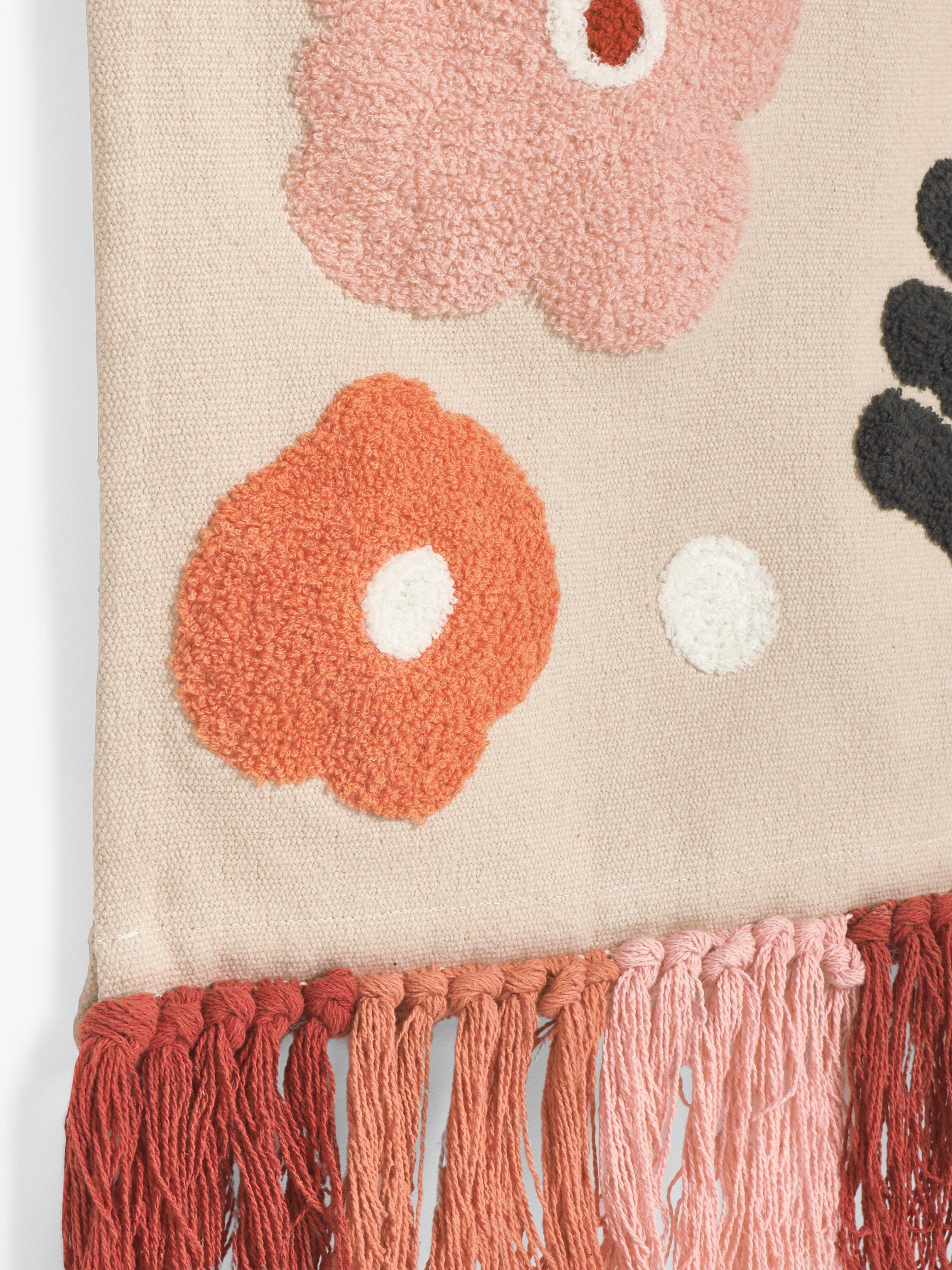 This wall hanging features artistic tufted floral detail complemented with string tassels.