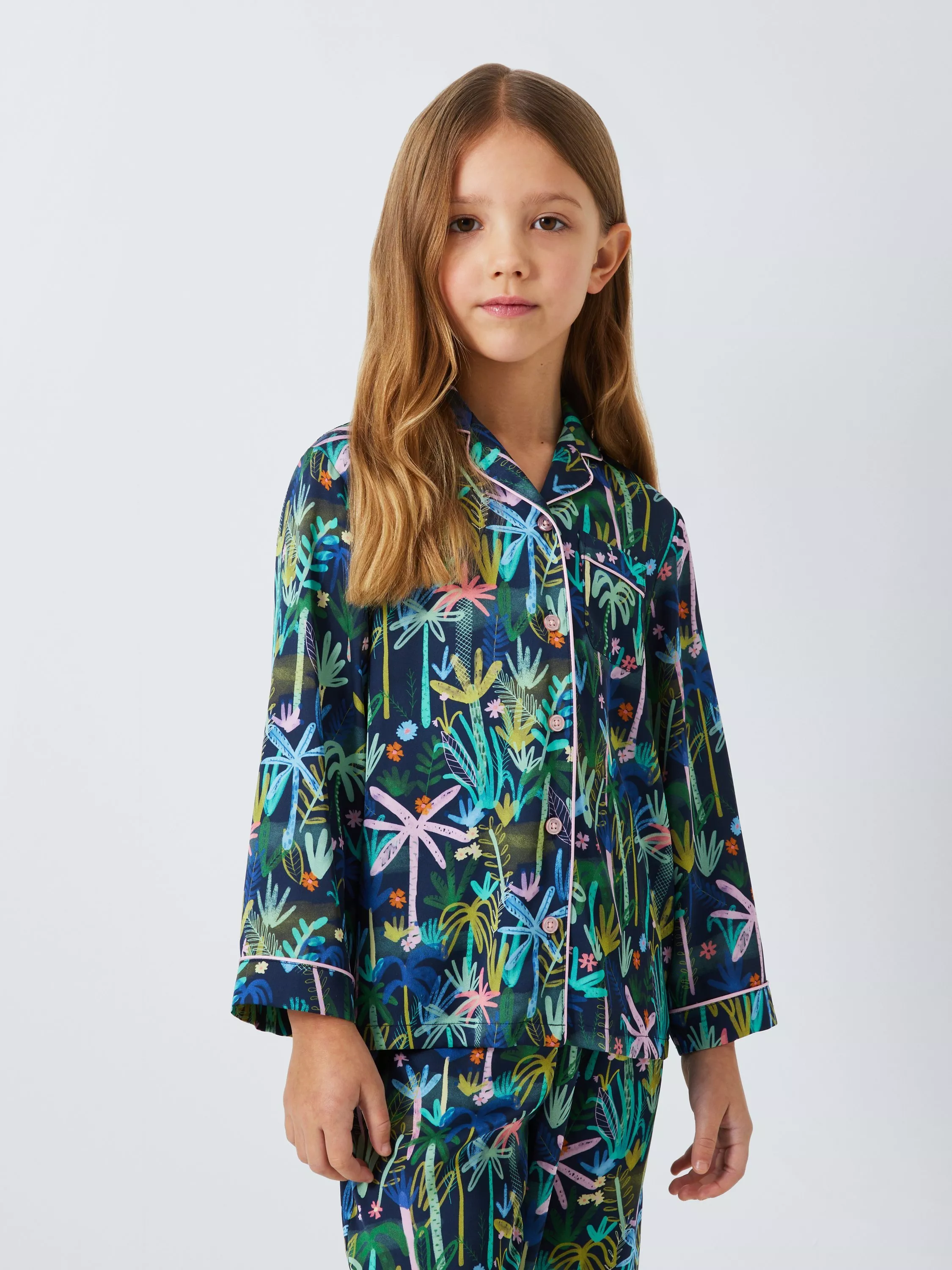 With grown-up appeal these silky satin pyjamas come in a classic button-up collared shirt and trousers set. The colourful design is finished with contrast piping.