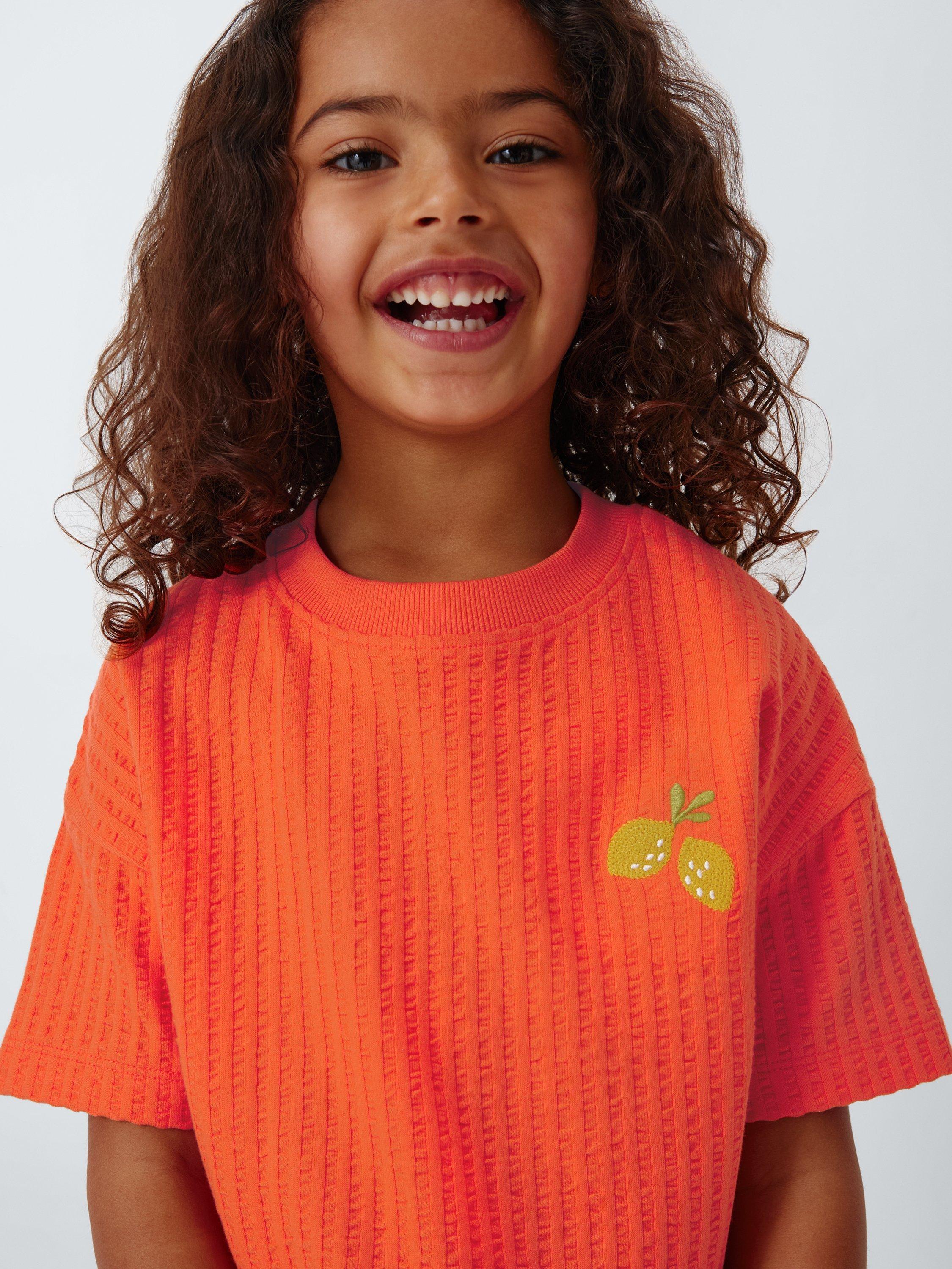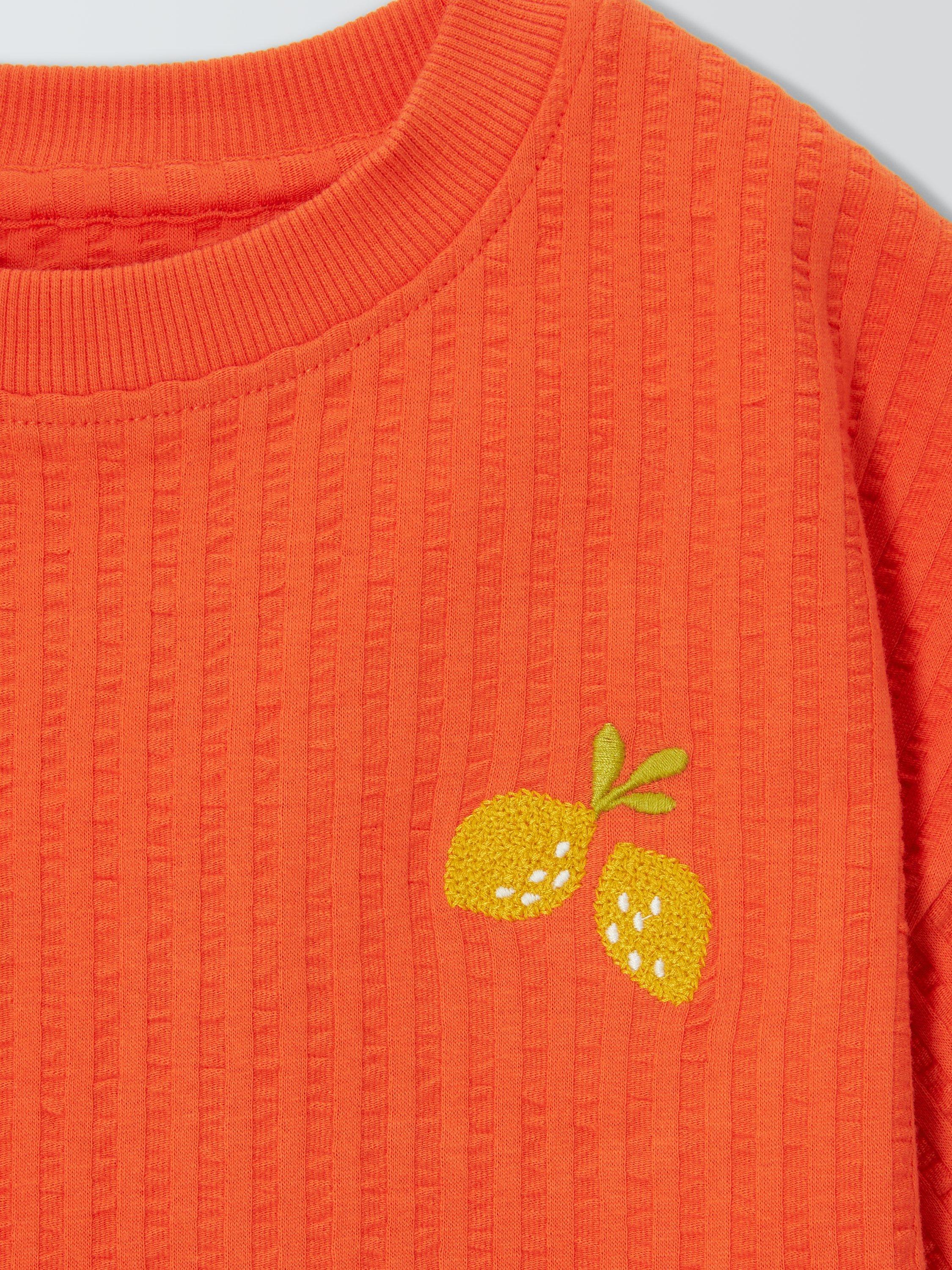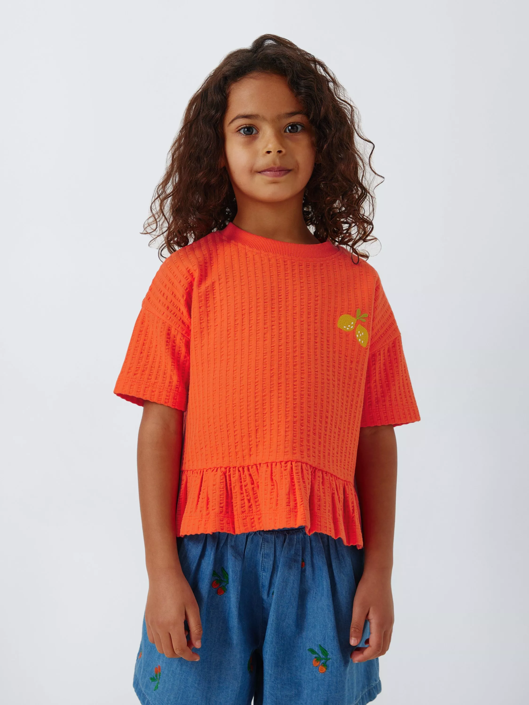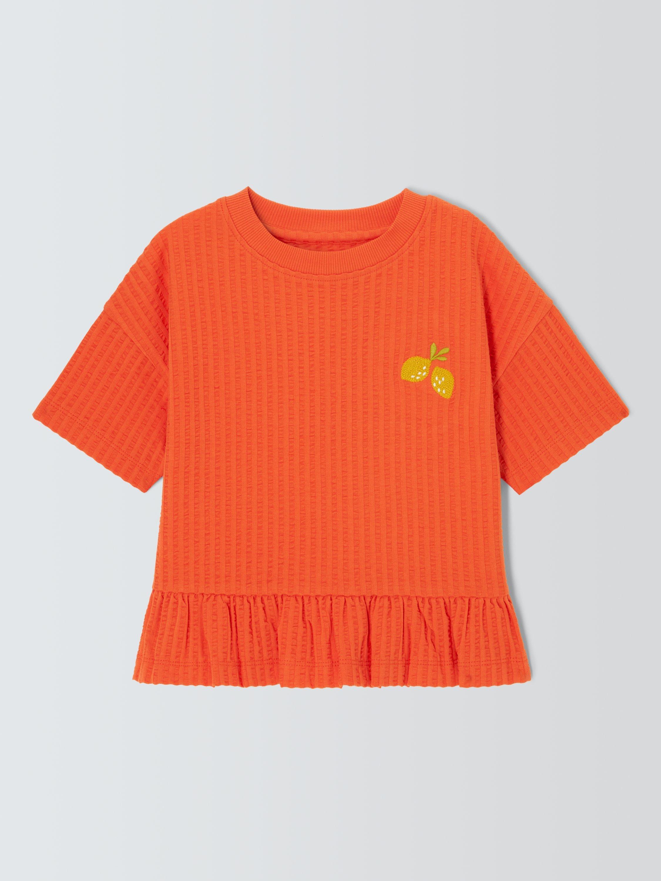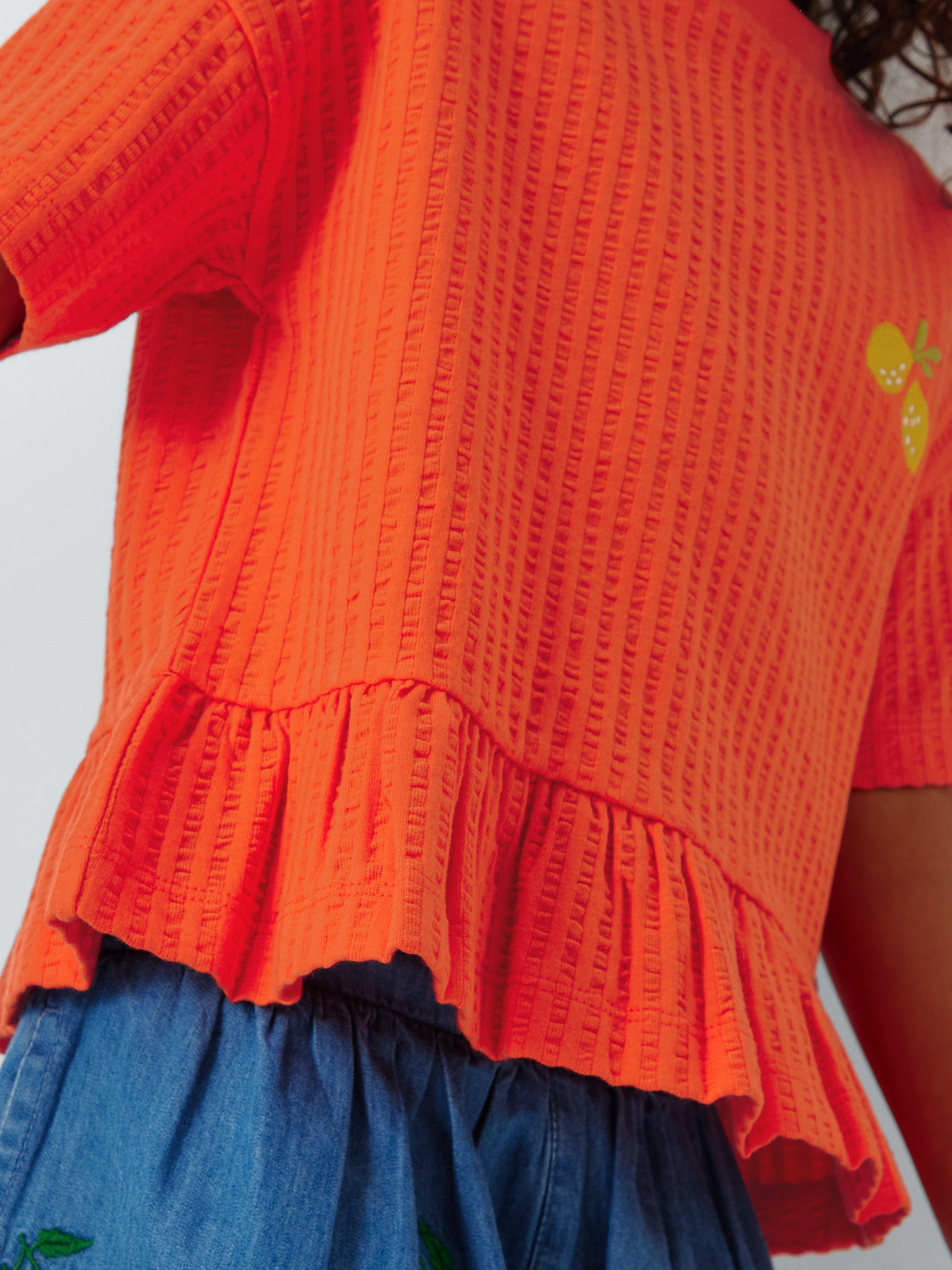 With a colourful lemon embroidery, this t-shirt comes in a summer-ready textured cotton with a fun ruffle hem.