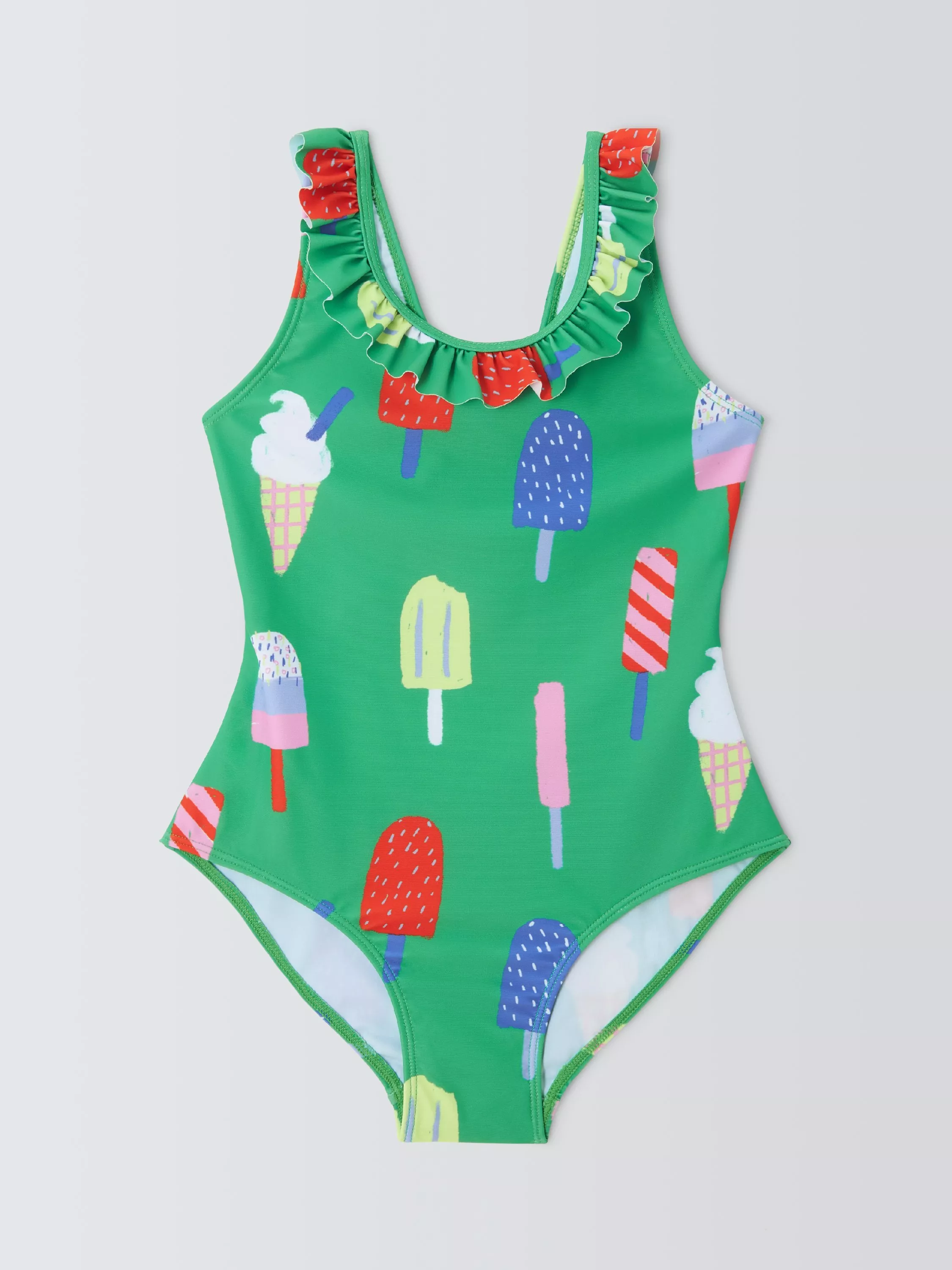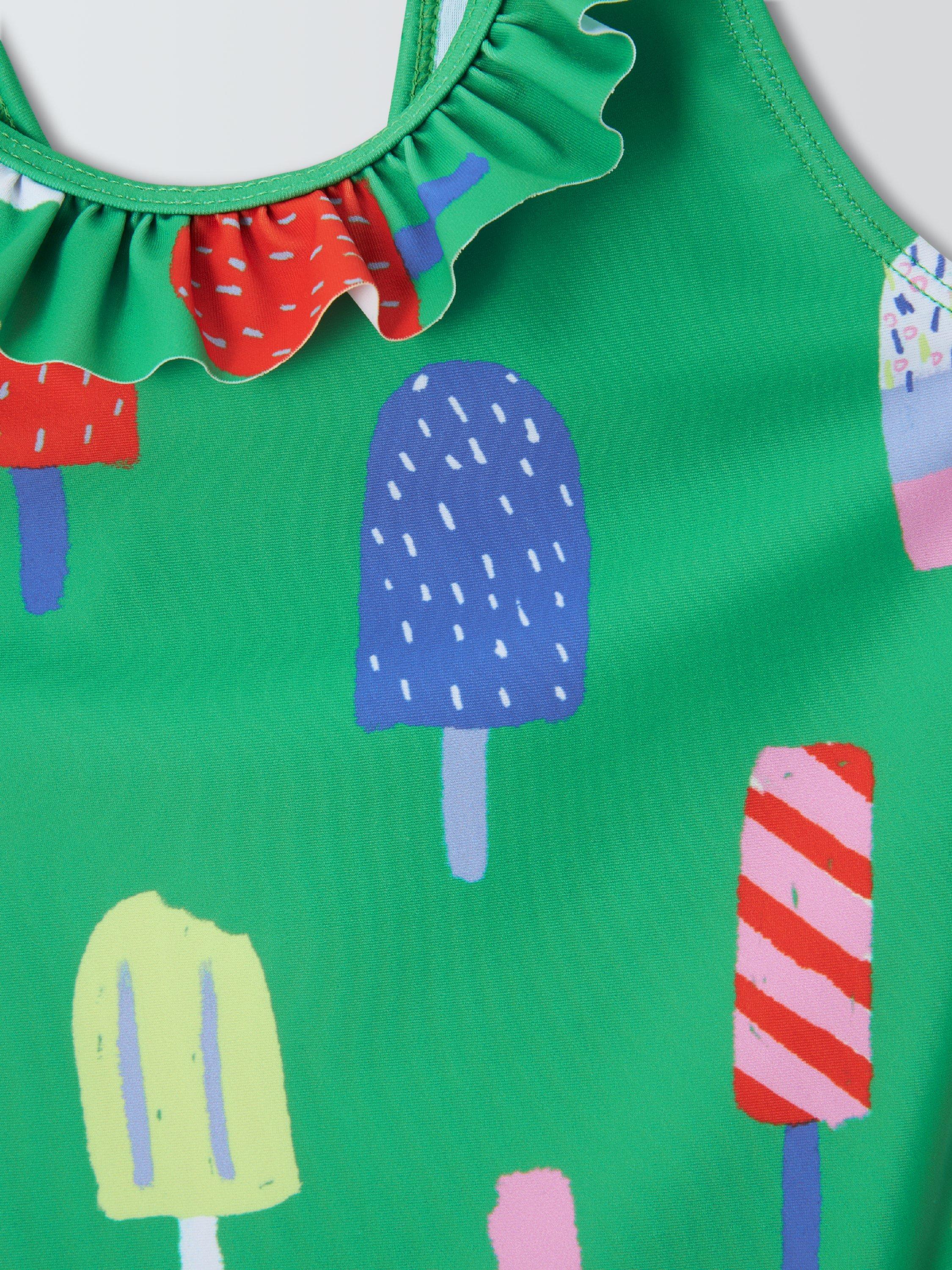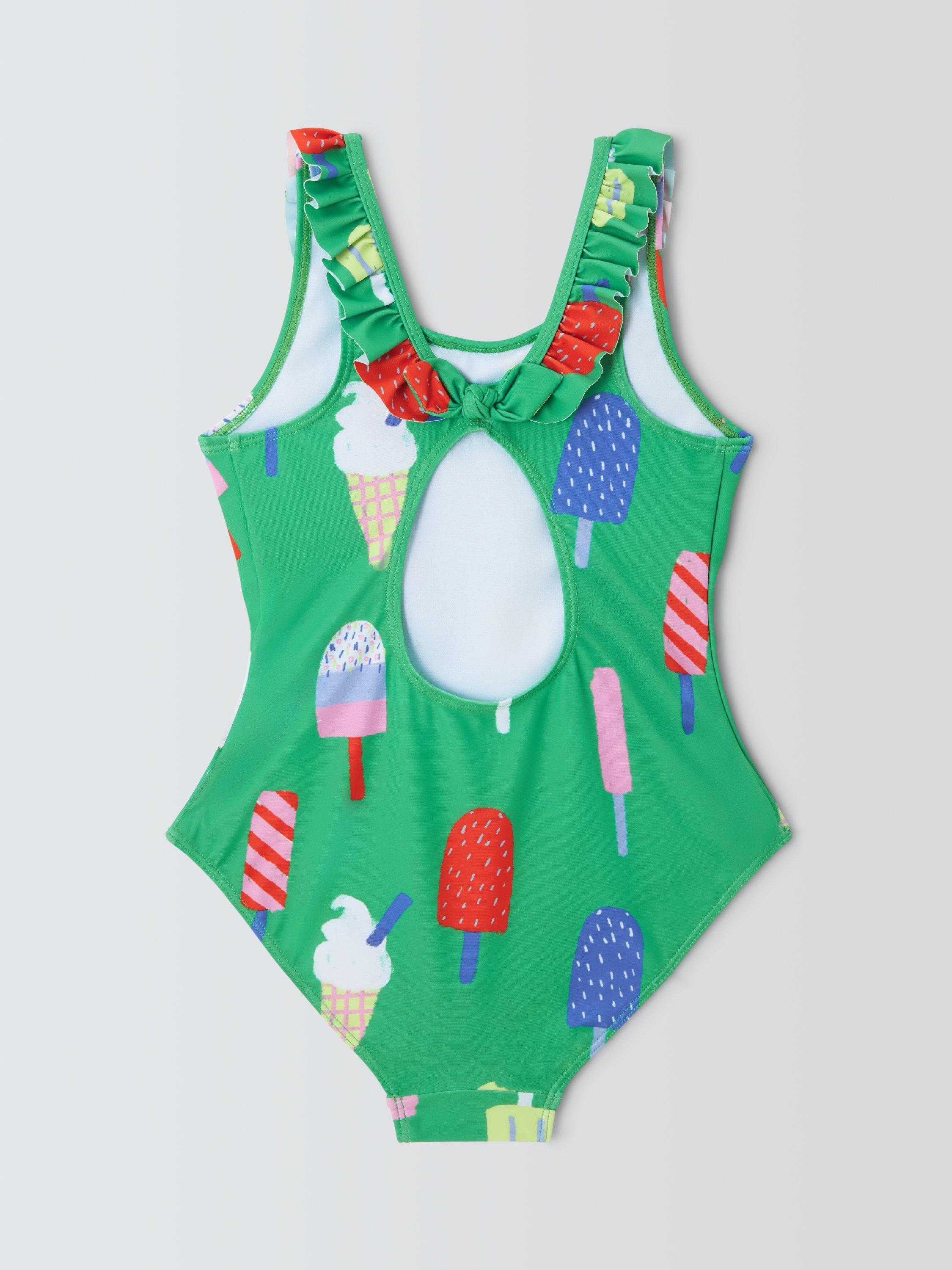 With a playful lollies print, this swimsuit is complete with a frilly neckline and bow at the back that creates a cut-out detail. Front lined with knitted mesh.