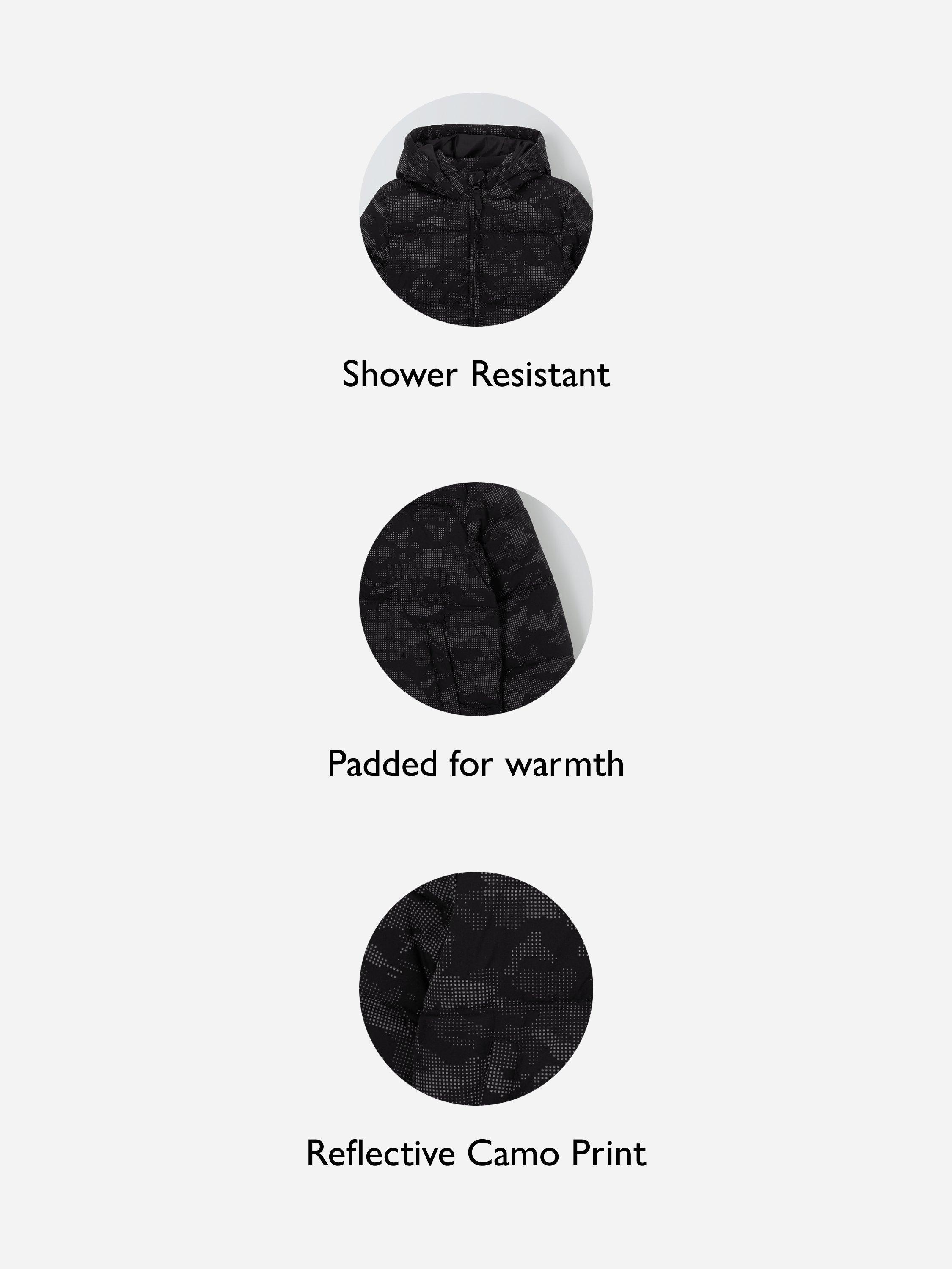 Keep them wrapped up from the chill this season with this cool and cozy camouflage jacket. With reflective detailing that's perfect for after dark, when light shines the print reflects. It's got a simple zip front and handy side pockets.