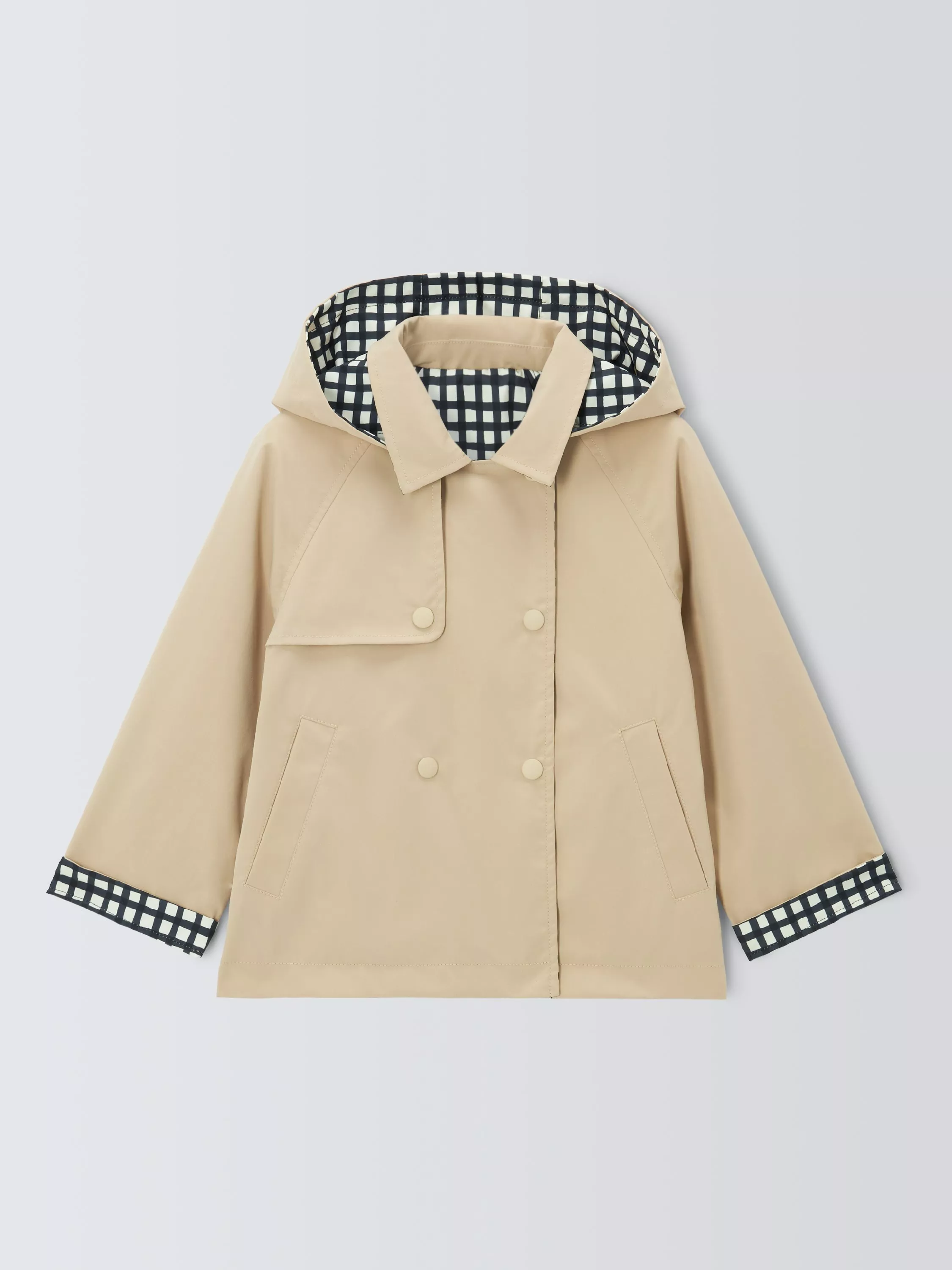 A reversible trench coat with a shower-resistant finish. Features a reverse pongee gingham check, detachable hood, and pockets. In a double-breasted front fastening with matching coated snap fastenings.
