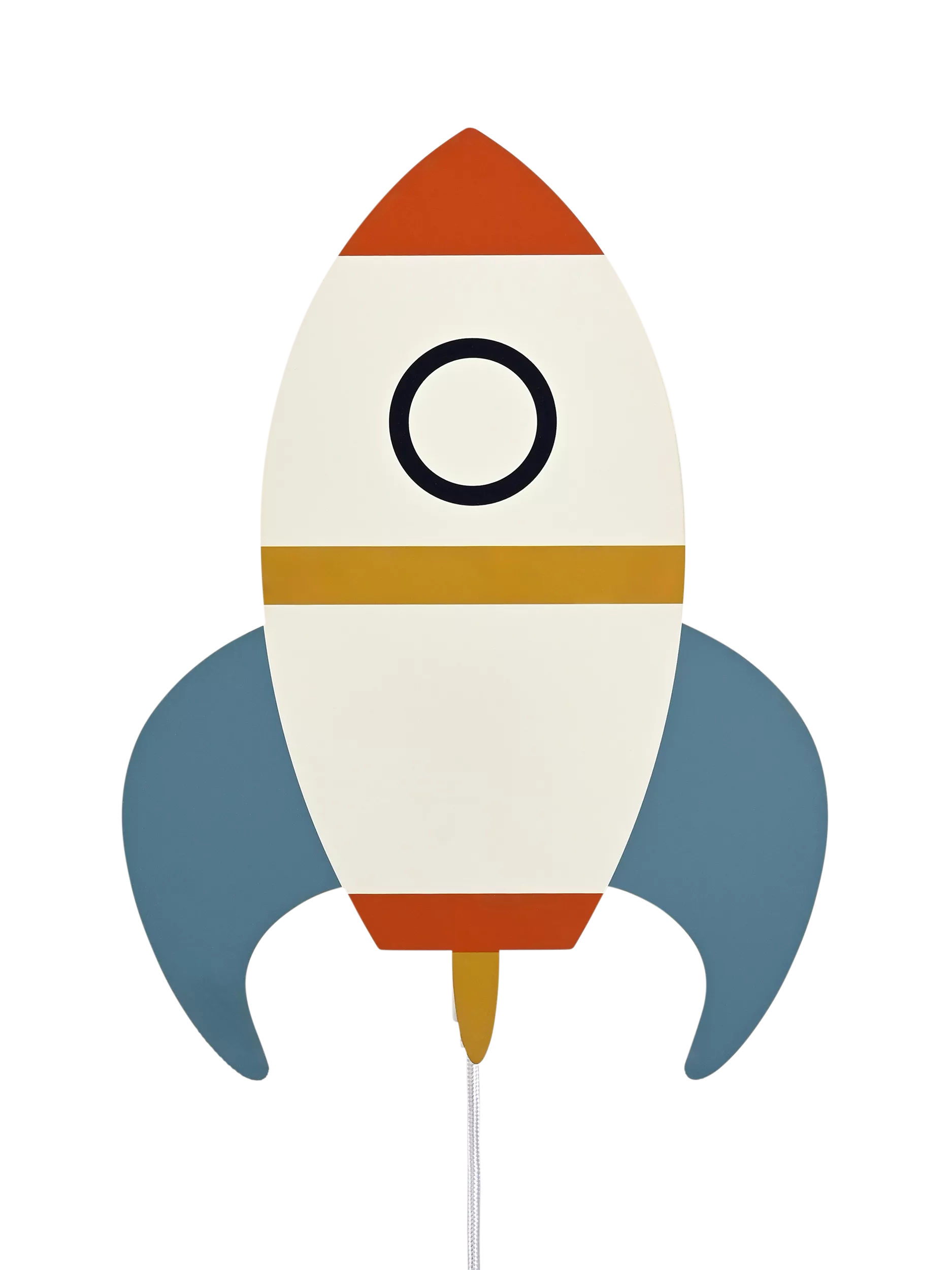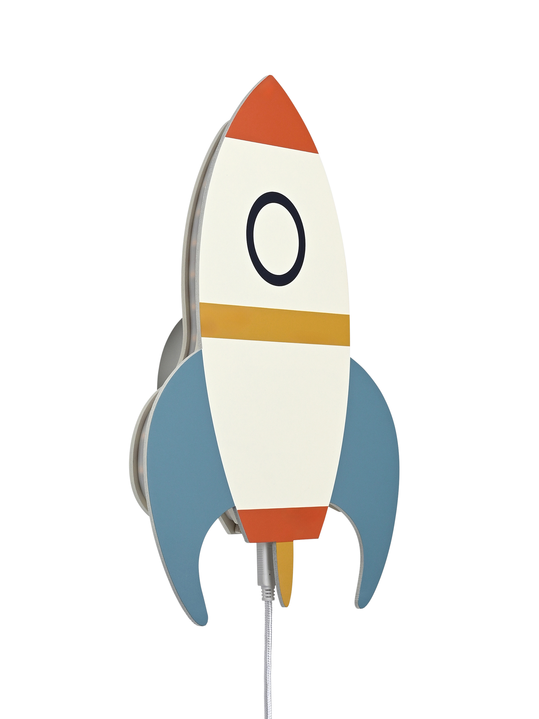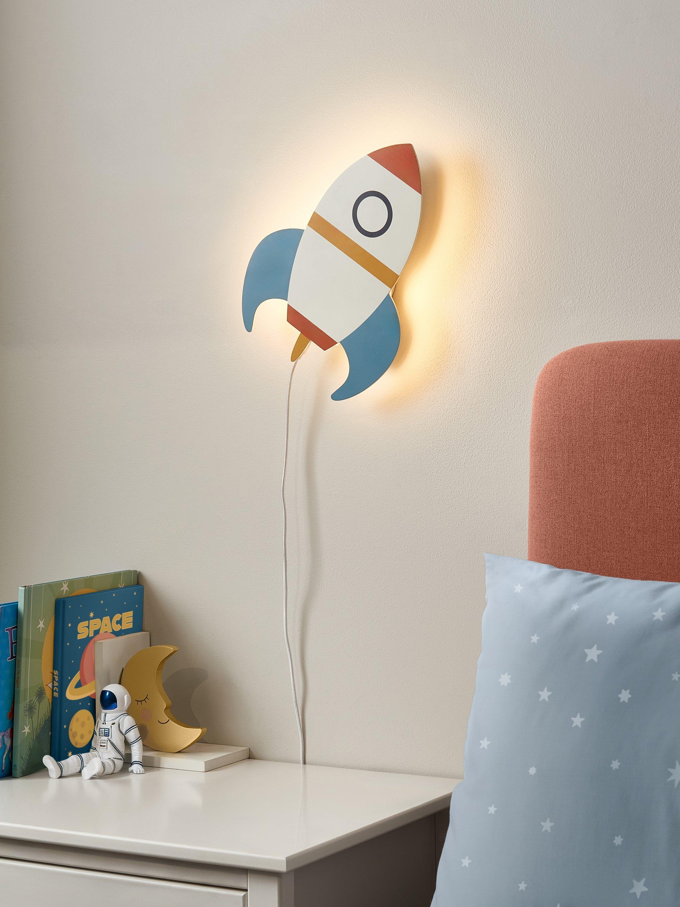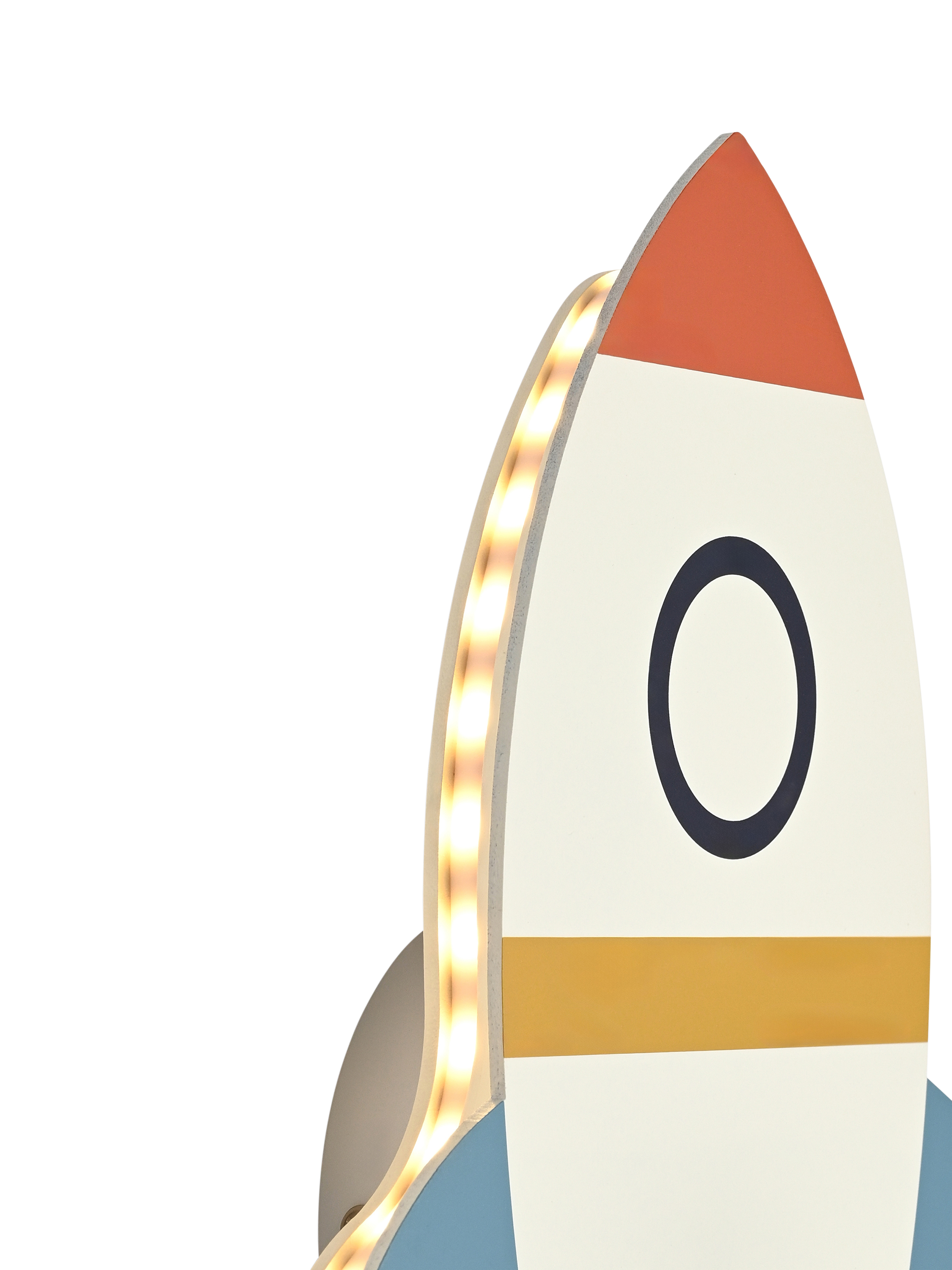 A wooden rocket-shaped wall light. Backlit with LEDs, it adds a cosy glow and a pop of colour. No wiring needed - just plug in and it's lift-off.