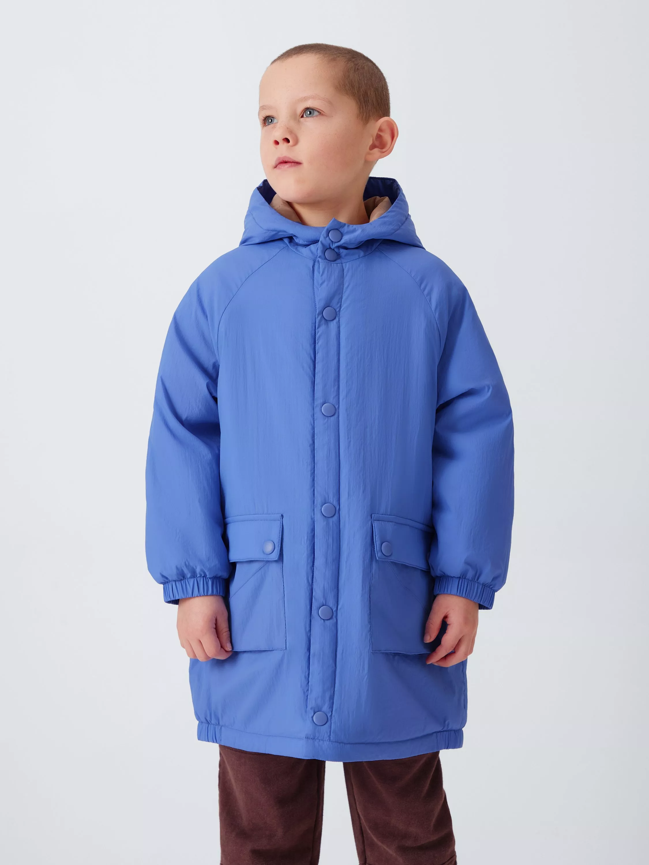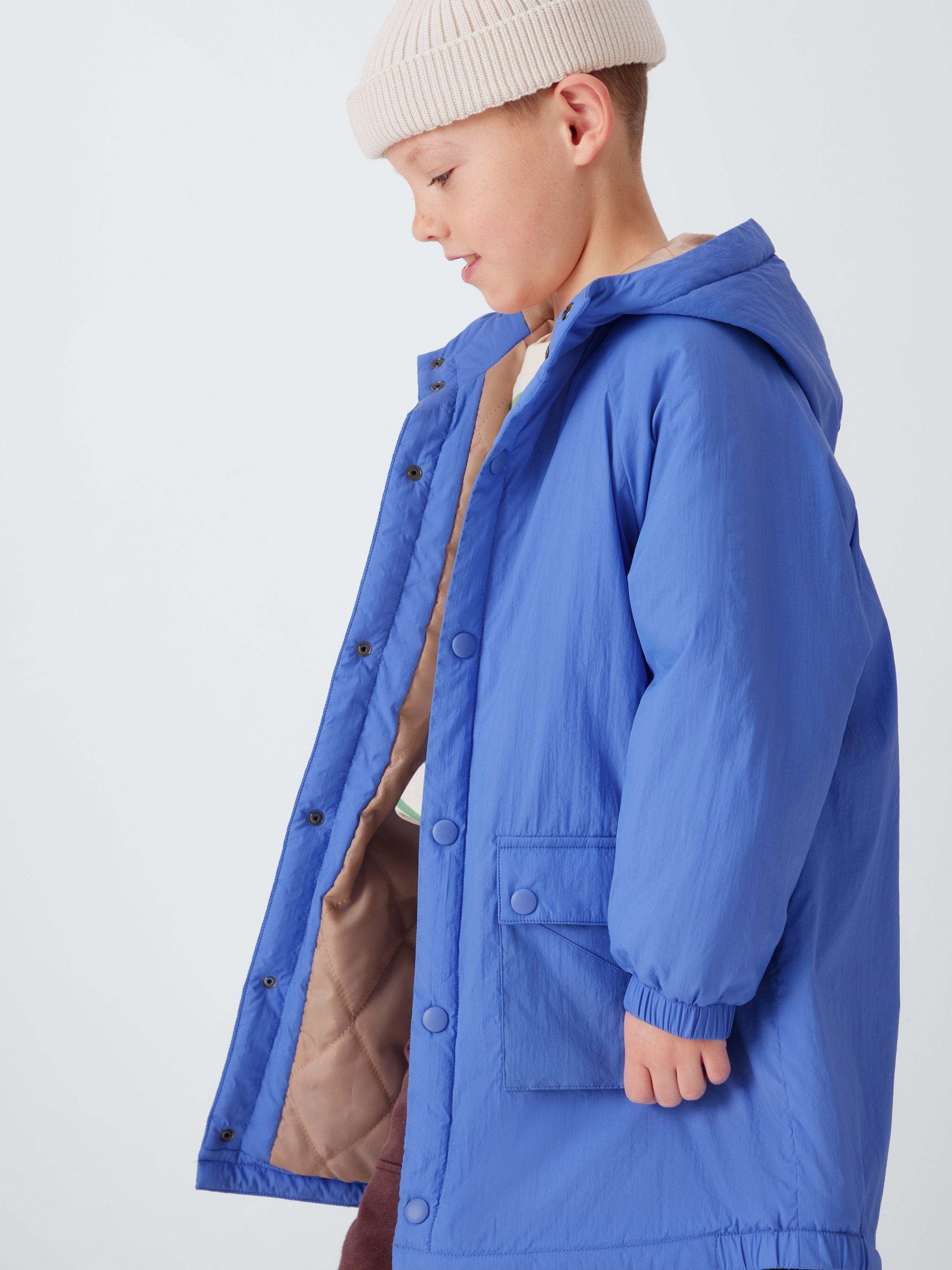 A shower-resistant Cagoule Parka Coat - perfect for seeing them through rainy days. The hood, body and sleeves are lined with a contrast taffeta with diamond quilting. Features bellow pockets with a flap and poppers, as well as poppers running down the centre front.