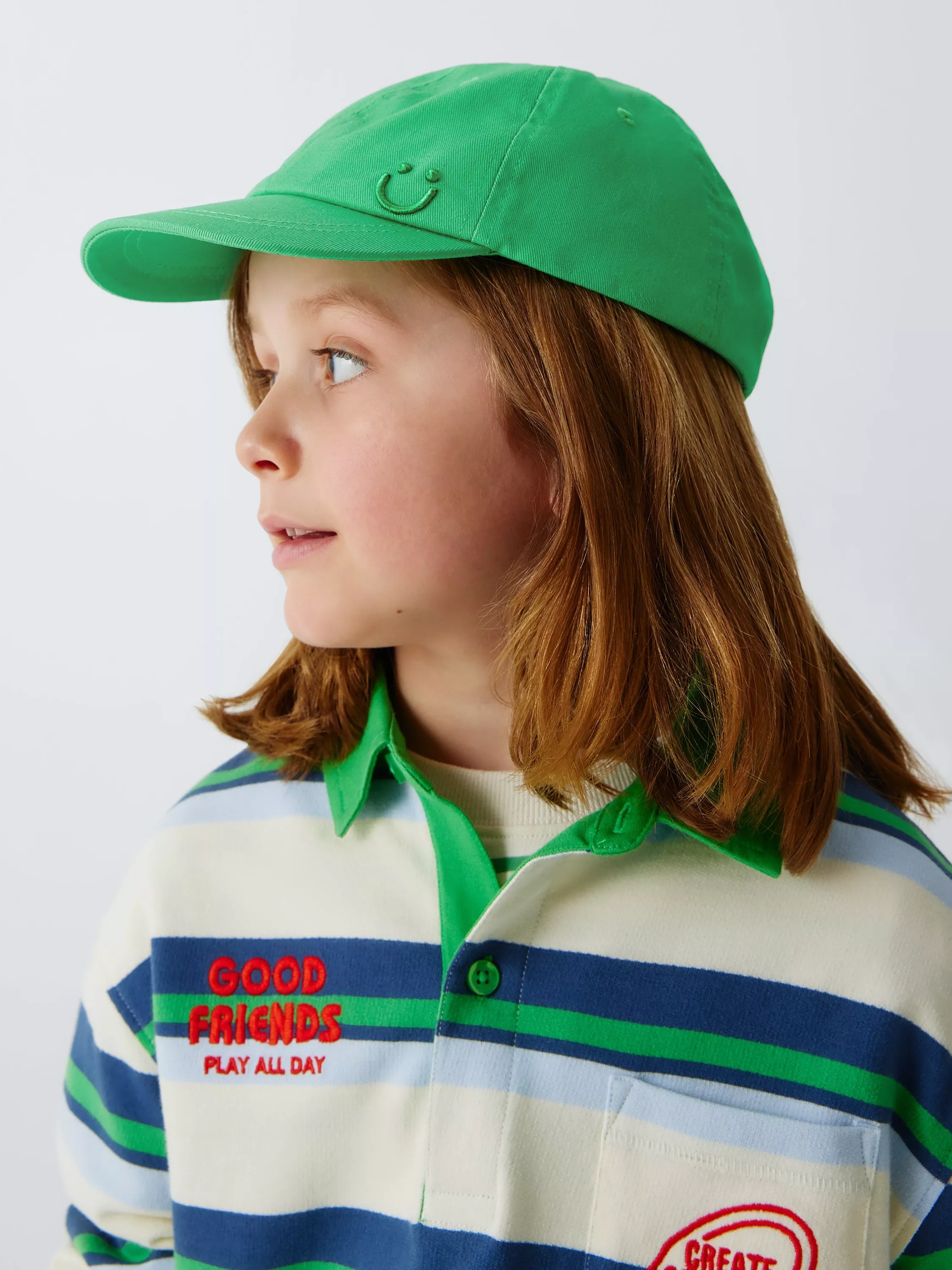 This cotton cap has a subtle smile embroidered above the brim and riptape fastening at the back for the perfect fit. Topstitched panels and embroidered eyelets keep them feeling cool.
