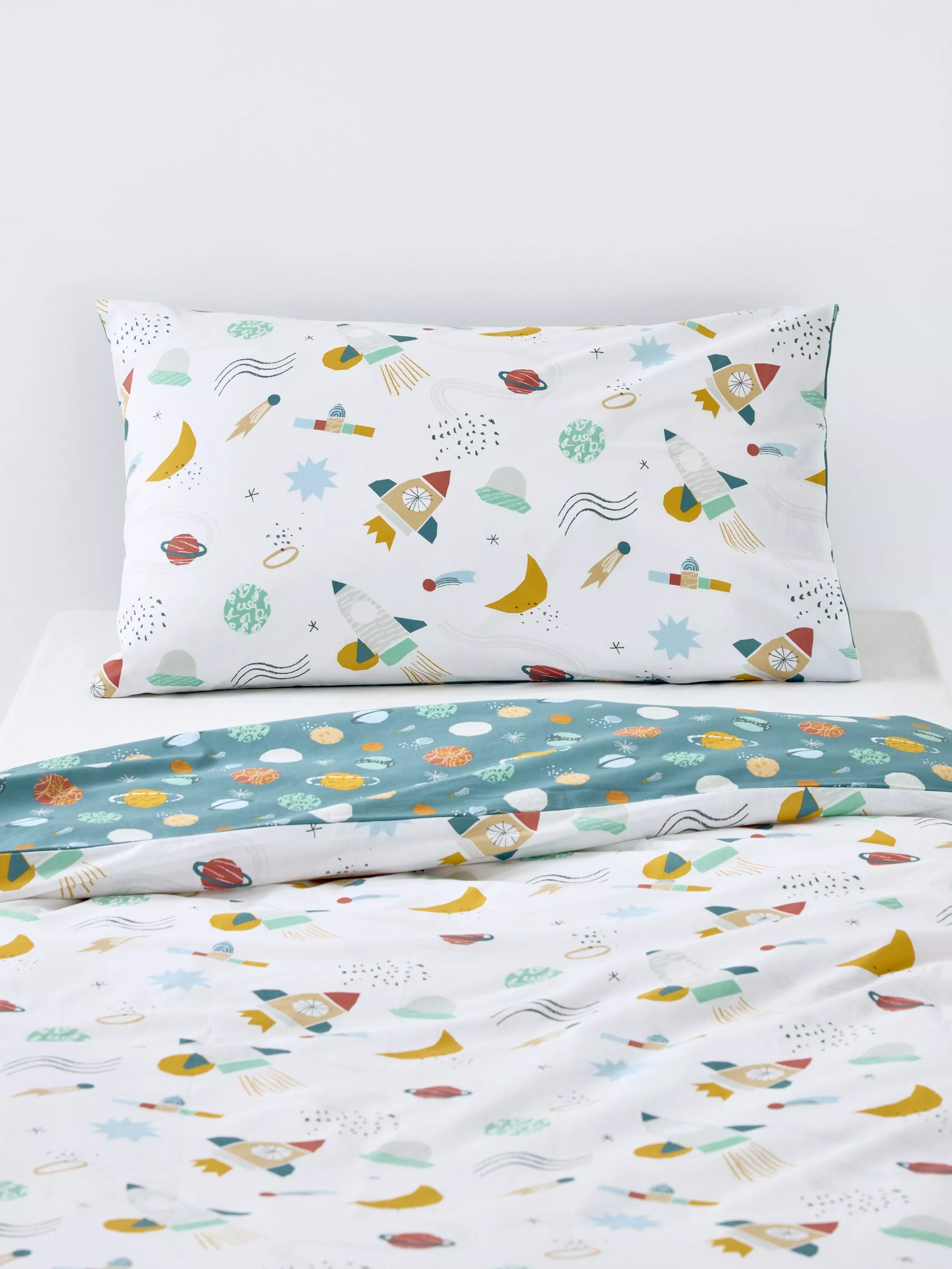 Zoom, zoom zoom, we're going to the moon! And Mars, and Jupiter, and the rest! Budding astronauts will love this reversible duvet cover and pillowcase set with cartoon outer-space designs.