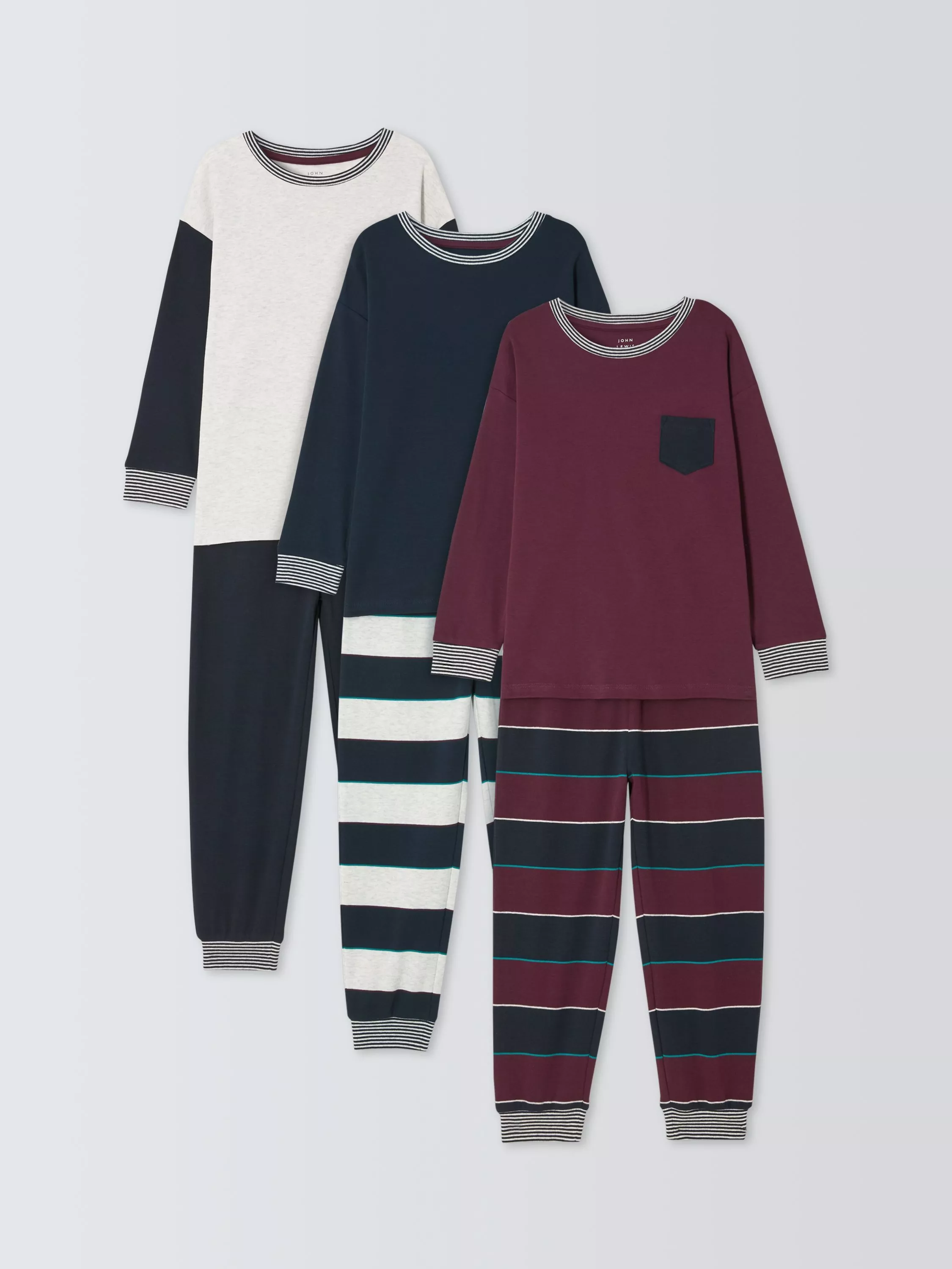 A pack of 3 long pyjamas, all made from pure cotton and complete with elasticated cuffs.