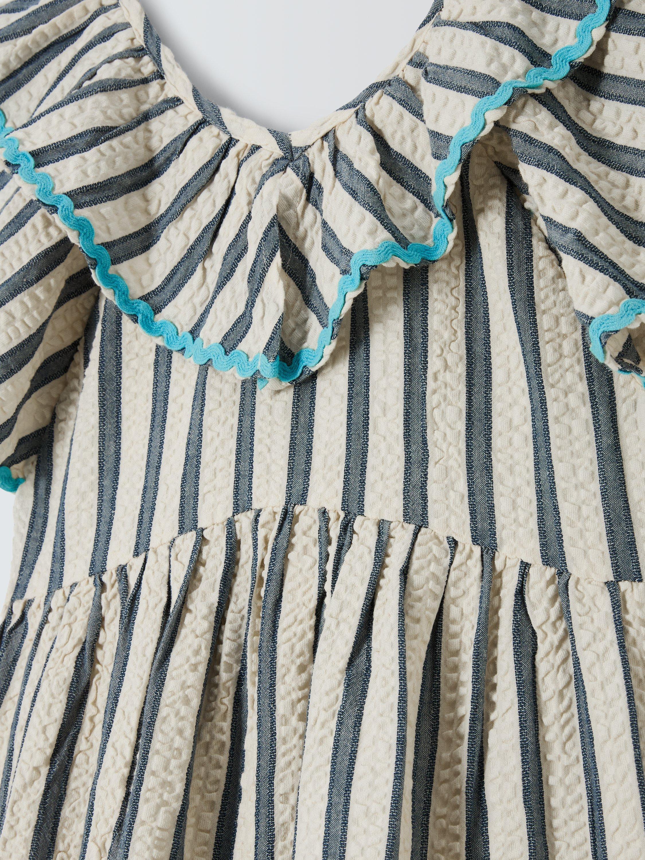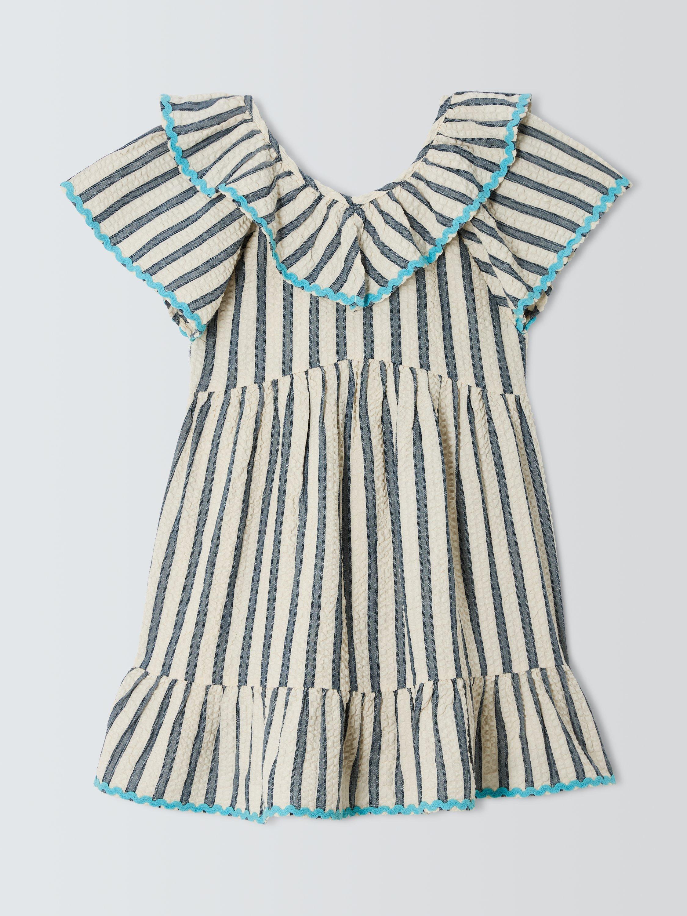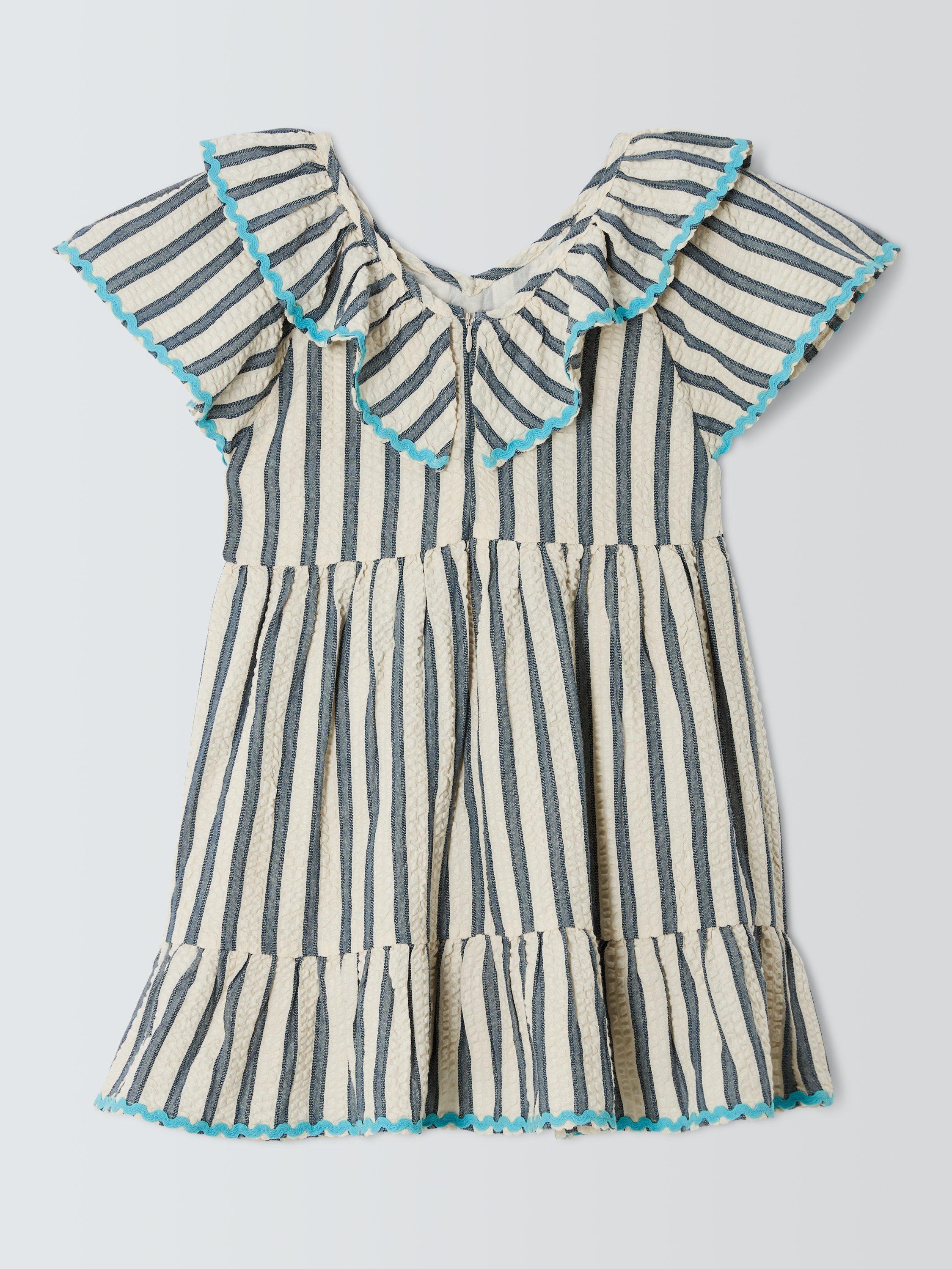 In a super-comfy seersucker texture, this stripey dress comes with fun ruffle detailing.