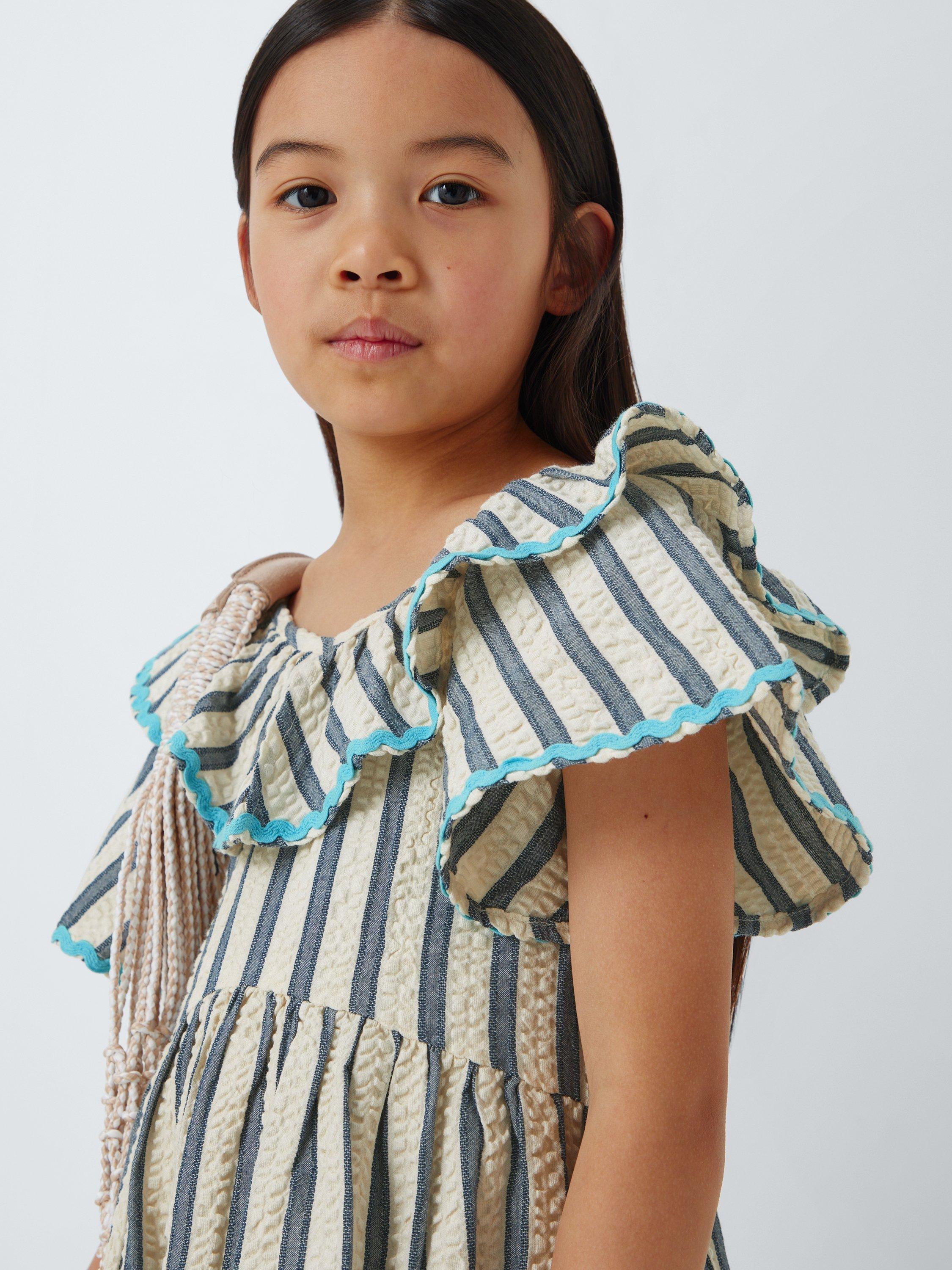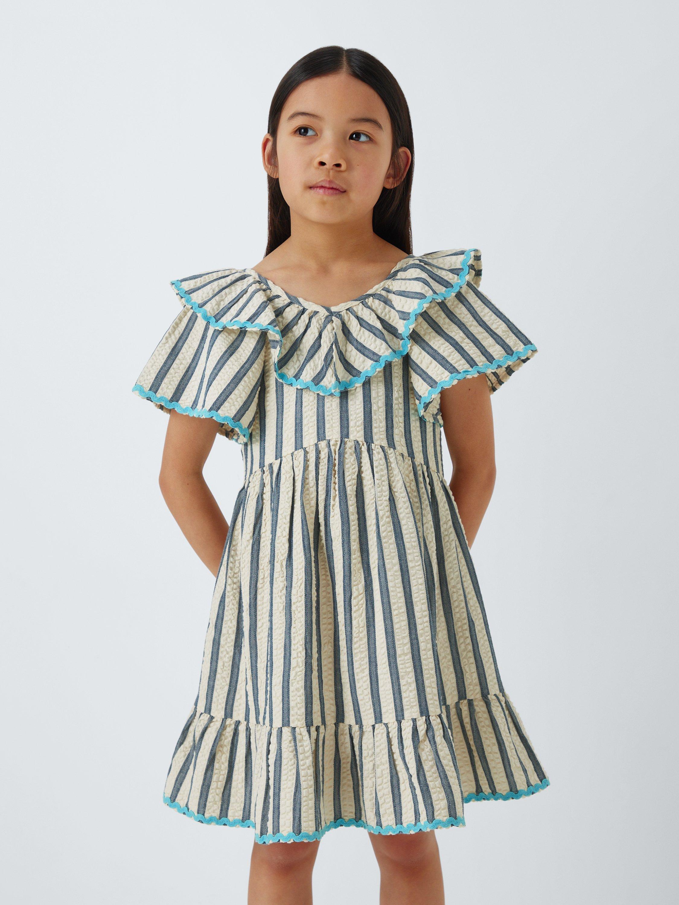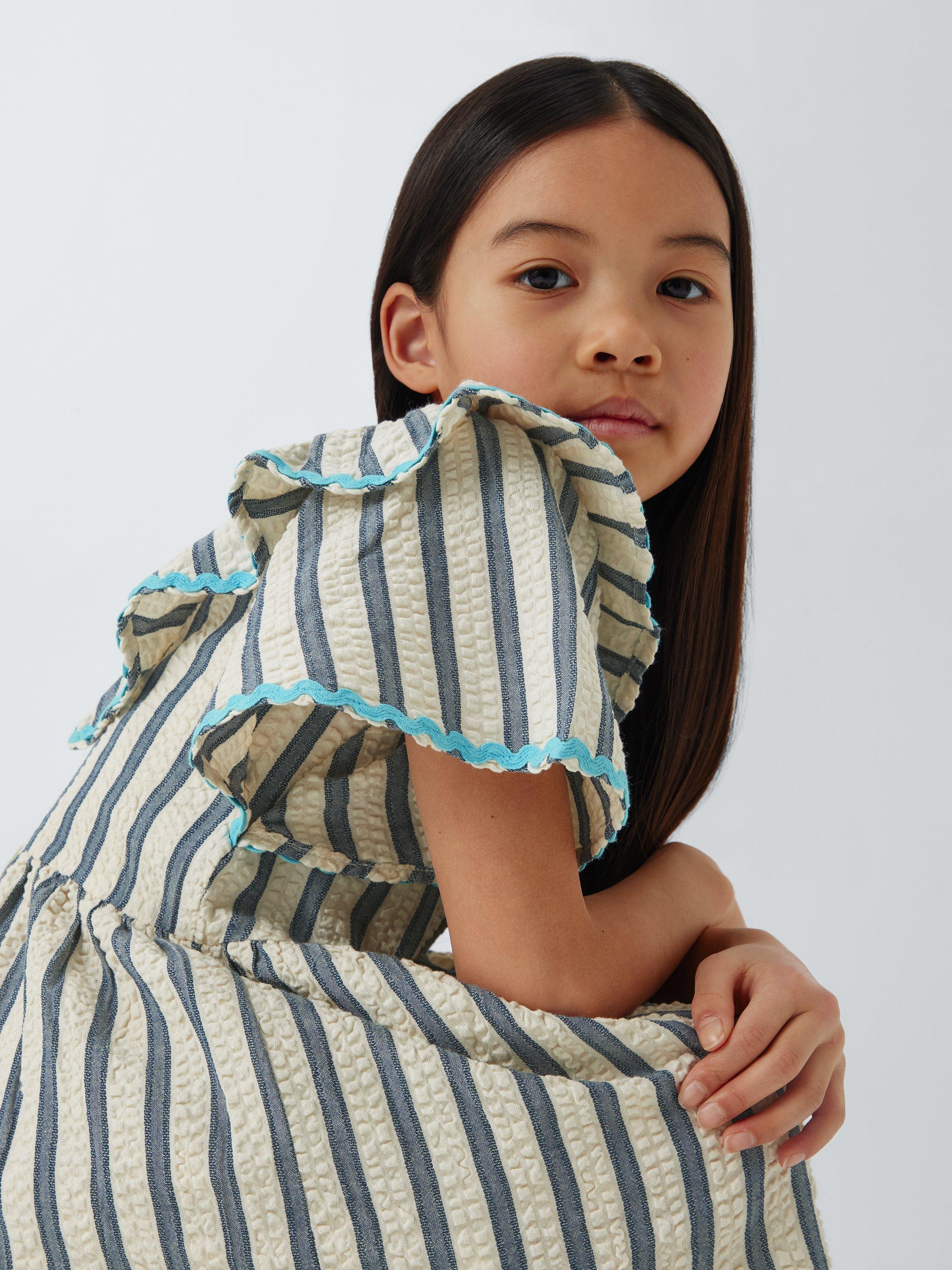 In a super-comfy seersucker texture, this stripey dress comes with fun ruffle detailing.