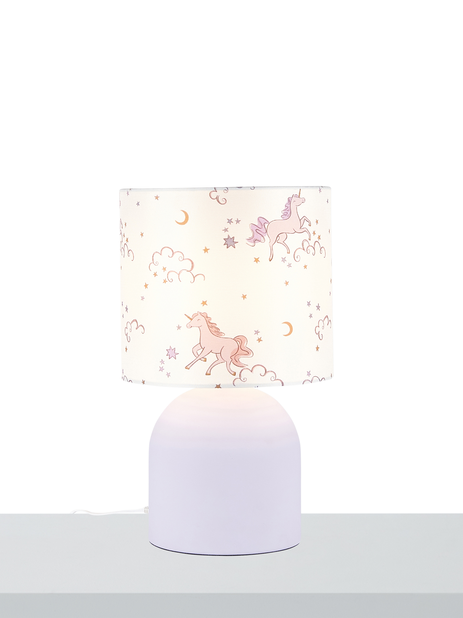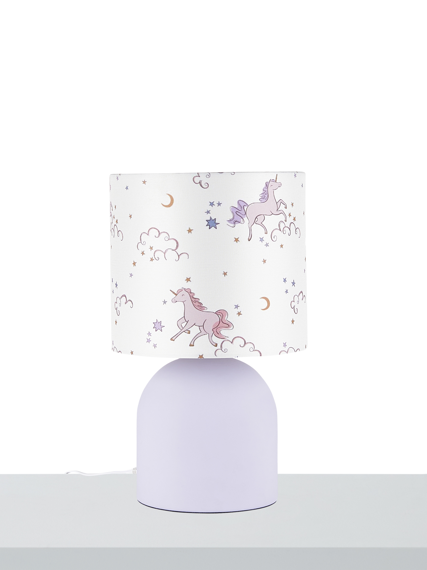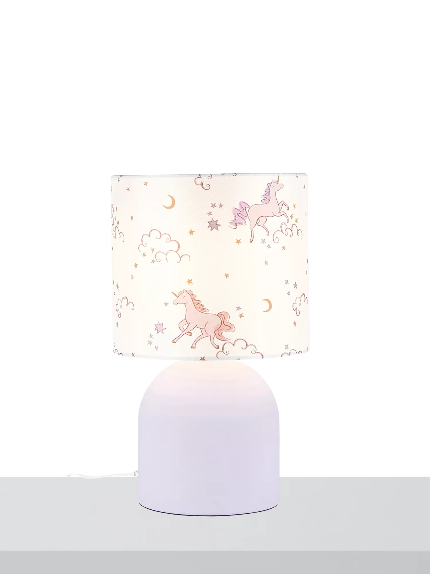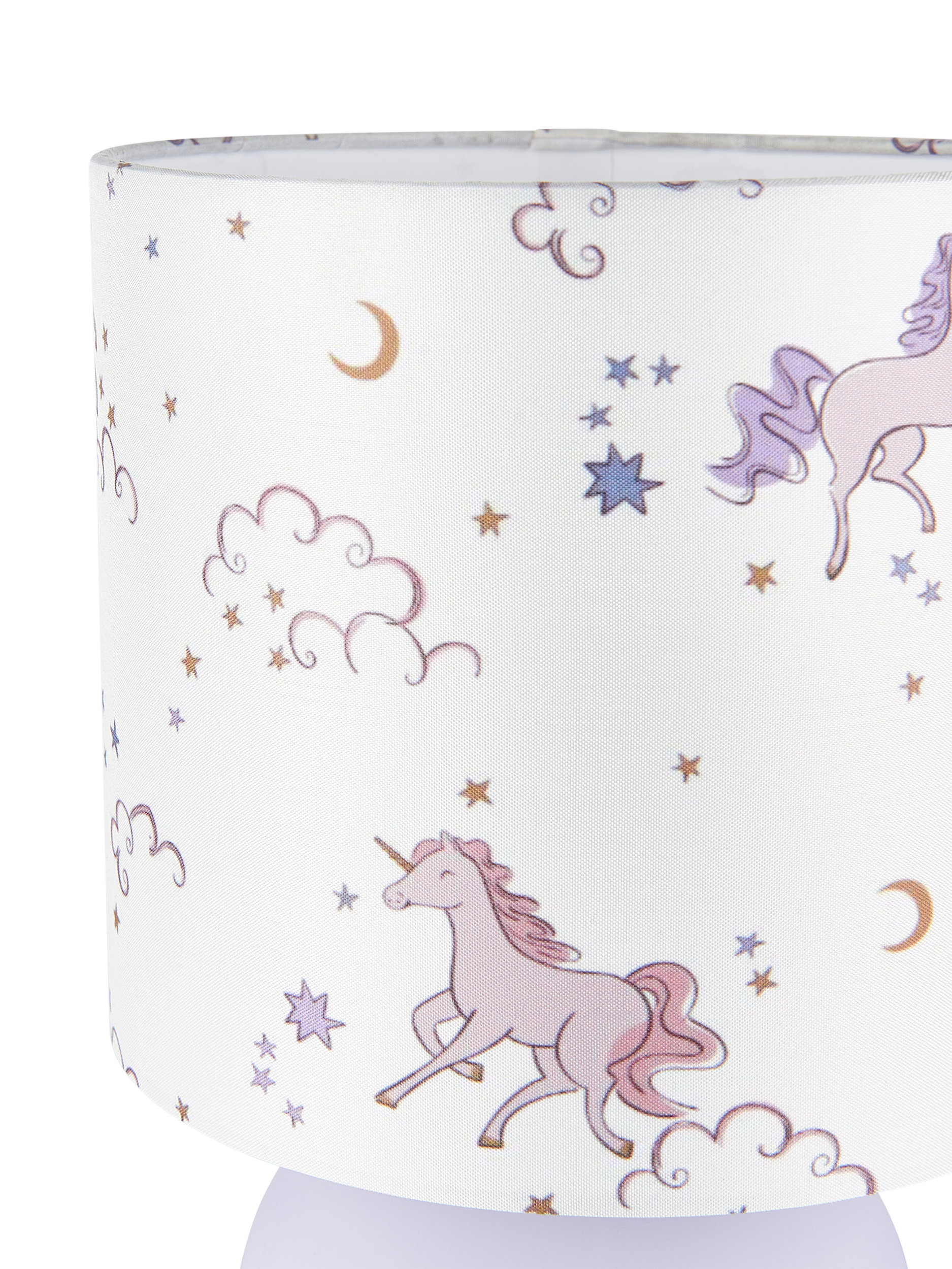 Bedside lamp with a unicorn printed shade and matt finish base.