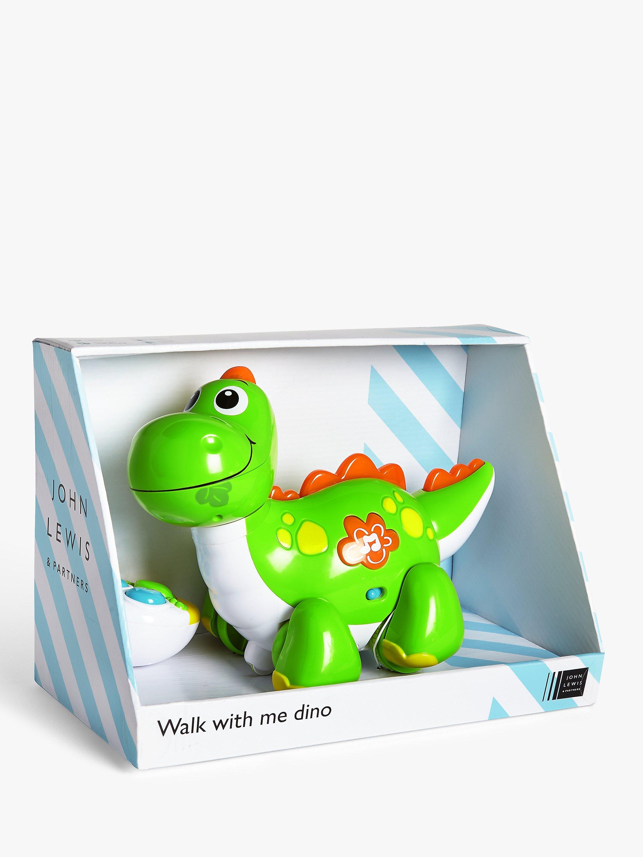 Delight your little one with this infrared remote-controlled dinosaur set. The controller controls forward and backwards walking movements. Press the light-up button on the dinosaur for melodies to create a dance party. As the dinosaur walks, it turns its head and wiggles its tail.
