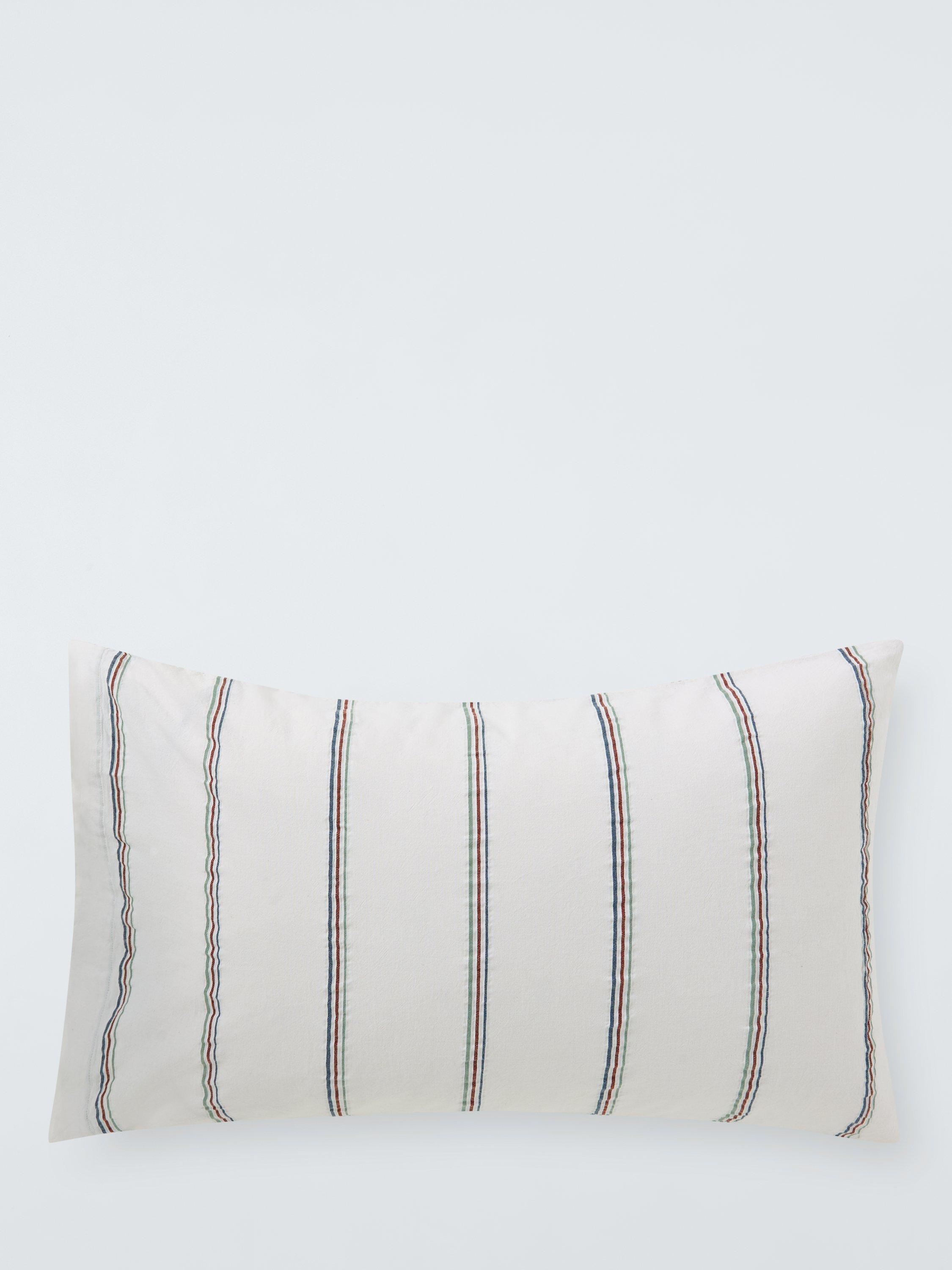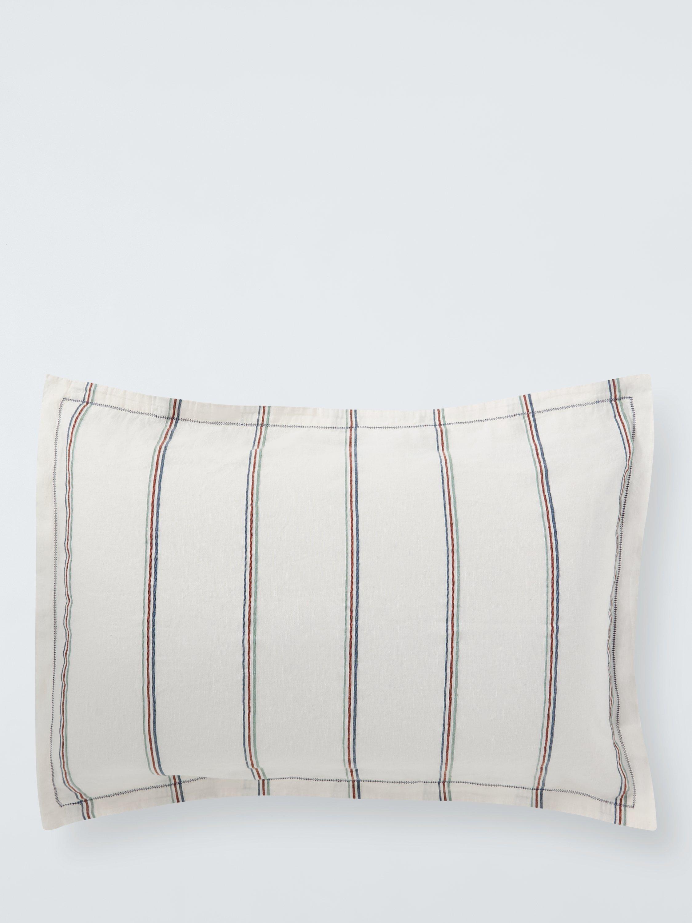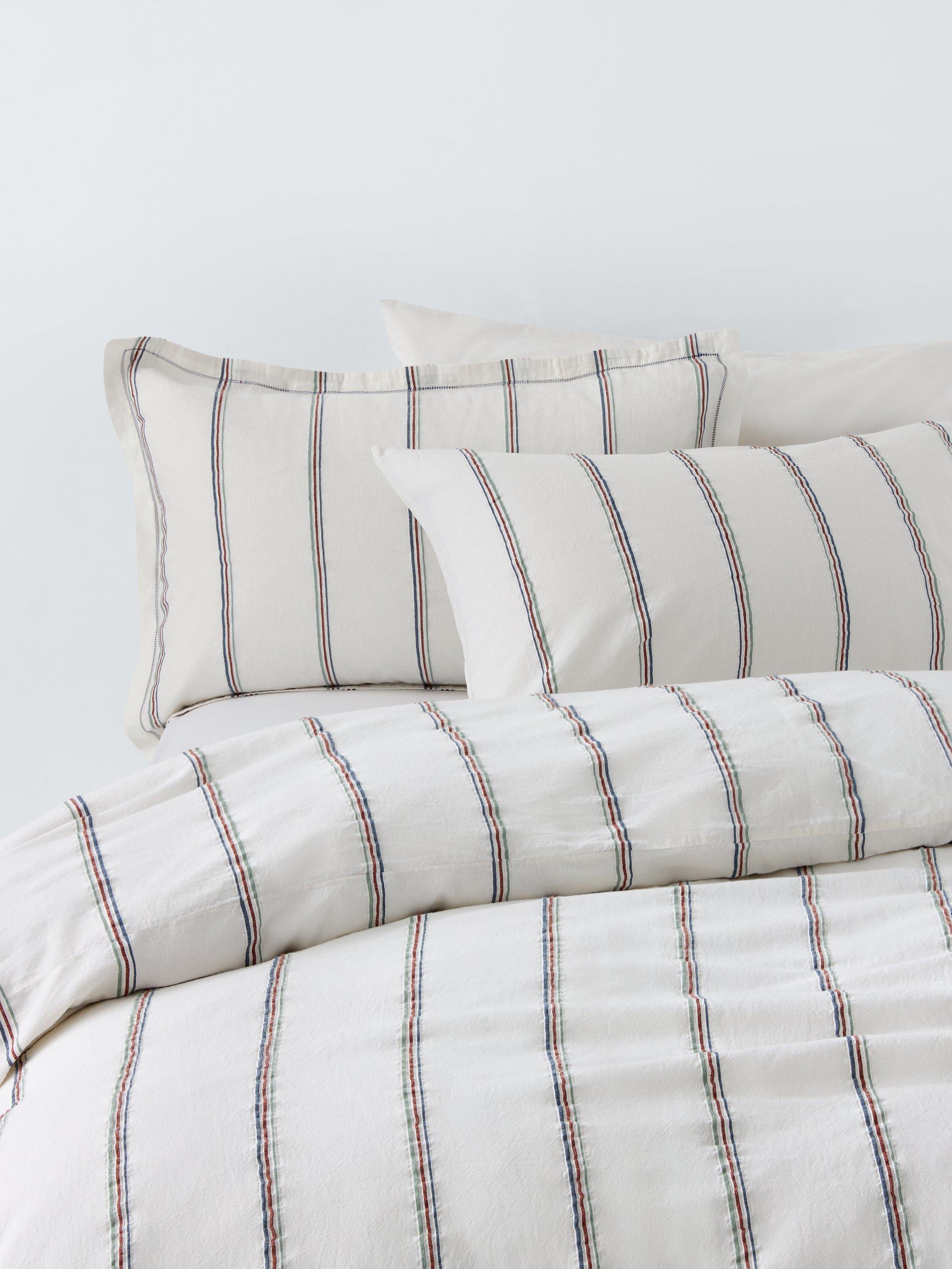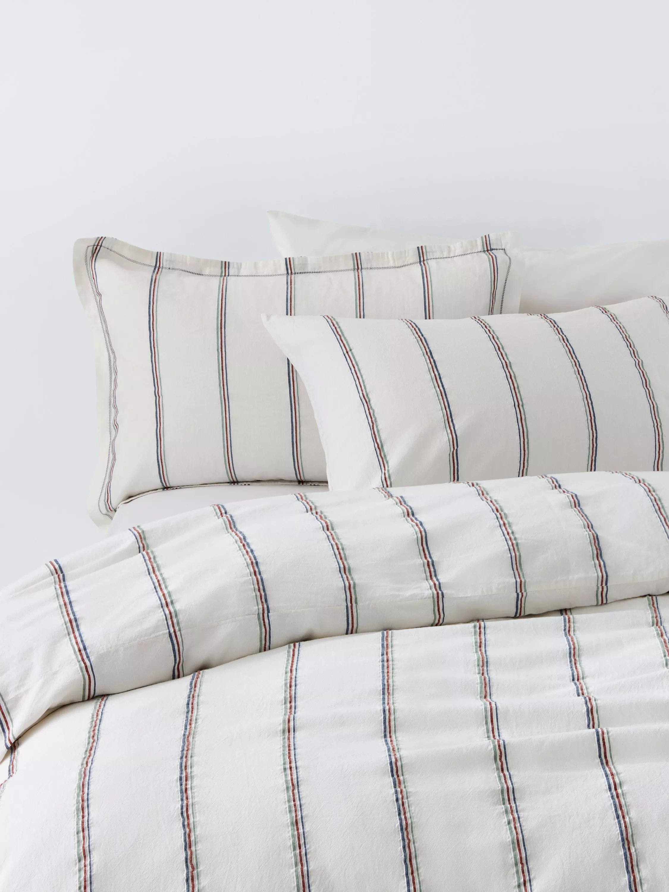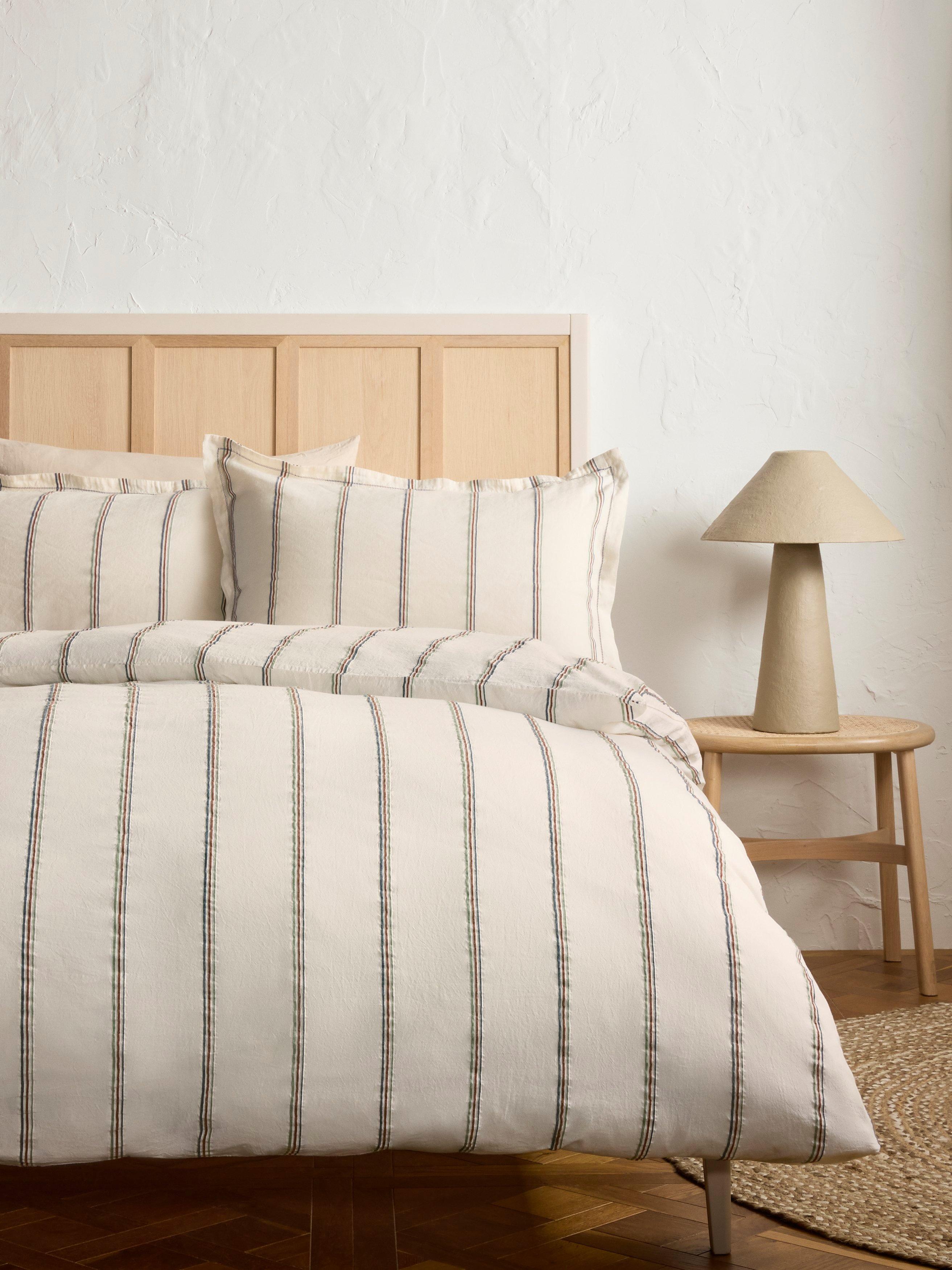 Woven from 100% cotton, this relaxed bedding has a triple stripe design in red, green and blue.