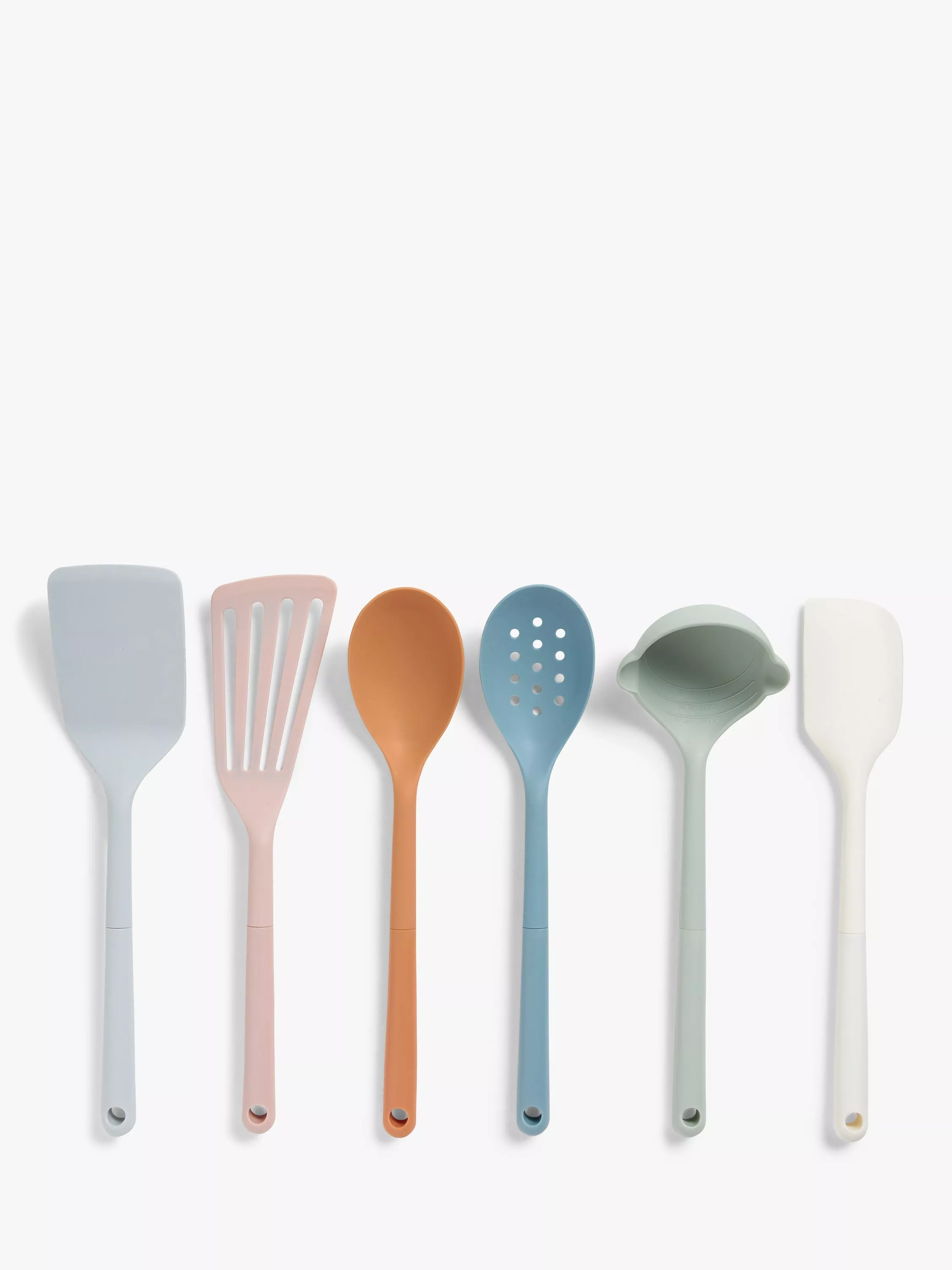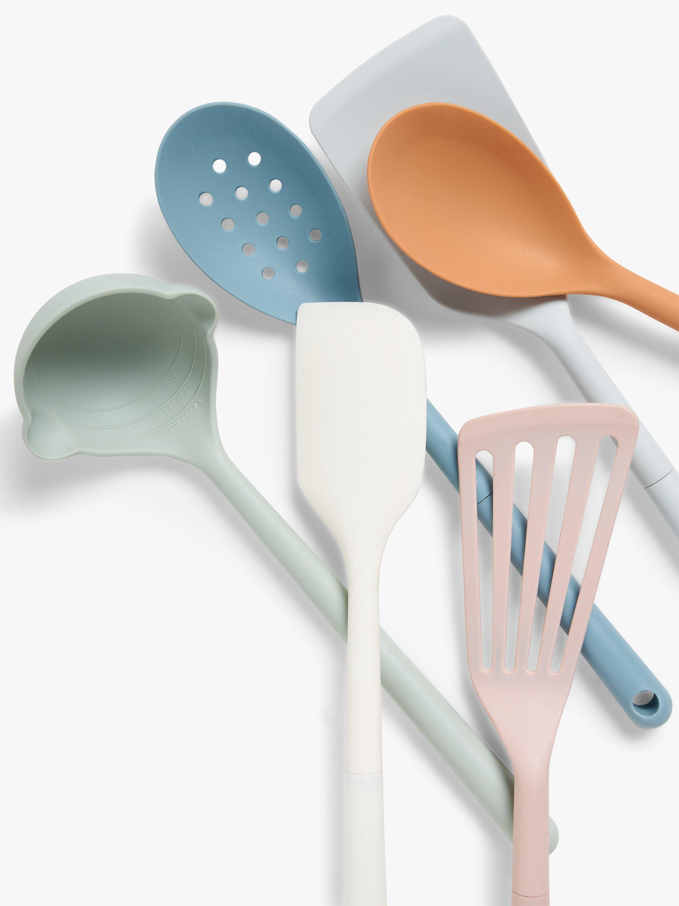 A set of six kitchen utensils with heat-resistant silicone heads for use with any type of cookware, including non-stick. Hang them up by the holes at the top of each handle.