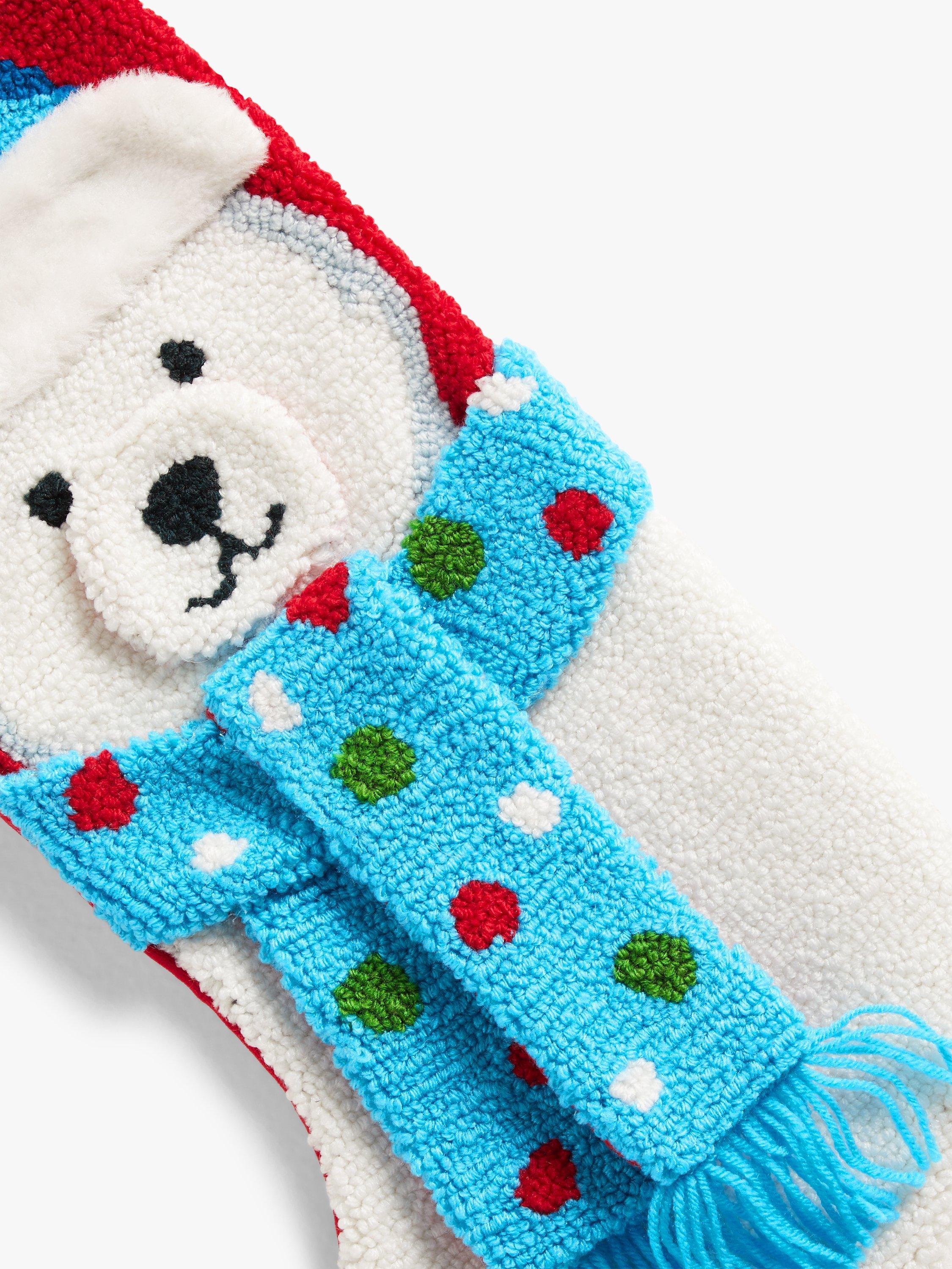This polar bear stocking is hand-hooked and made of soft yarn.