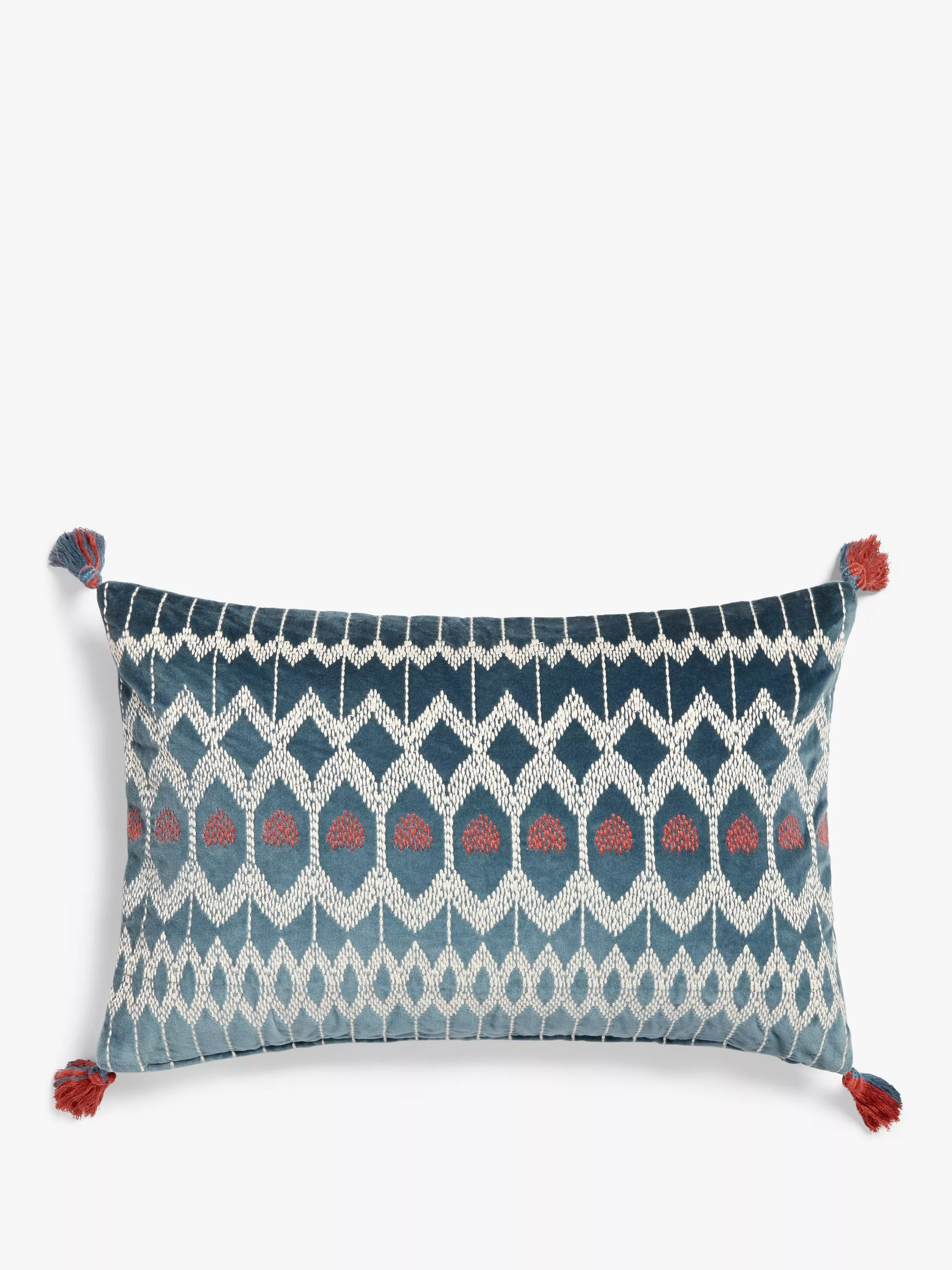 Kuva is an attractive bolster cushion that features machine guided embroidery on a plush velvet background. It's finished with soft tassels at each corner.