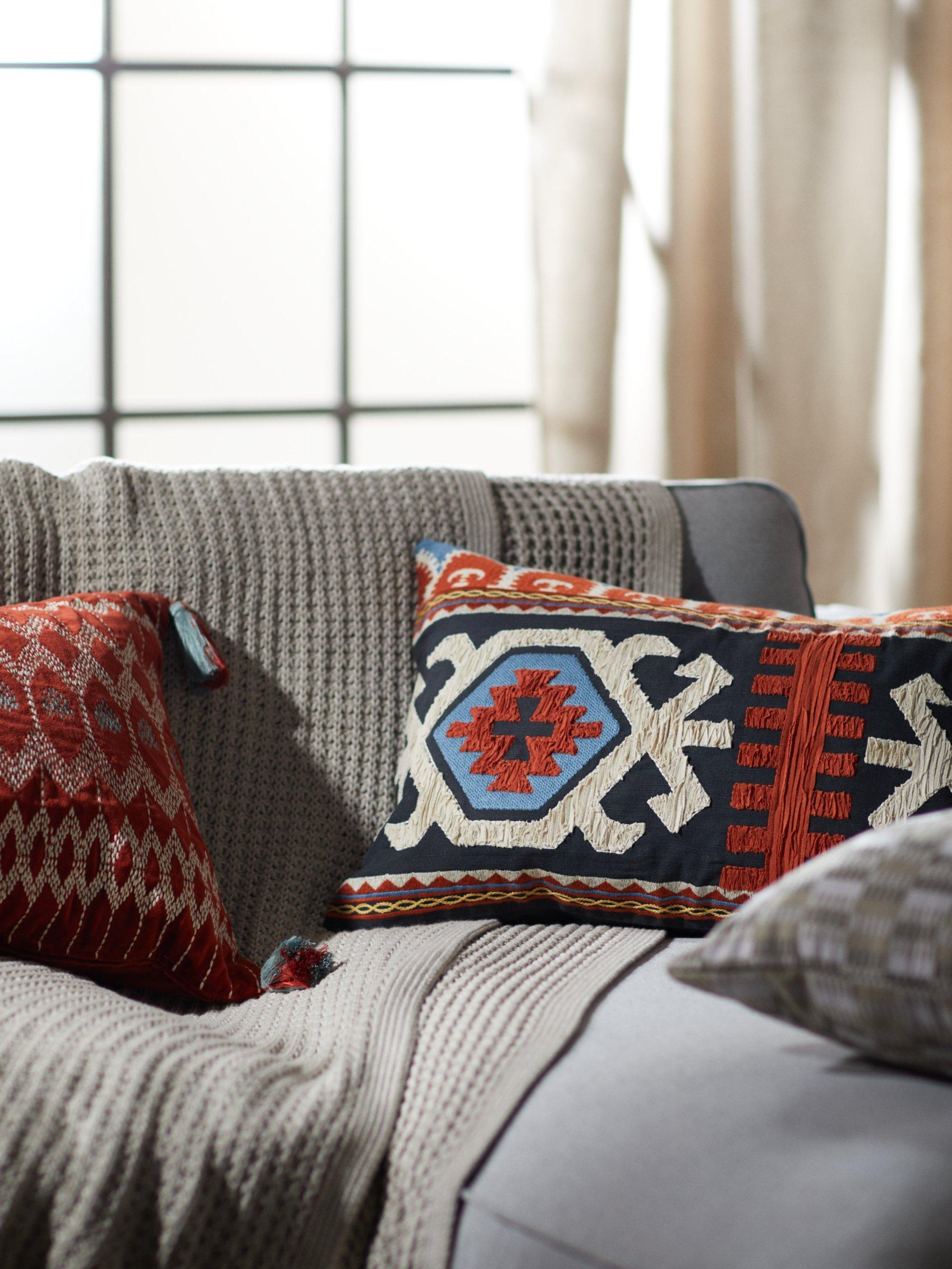 Kuva is an attractive bolster cushion that features machine guided embroidery on a plush velvet background. It's finished with soft tassels at each corner.