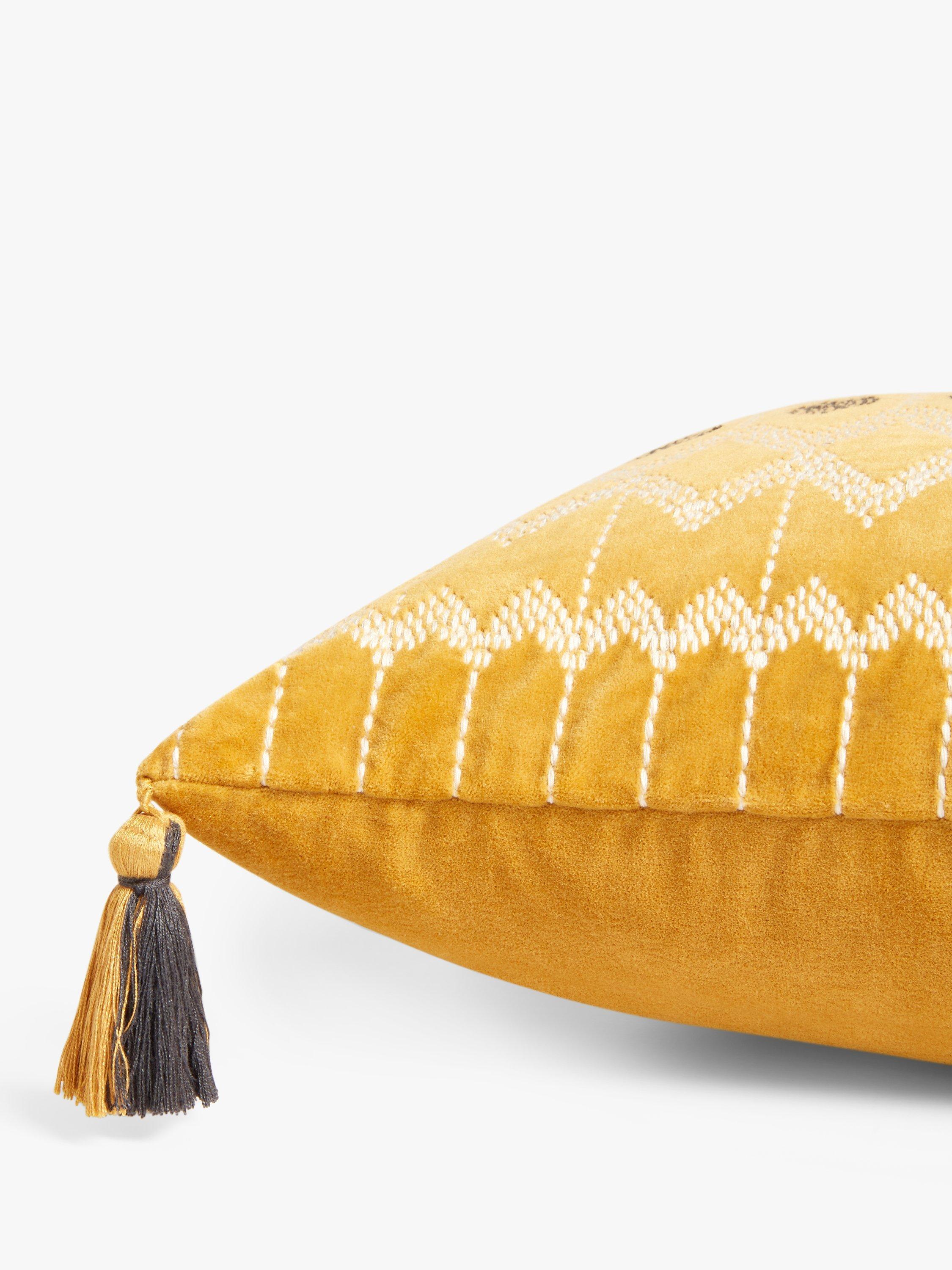 Kuva is an attractive bolster cushion that features machine guided embroidery on a plush velvet background. It's finished with soft tassels at each corner.