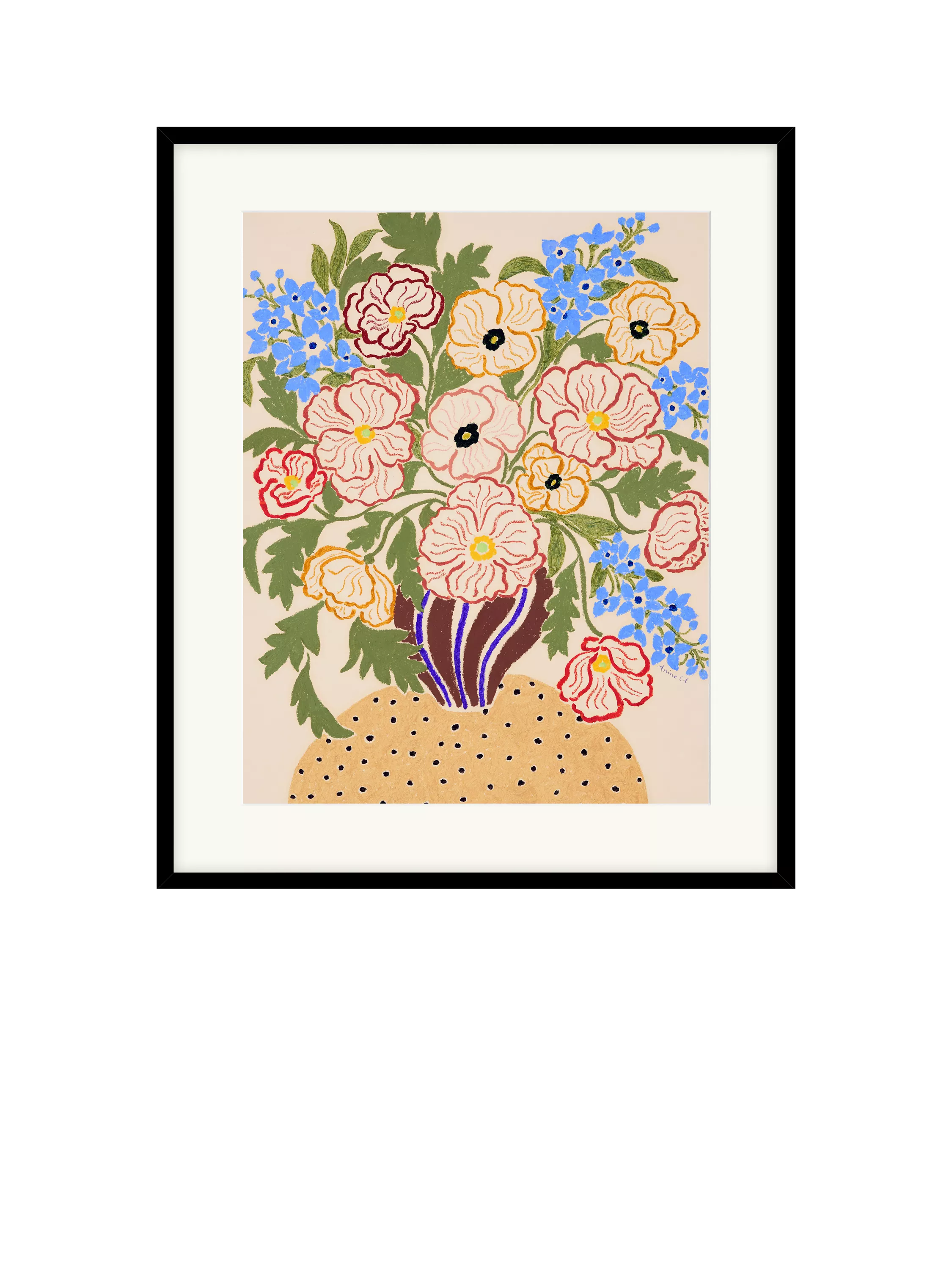 Framed floral print by La Poire. Made in the UK, the print is glazed, set behind a mount and presented in a contemporary black frame, ready to hang on your wall.