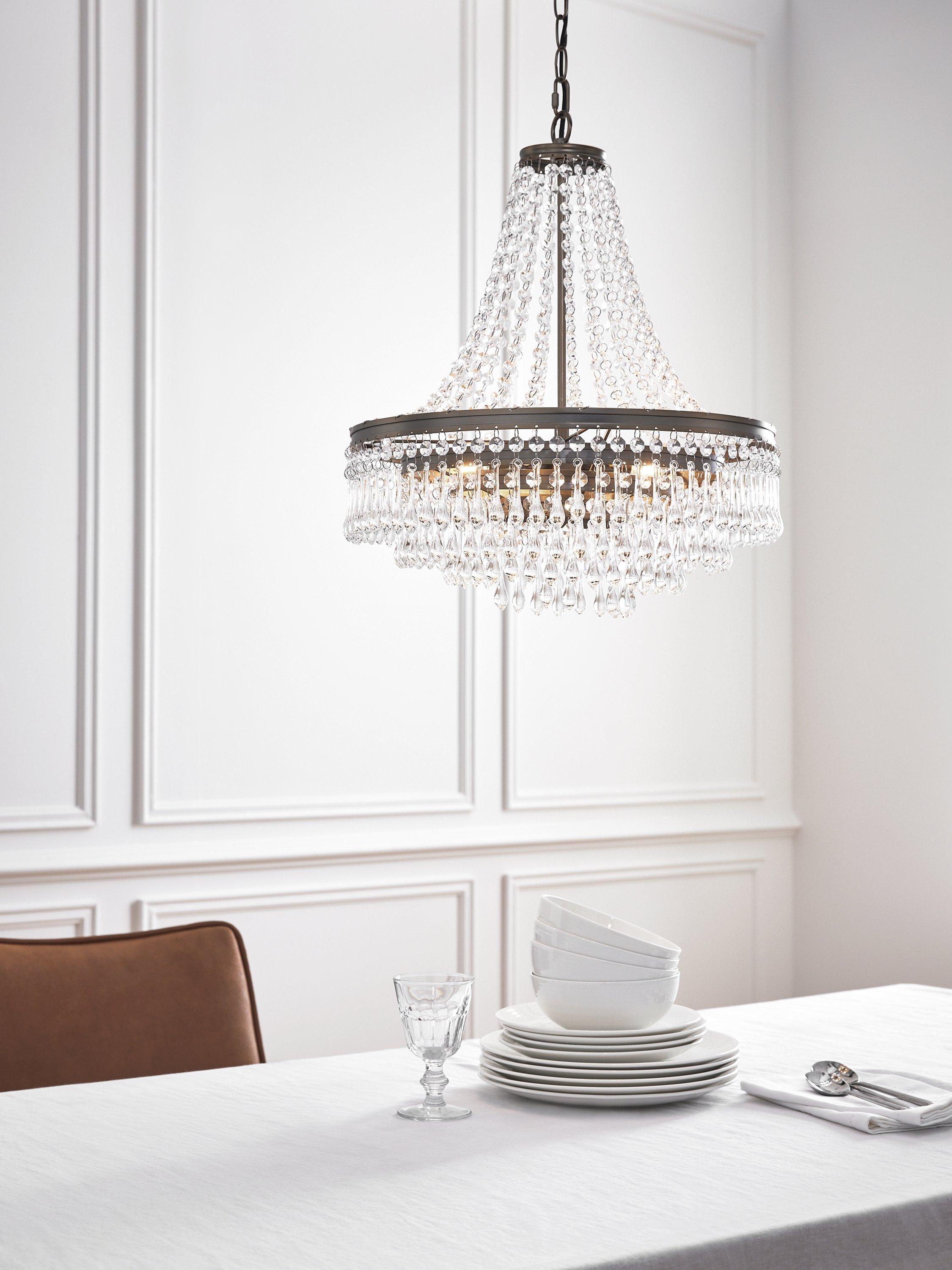 Our La Scala statement size chandelier is a contemporary take on a timeless and well loved style. It's formed of concentric rings and opulent layers of faceted and clear crystal droppers which cascade into shape below its elegant swag top.