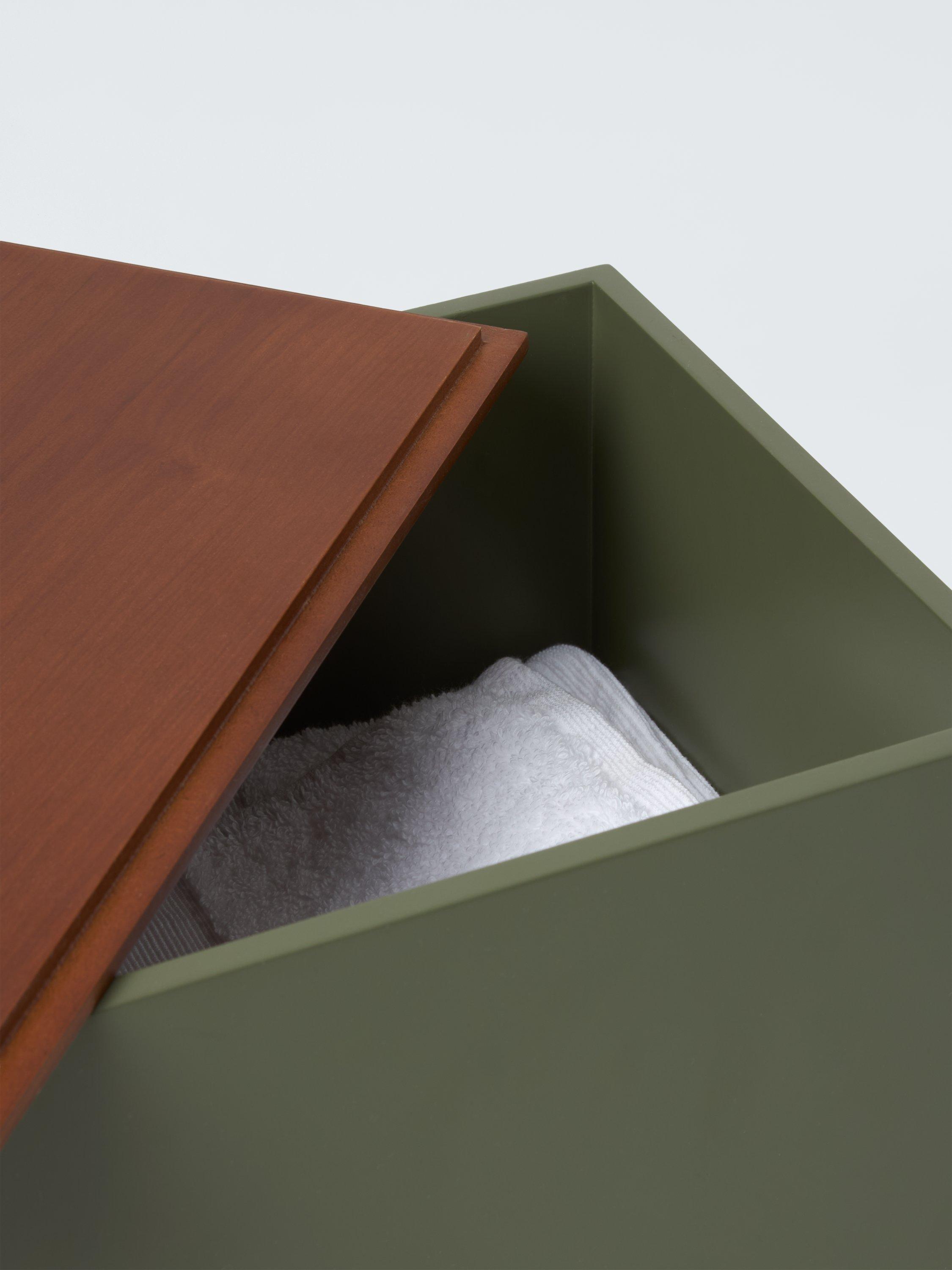 Perfect for storing kitchen, cleaning or bathroom accessories, this lacquered box comes with an ash veneer lid that fits flush with the sides for a neat profile.