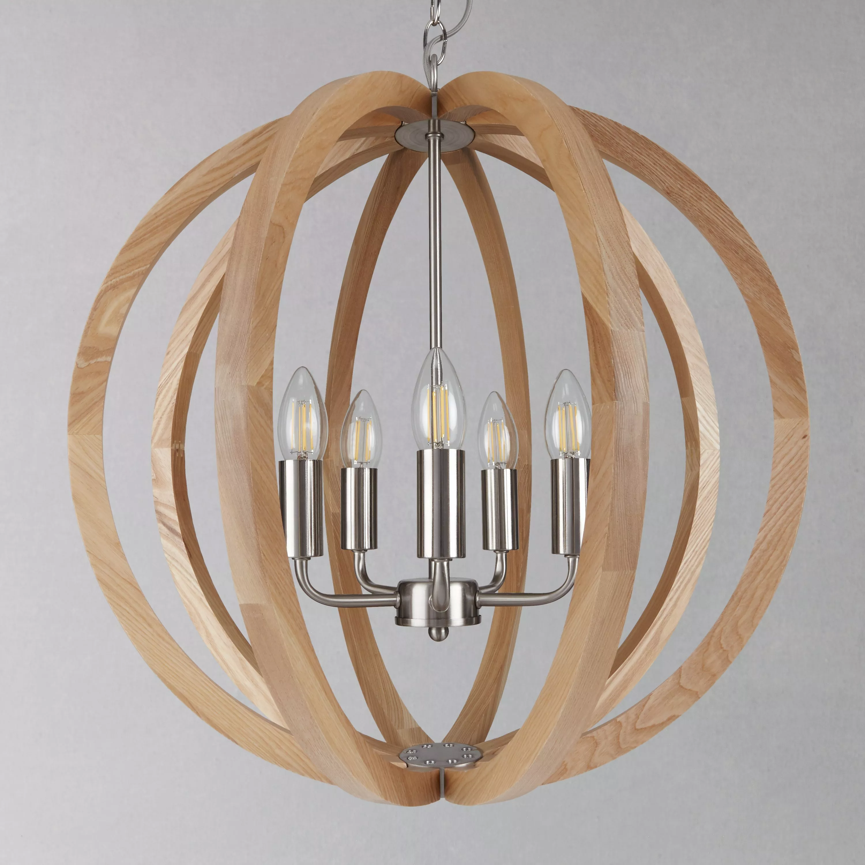 Accent your space with our Lars ceiling light. This striking fitting is designed with a natural wooden hoop frame, that surrounds the suspended multi-armed light source. Combining appealing wood grains and satin nickel detailing, this tactile piece offers a warm lighting effect and eye-catching style.