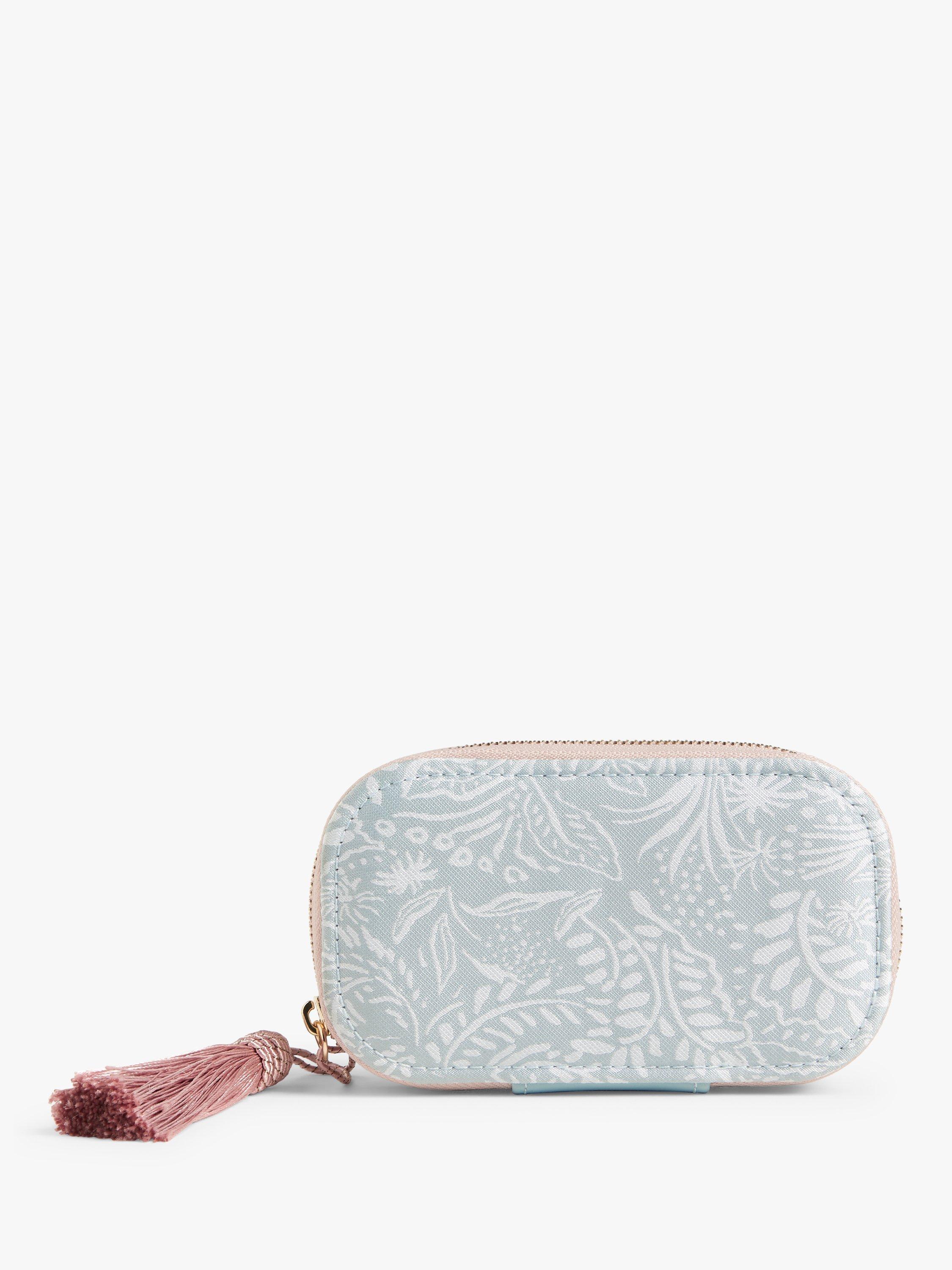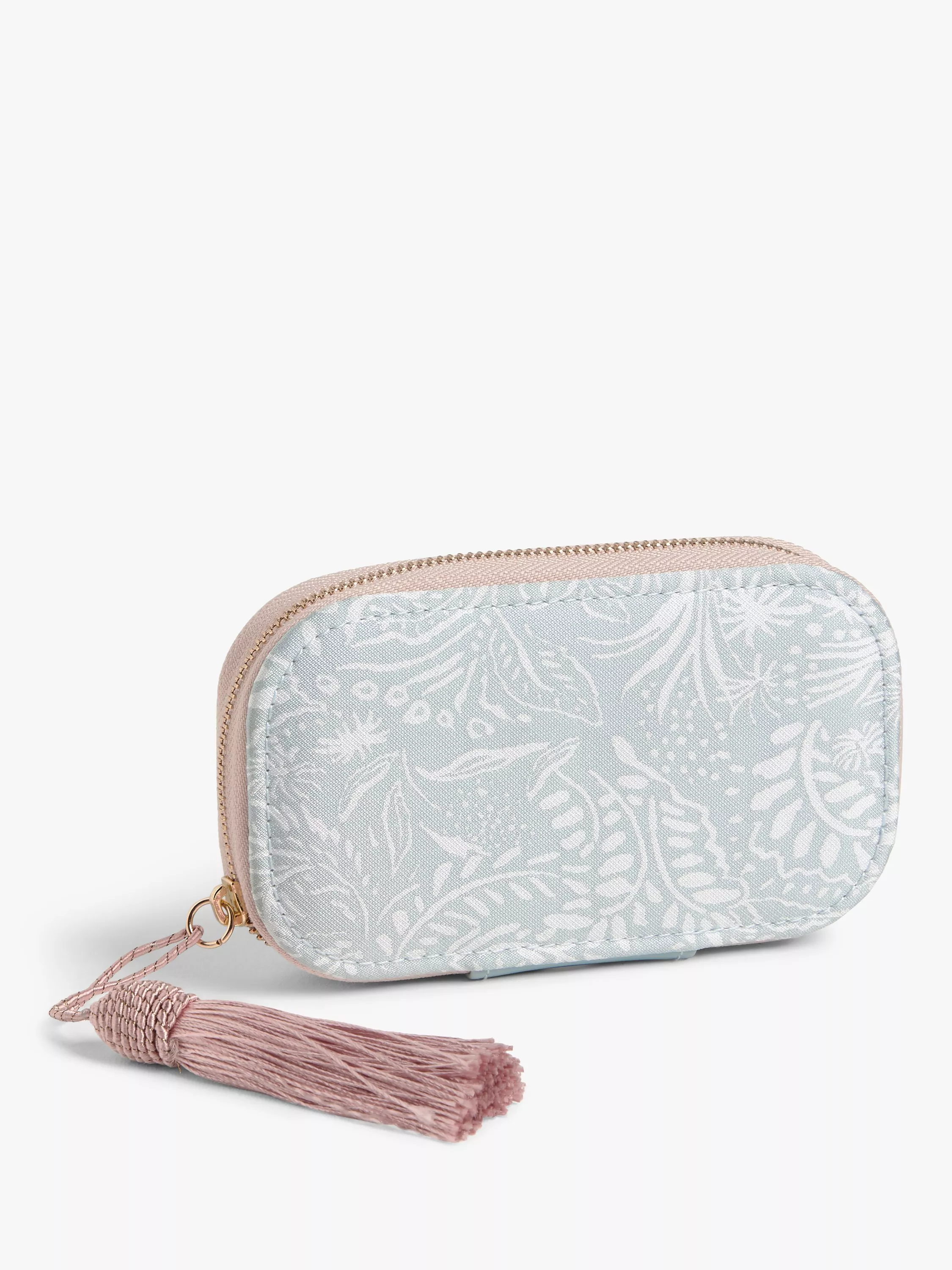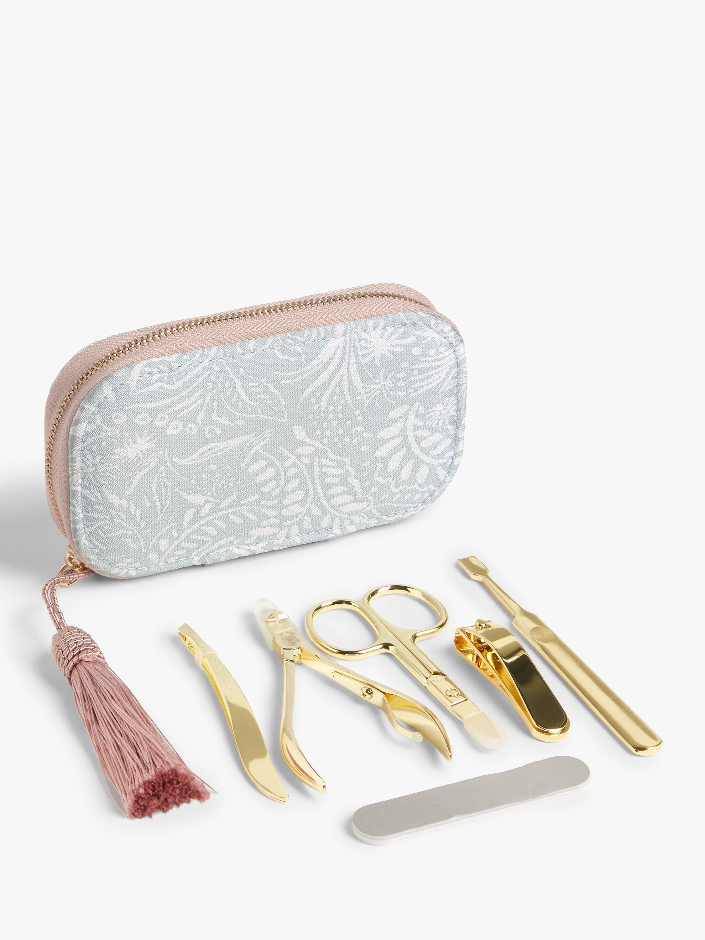 Adorned in an intricate, leaf print on the outside with tassel zip pull, this set has all you need for a mini manicure session.