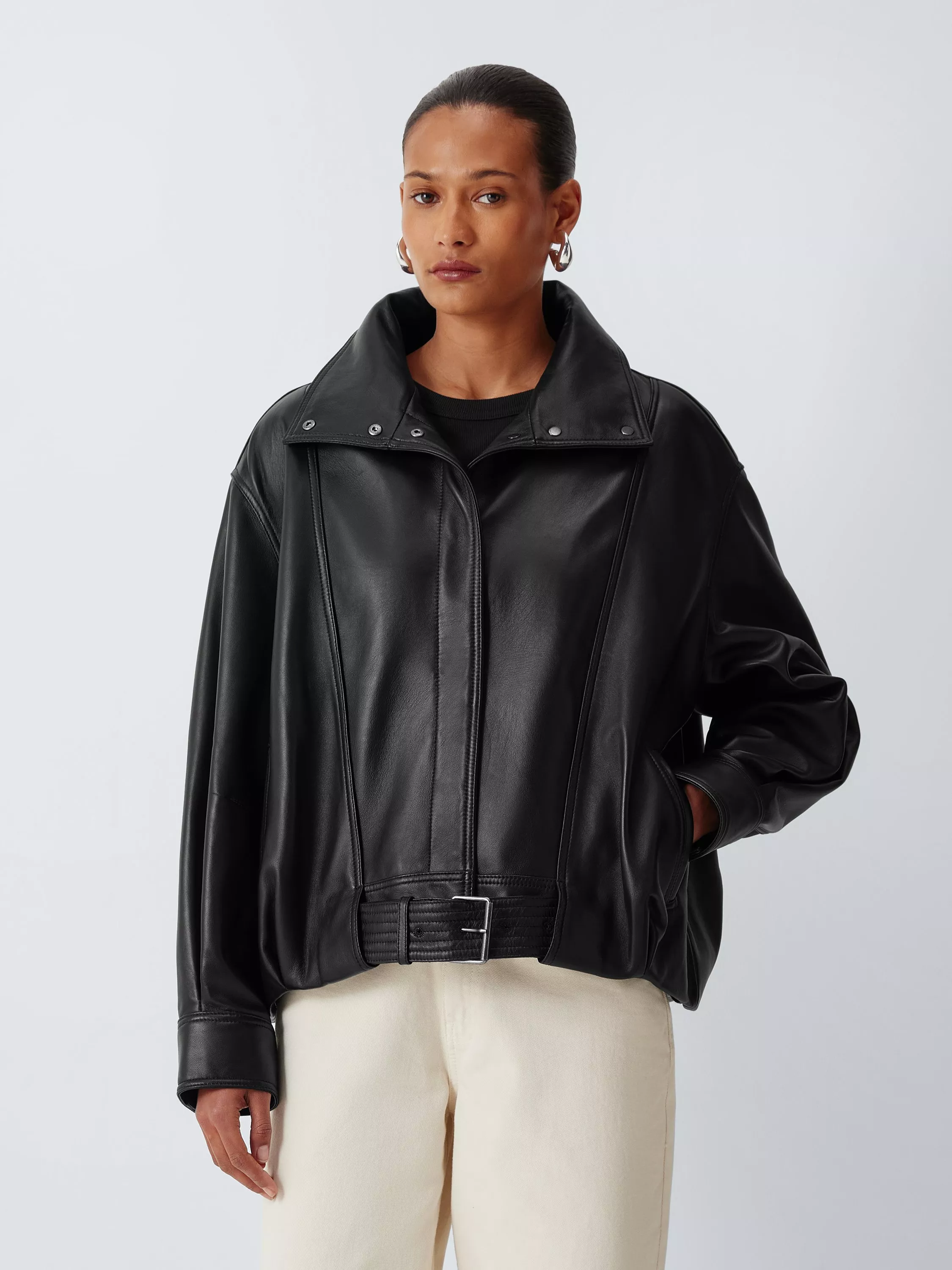 Modern structure meets a classic silhouette in this leather bomber jacket, defined by its buckled waist belt. This standout design allows you to effortlessly toggle between a sharp, cinched profile and a relaxed, urban aesthetic, offering a versatility that feels entirely personal.