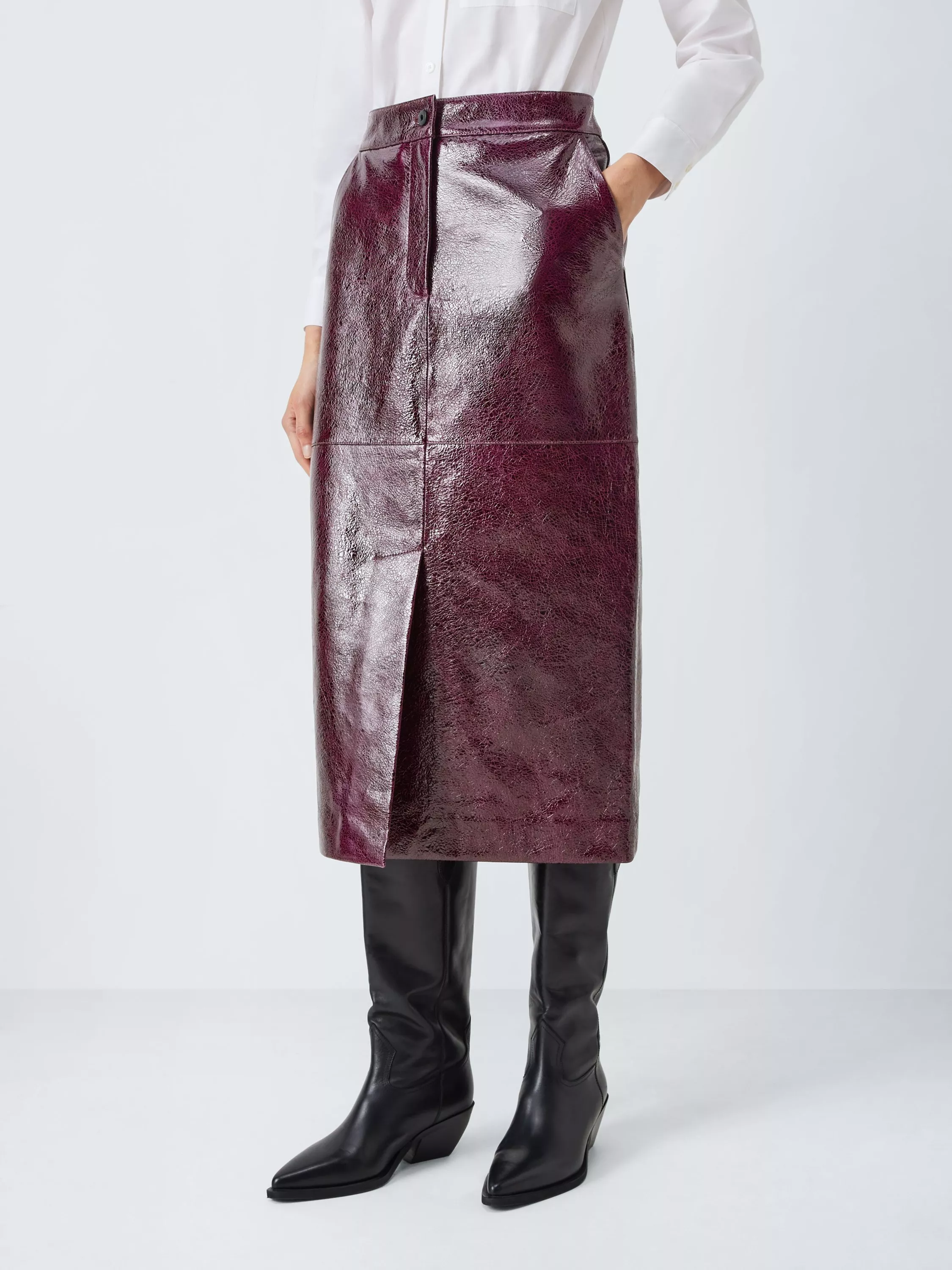 Midi-length leather pencil skirt with two side seam pockets and a single button and zip fastening. A versatile style, go for a chic daytime look, paired with a tucked-in blouse, or for a more casual vibe, try chunky knitwear and trainers. Matching leather jacket available.