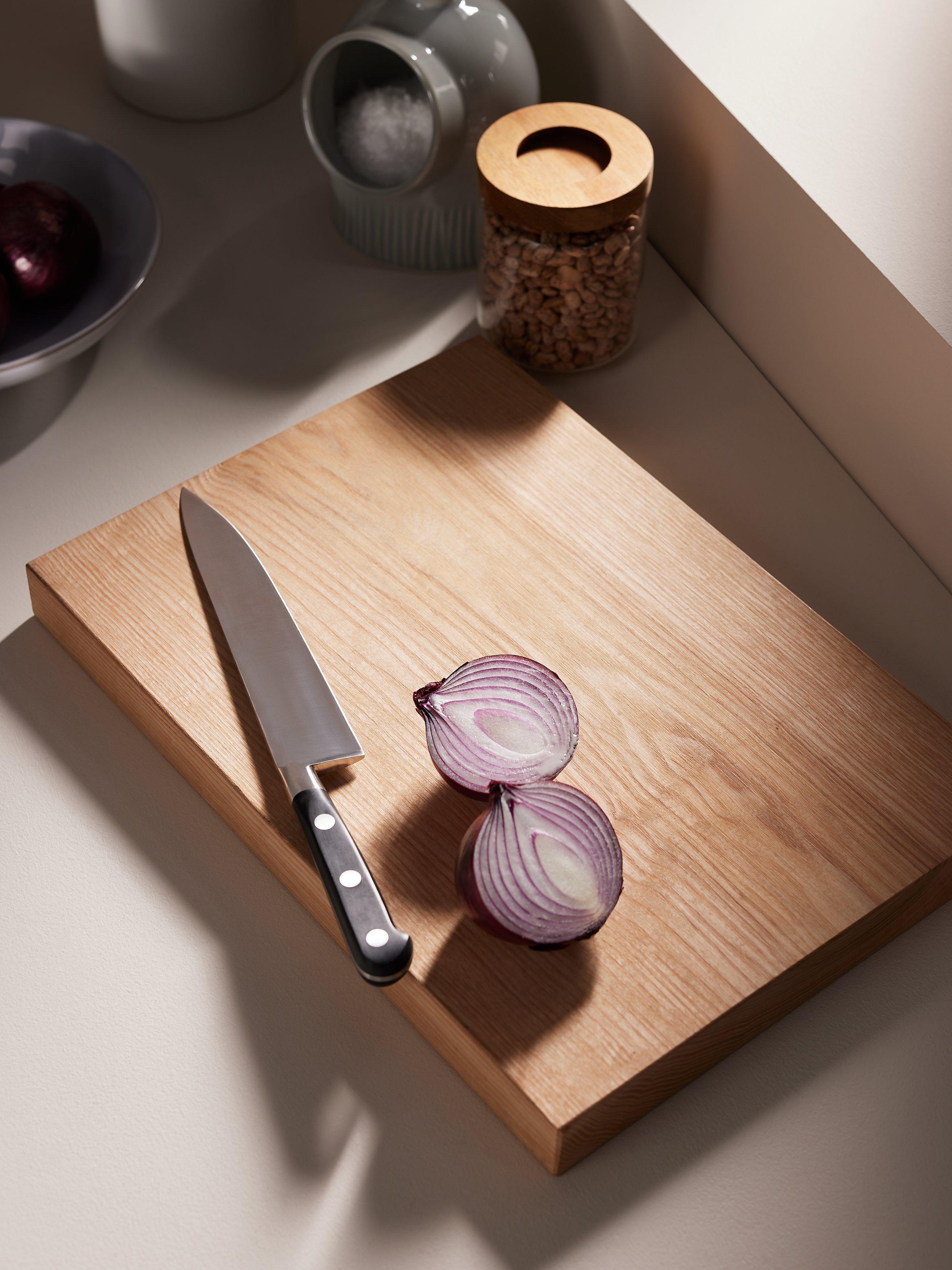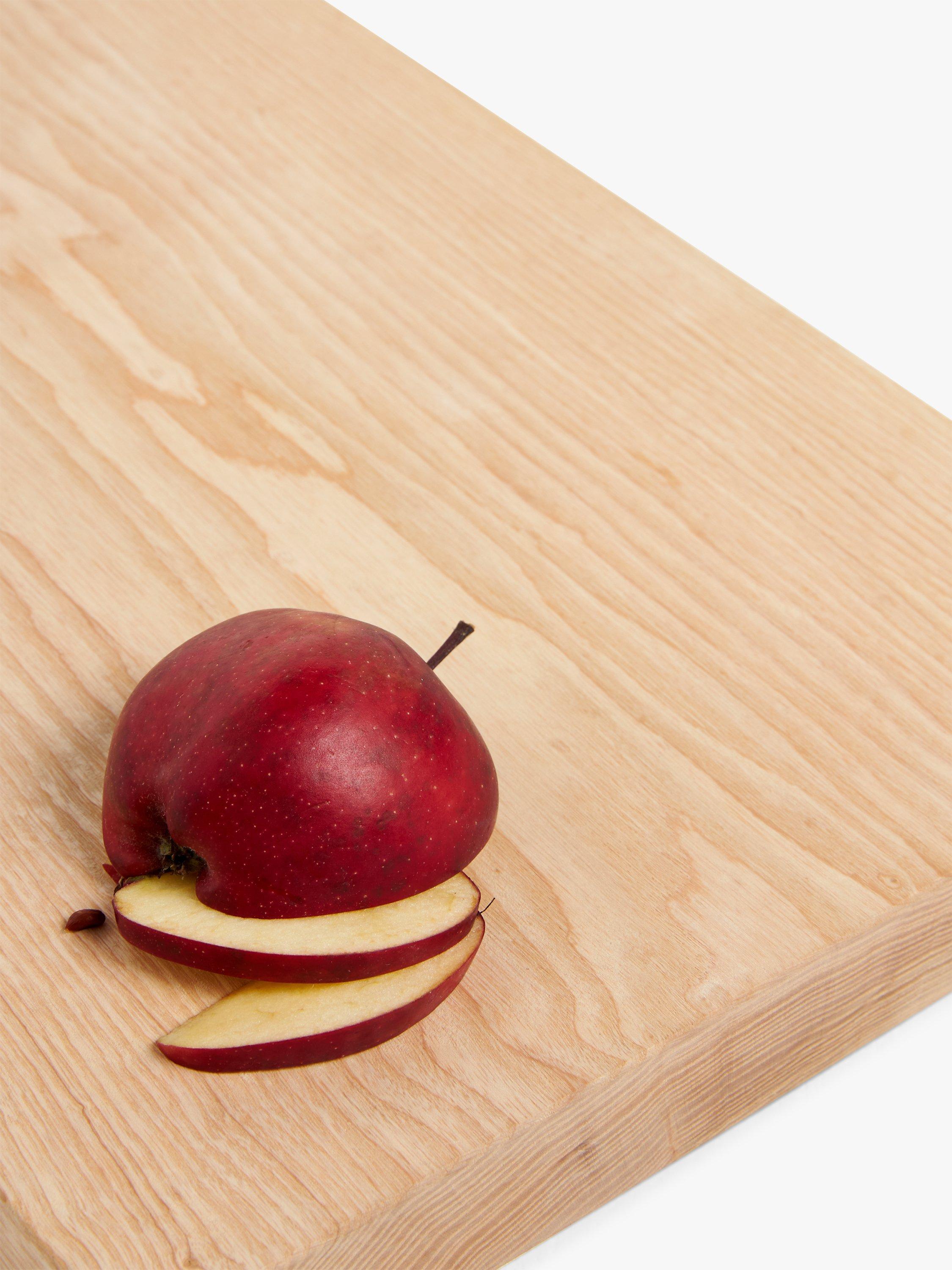 Designed with squared edges, this rectangular chopping board is made of light-toned ash wood. It's handmade from ash trees felled from the Duchy Estate in Herefordshire and Leckford Farm, part of the Leckford Estate in Hampshire, farmed by the John Lewis Partnership for over 90 years.