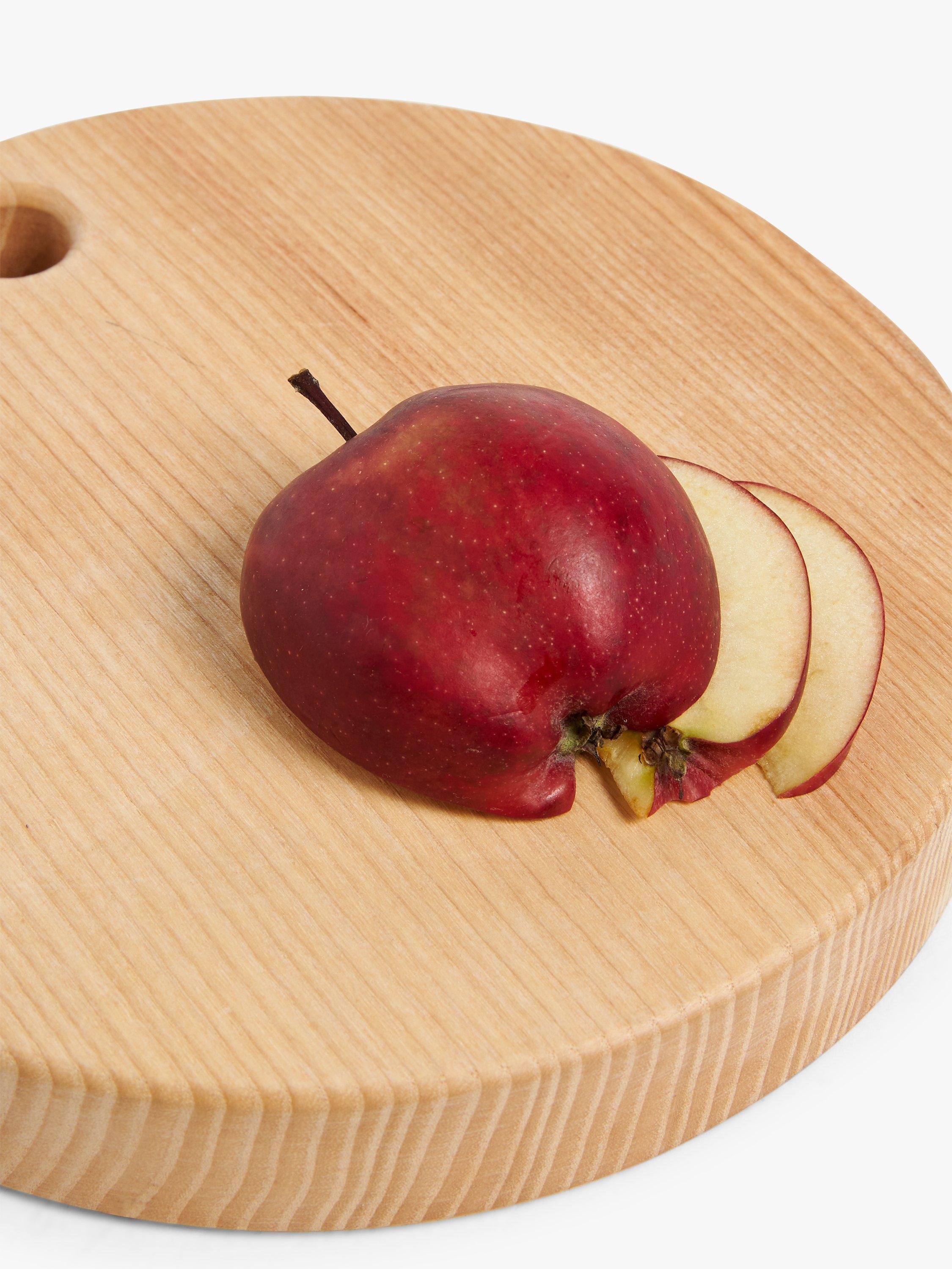 Designed with hanging up hole, this round chopping board is made of light-toned ash wood. It's handmade from ash trees felled from the Duchy Estate in Herefordshire and Leckford Farm, part of the Leckford Estate in Hampshire, farmed by the John Lewis Partnership for over 90 years.