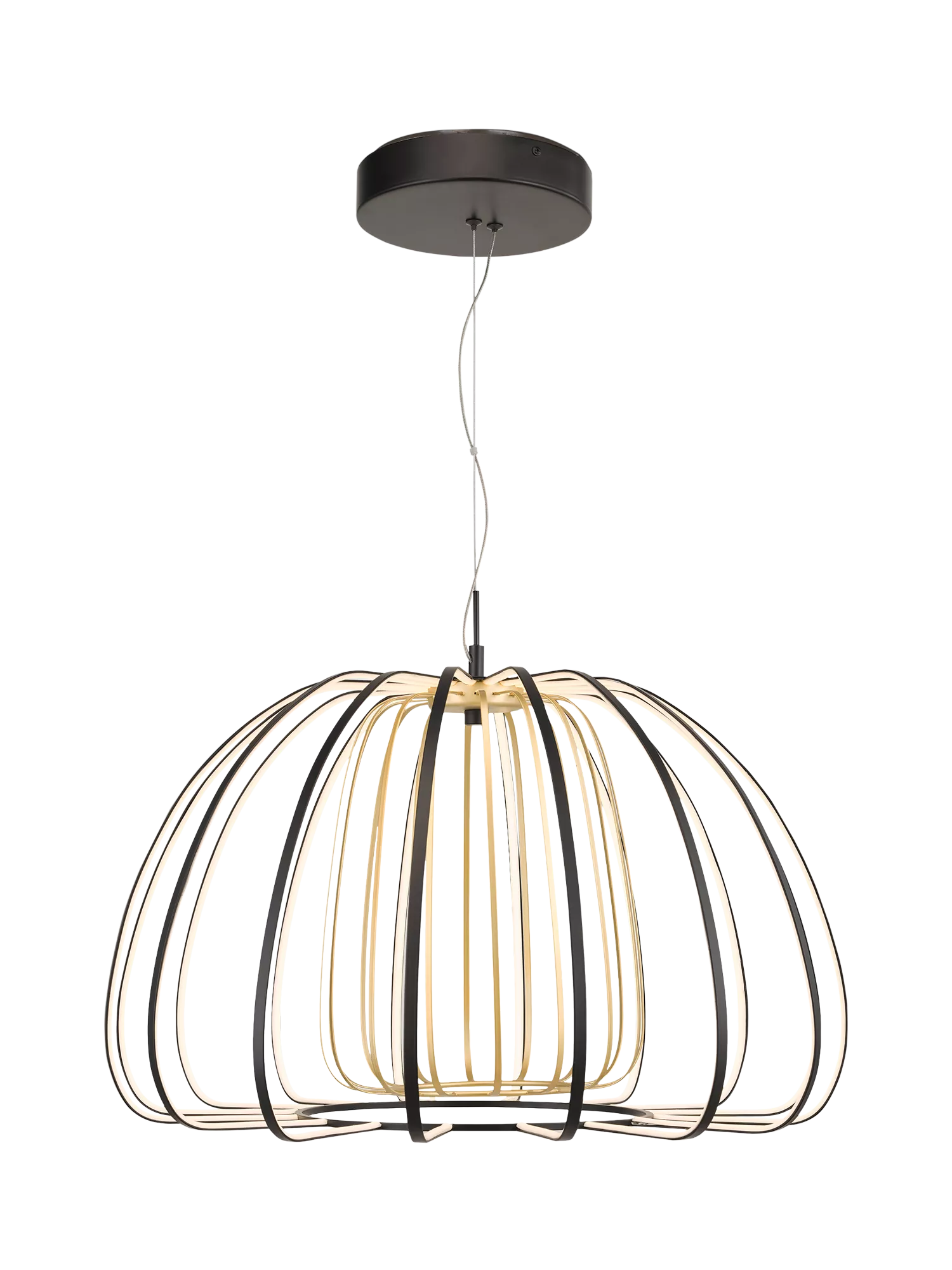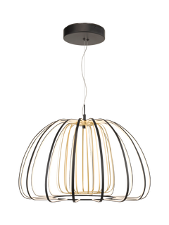 The LED Ribbon Pendant is a stunning contemporary design formed with high-tech, low-energy lights. Its black linear pumpkin shape creates the wow factor as the contrasting colour inner cage is lit up. Ideal over a dining table and great for modern minimalist interiors.