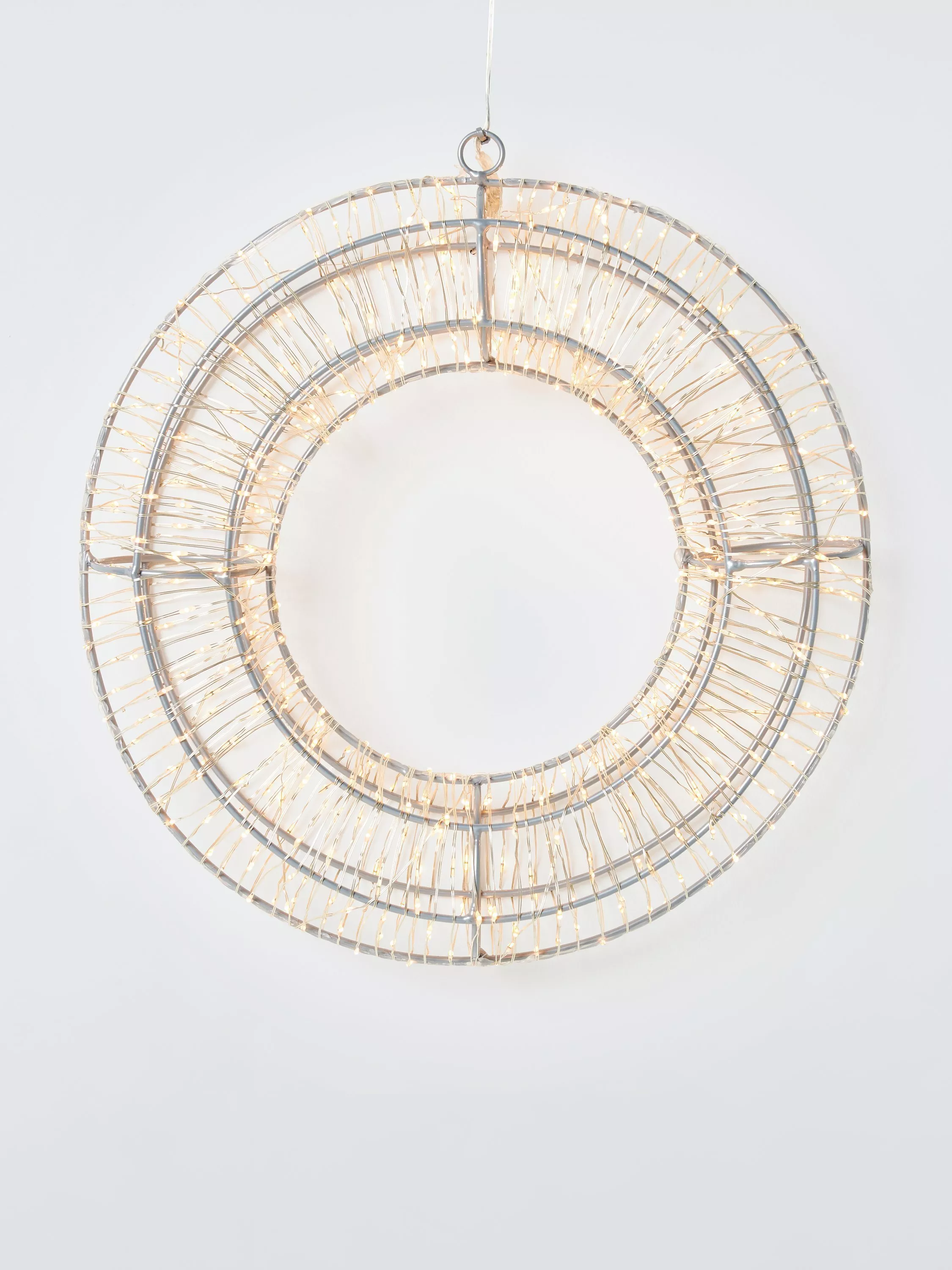 This simple and beautiful contemporary lit wreath is lit with warm white LEDs and comes with a timer that automatically switches the lights on at the same time each day and off after 8 hours.