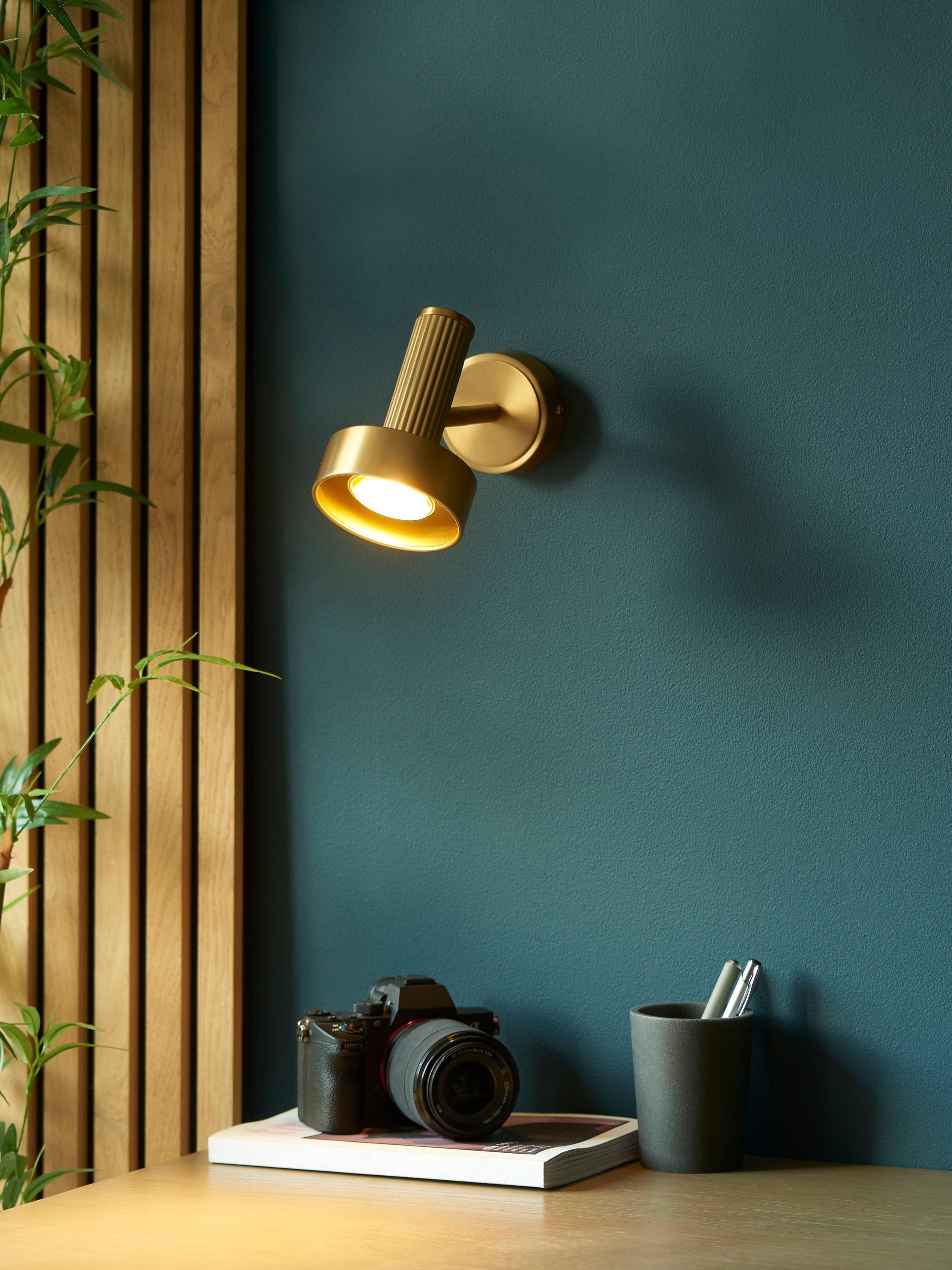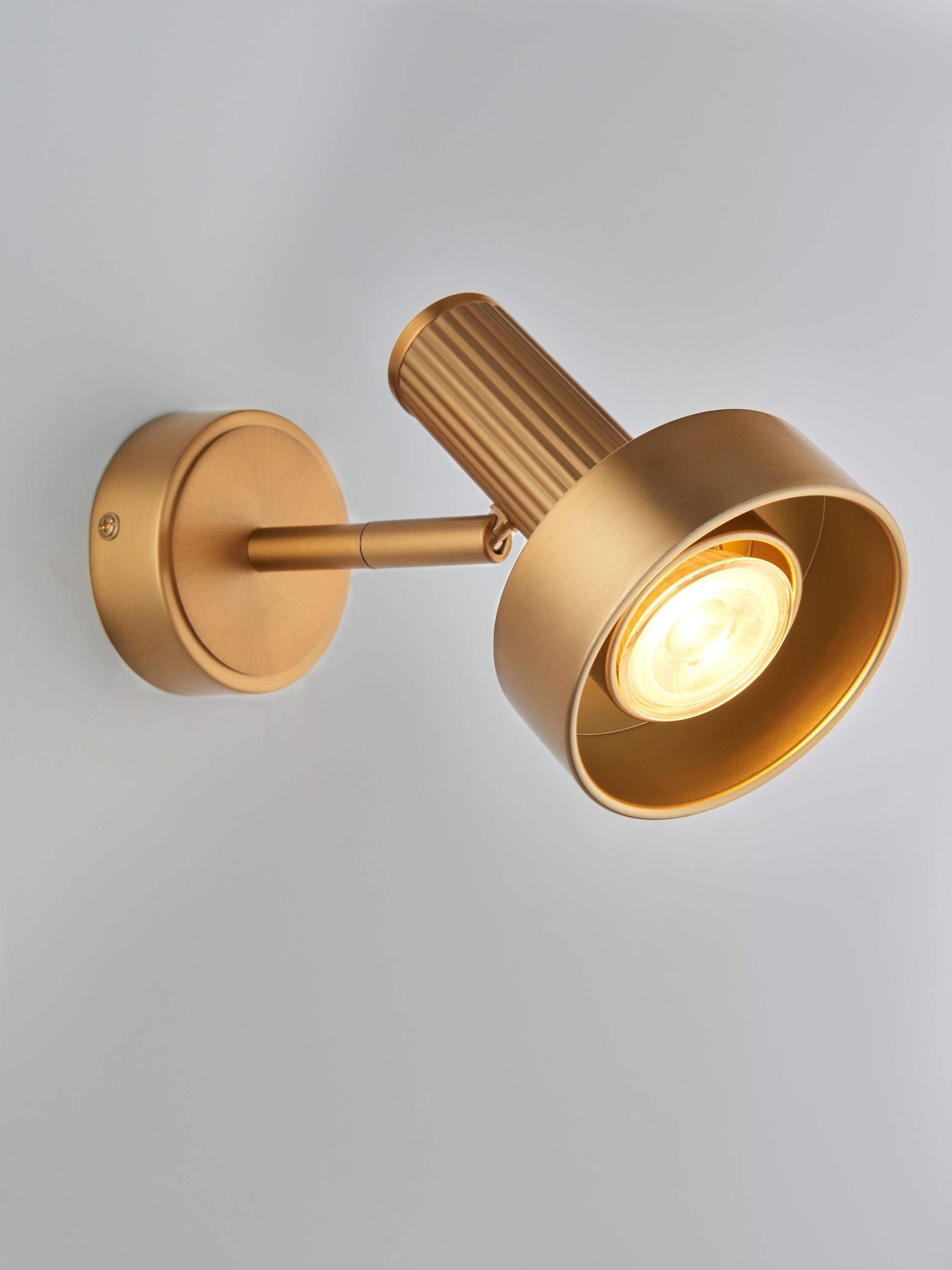 Modern, industrial wall light with a warm-toned luxury brass plating. Leighton provides bright, directional light without compromising on style. The use of a reeded cylinder on the back of the light adds texture and a stand-out detail.