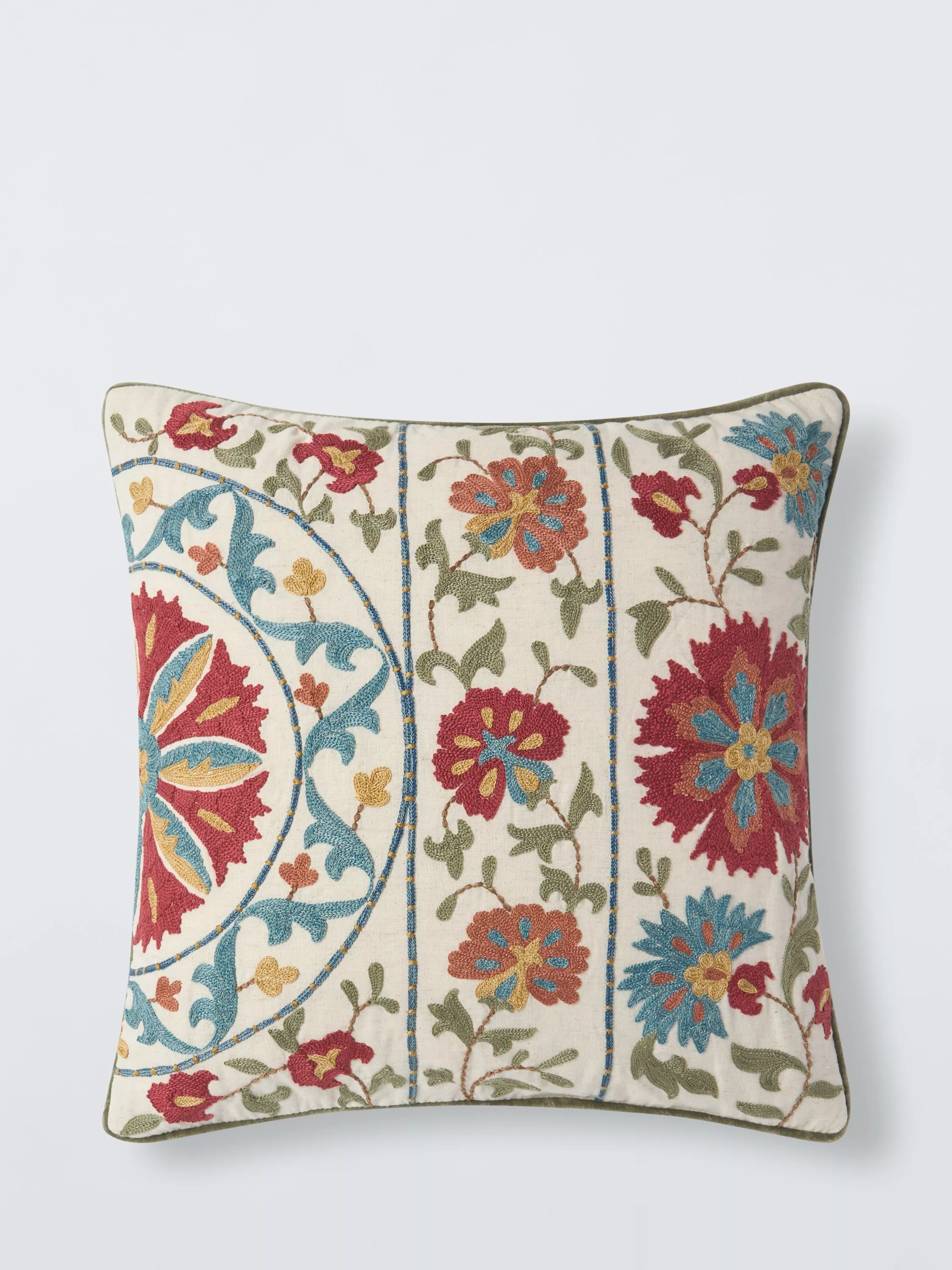 A beautiful and colourful chainstitched floral with a sage green velvet reverse.